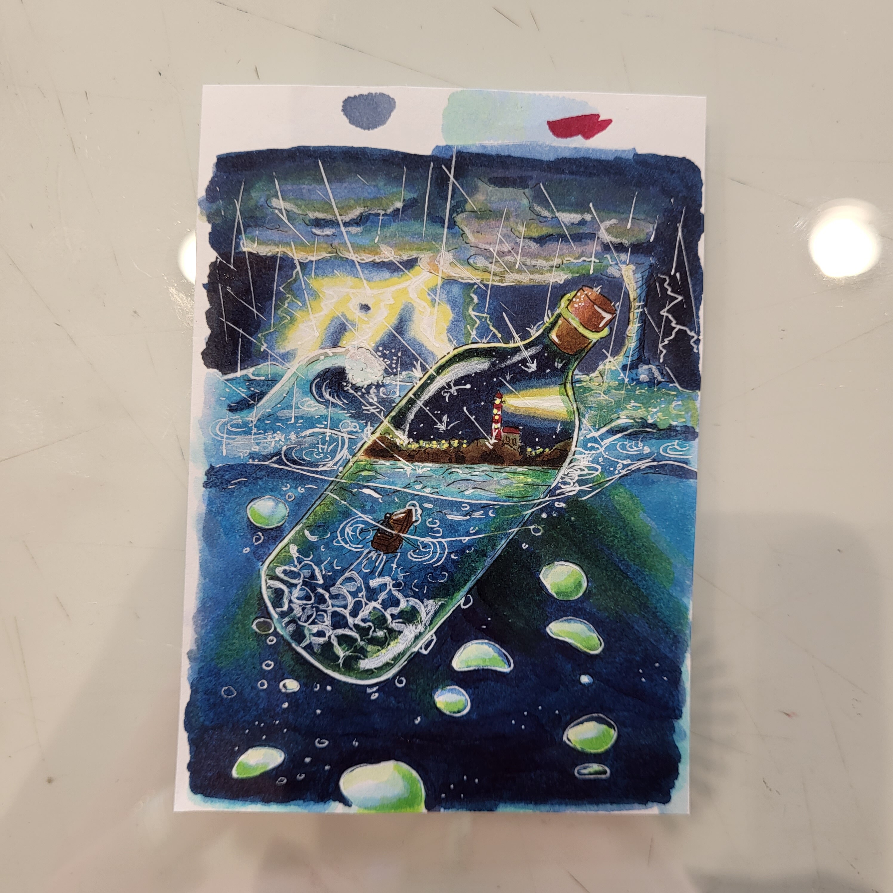 Bei Karte Nummer 3 bin ich bei der Grundierung. Um Tiefseestimmung zu erzeugen mache ich sie mit Poster Color auf schwarzem Papier. Heute wird sie garantiert nicht fertig und kommende Woche habe ich kaum Zeit, daher würde ich mir eine Woche Verlängerung wünschen. Zwei wären für mich nicht nötig.