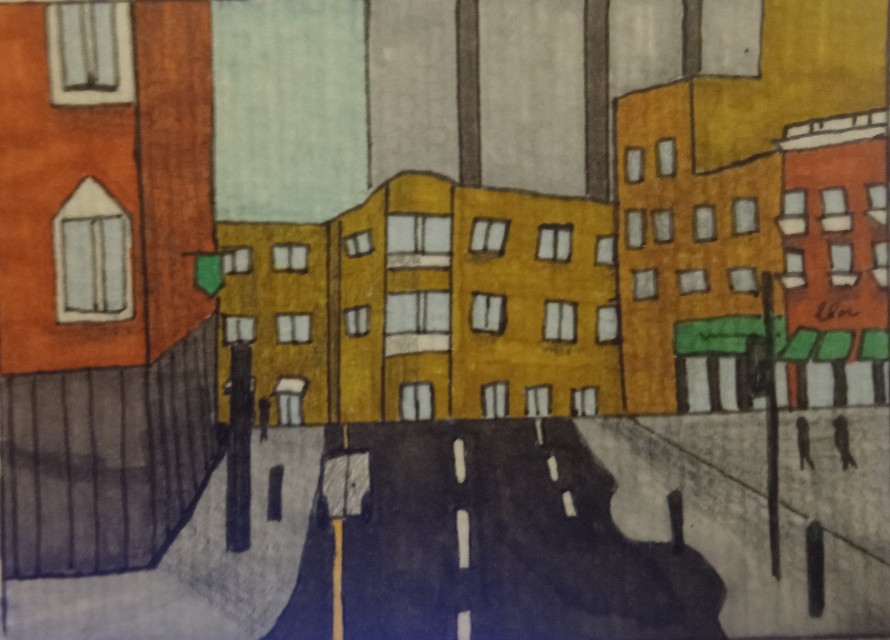 Ich habe mich an ihrem Wunsch einer Straßen Ansicht von London versucht. Ich war bisher nur ein Mal dort… Und habe gemerkt das Hohe Häuser auf kleine Einkaufsgassen stoßen. Daran hab ich mich soweit versucht :) Schatten sind mit dem Scan später noch stärker zu erkennen