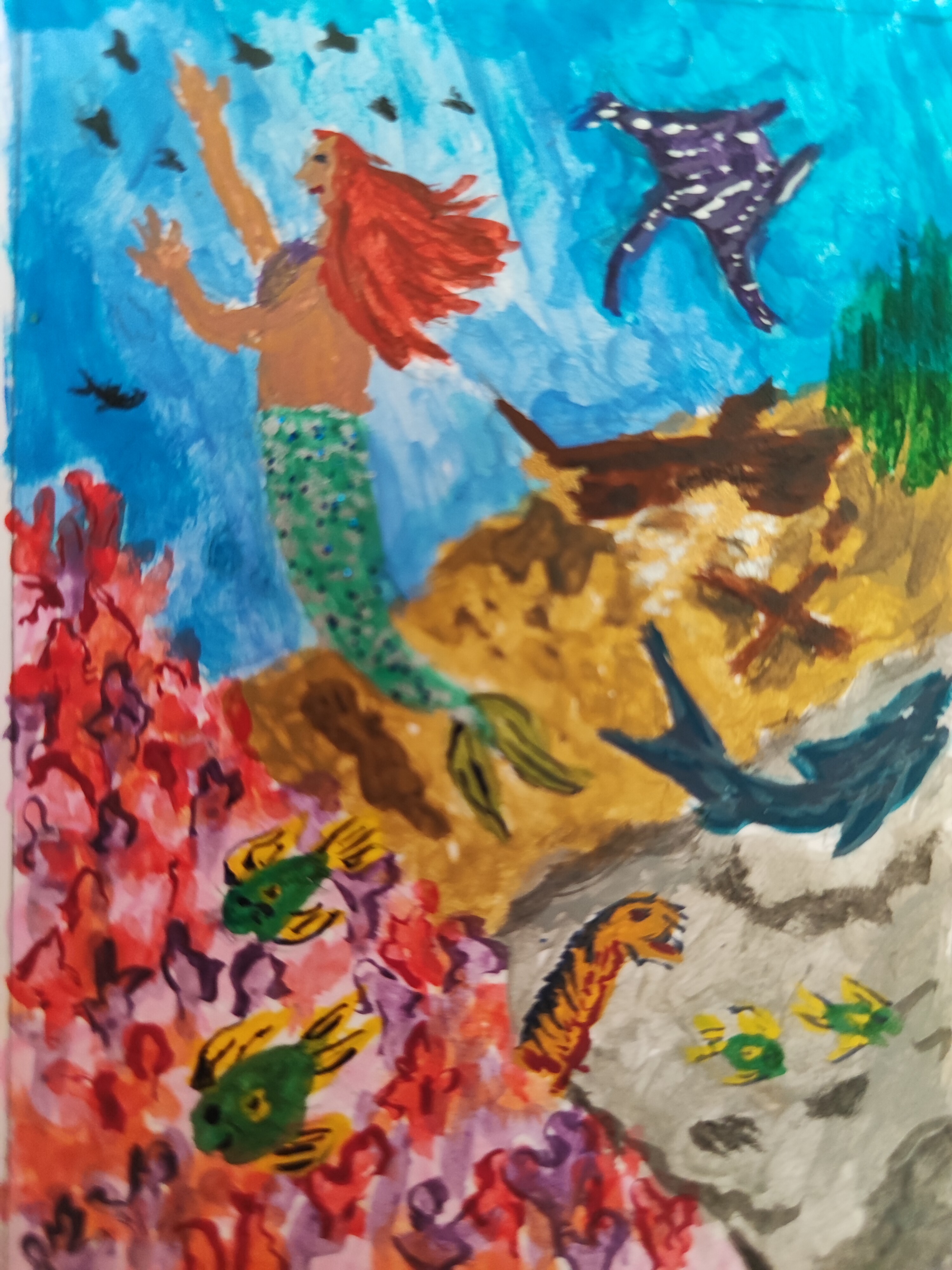 Eine Meerjungfrau/ein Meermann - am liebsten ein freundliches, helles Motiv. Bitte nur Meermensch mit Fischschweif, keine Kraken/Quallen/seepferdchen/usw. Schweife. Kann sehr gerne an echte tropische Fische inspiriert sein.