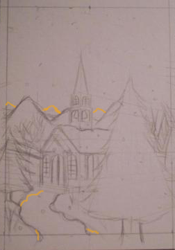 Karte: Um zu verdeutlichen, dass sich die Kirche weiter hinten als der Weg vorne befindet, könntest du den Weg hinden bei der Kirche noch etwas schmaler machen und vorne bis ganz an die Perspektivenlinie dran gehen. (Er wird zwar nach hinten hin schon schmaler, aber nur bis zur Kurve.) Was mir noch einfällt wäre eine zweite “Schicht” von Bergen, also dass du hinter den vorderen Bergen jeweils dazwischen noch mal 2 oder 3 kleinere Berge zeichnest, die du dann später heller als die vorderen colorierst, dadurch würde das Bild noch etwas mehr an Tiefe gewinnen. Da ich ziemlich doof bin was Beschreibungen angeht, hab ich dir einfach mal Linien eingezeichnet, wie ichs meine ^_^