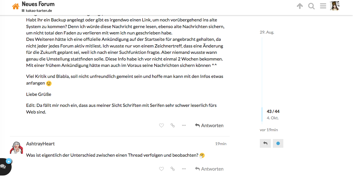 Finde die neue Ansicht allgemein ziemlich unübersichtlich auch weil die Forenbereiche jetzt nur noch durch diese winzigen farbigen Linien getrennt sind, ähnliches gilt ür die Postings mit winzigem Avatar und nur dieser Trennlinie mit allem in Grau und Grau, zusammen mit der Scrollfunktion fühlt es sich an als würde man nur durch einen einzigen Post gucken.