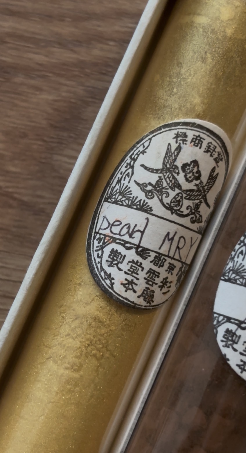 Nun hat mir Q-ni über die Jahre mehrere Pigmente (vor allem aus Japan) geschenkt und ich habe folgendes Kärtchen hauptsächlich mit Shinkko und einem weiteren Grünton bemalt. Der Dot hat dabei immerhin für das Kärtchen gereicht, viel ist aber nicht mehr übrig….