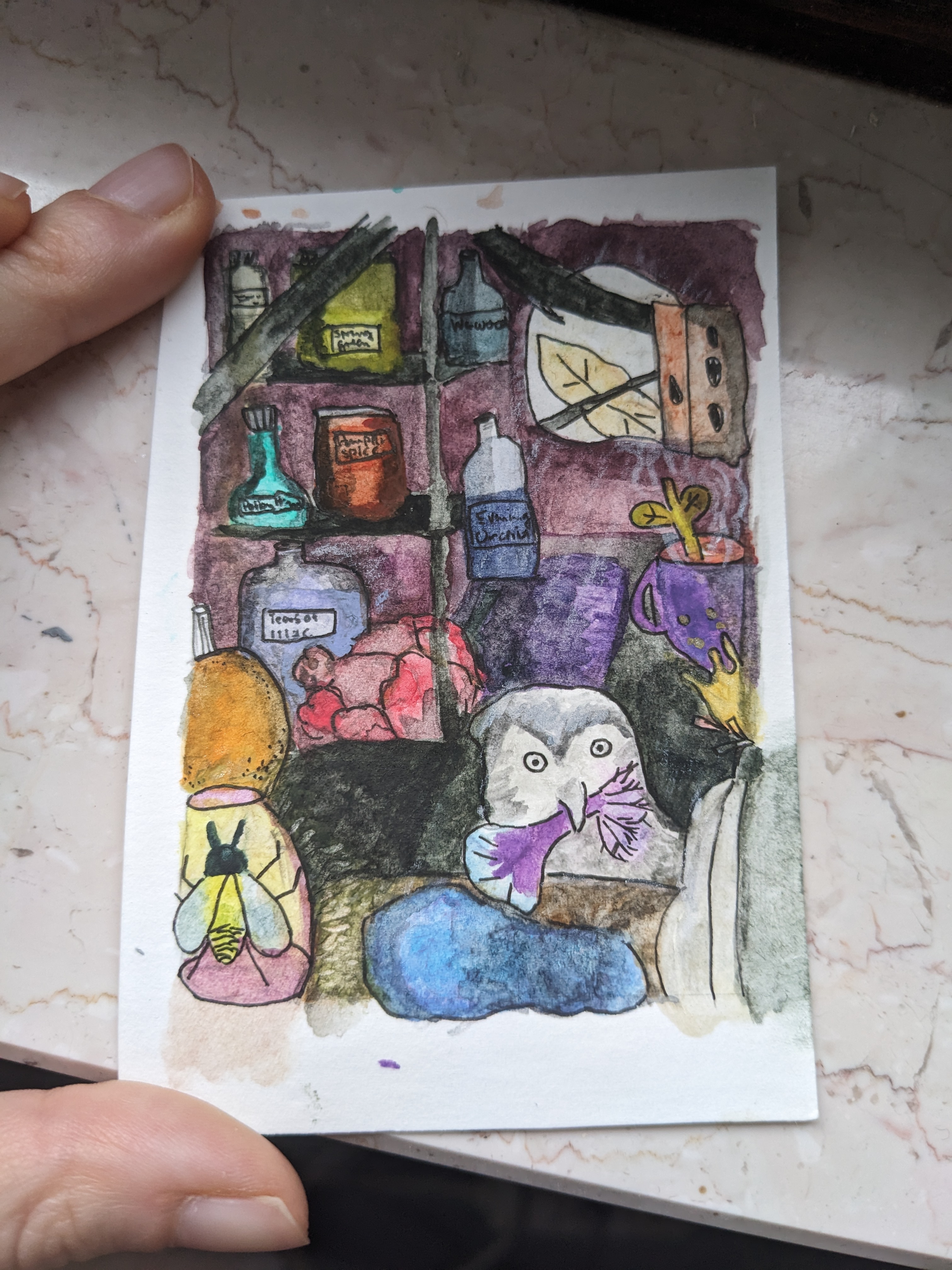Habe einen kleinen Drachen, der Farben selber herstellt, gezeichnet. Habe fast keine anderen Farben außer den Dots genutzt bei dieser Karte. Ich hatte nur am Anfang Angst, dass die Farben sich zu sehr vermischen würden und habe deswegen eine Schicht lila Aquarelle, die ich sonst nutze “vorgelegt”, aber am Ende haben sich beim Abdunkeln des Hintergrunds die Farben es zu einem Braun vermischt-_- Na ja werde es für die Zukunft besser wissen. Ich habe es versucht halbwegs erkennbar als Drachen darzustellen, hoffentlich hat es geklappt und die Karte wird dir gefallen:)