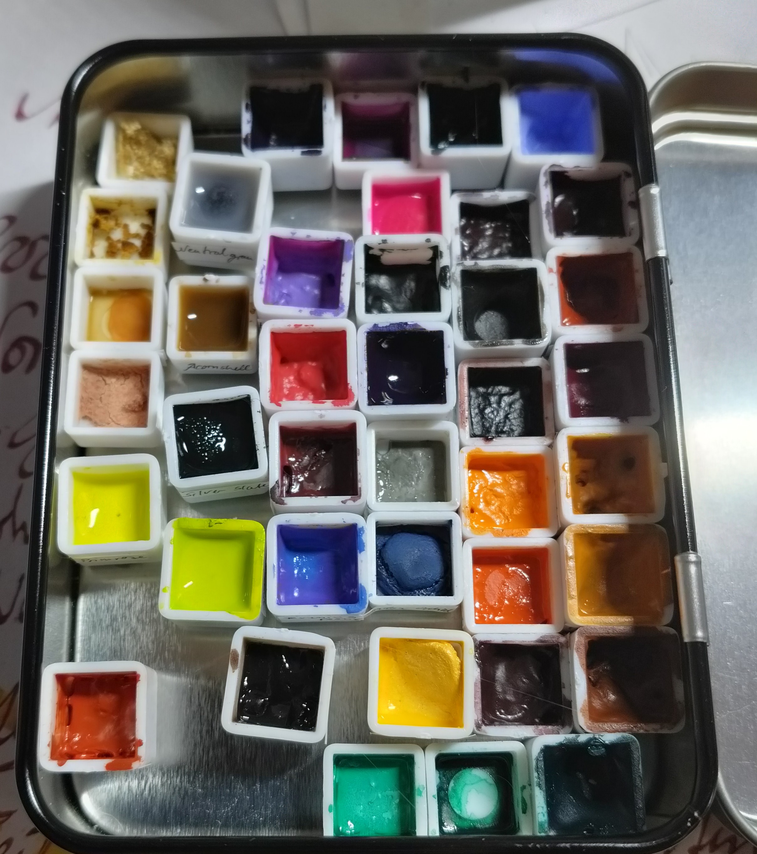 Hui, eine Aufbewahrungsmöglichkeit muss ich mir auch noch überlegen… Zum Umfüllen bin ich allerdings schlichtweg zu faul (XD), bzw. die Dots sind bei mir auch zu schnell aufgebraucht als dass sich dafür extra Näpfchen lohnen würden. (Ich hab eh akuten Näpfchenmangel.) Mal schauen was ich mache - aber ich vermute, ich werde die kleinen Papierstückchen einfach auf ein größeres Papier kleben, das ich dann bequem (evtl. mit Backpapier geschützt) in meinem Skizzenbuch eingeklemmt transportieren kann.