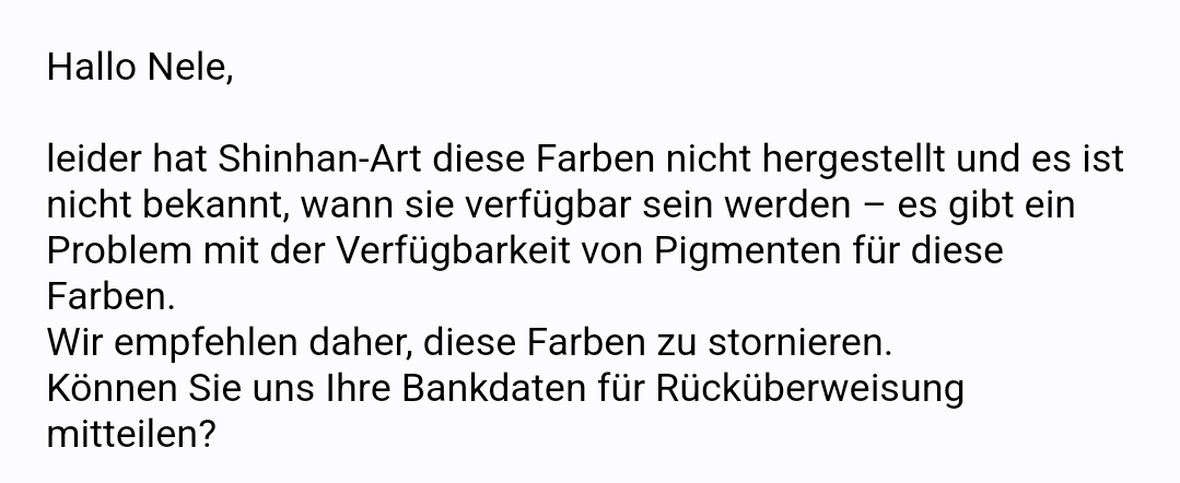 Update von Peters Art: Sie können mir leider nicht genau sagen, wann die fehlenden Farben geliefert werden können, melden sich aber schnellstmöglich, wenn sie ein Datum haben.