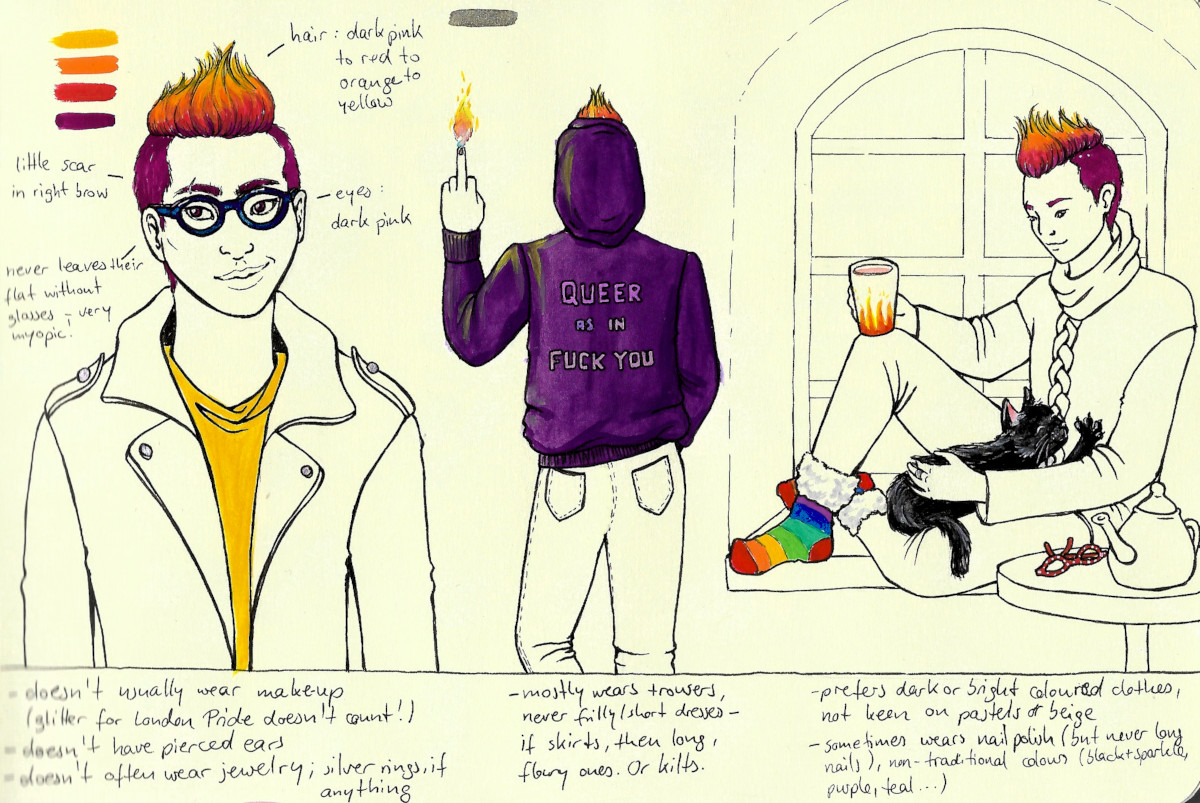 Lex ist nonbinär - ob sie bei Geburt als weiblich oder männlich identifiziert wurde, möchte ich nicht festlegen. Deshalb bitte ich darum, dass ihr Körperbau nicht explizite männliche oder weibliche Details eingebaut bekommt (Brüste, extrem breite Hüfte, Tennissocke in der Hose…) .