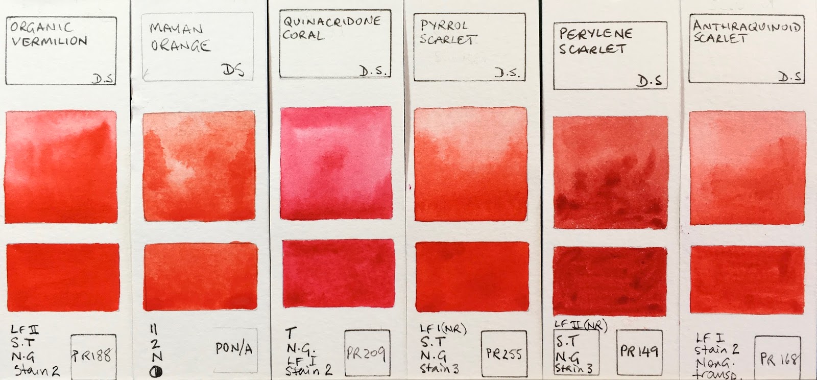 Also ein warmes/orangiges Rot, transparent also recht dunkel im Masstone/Körper. Mischt auch schönes Braun.
