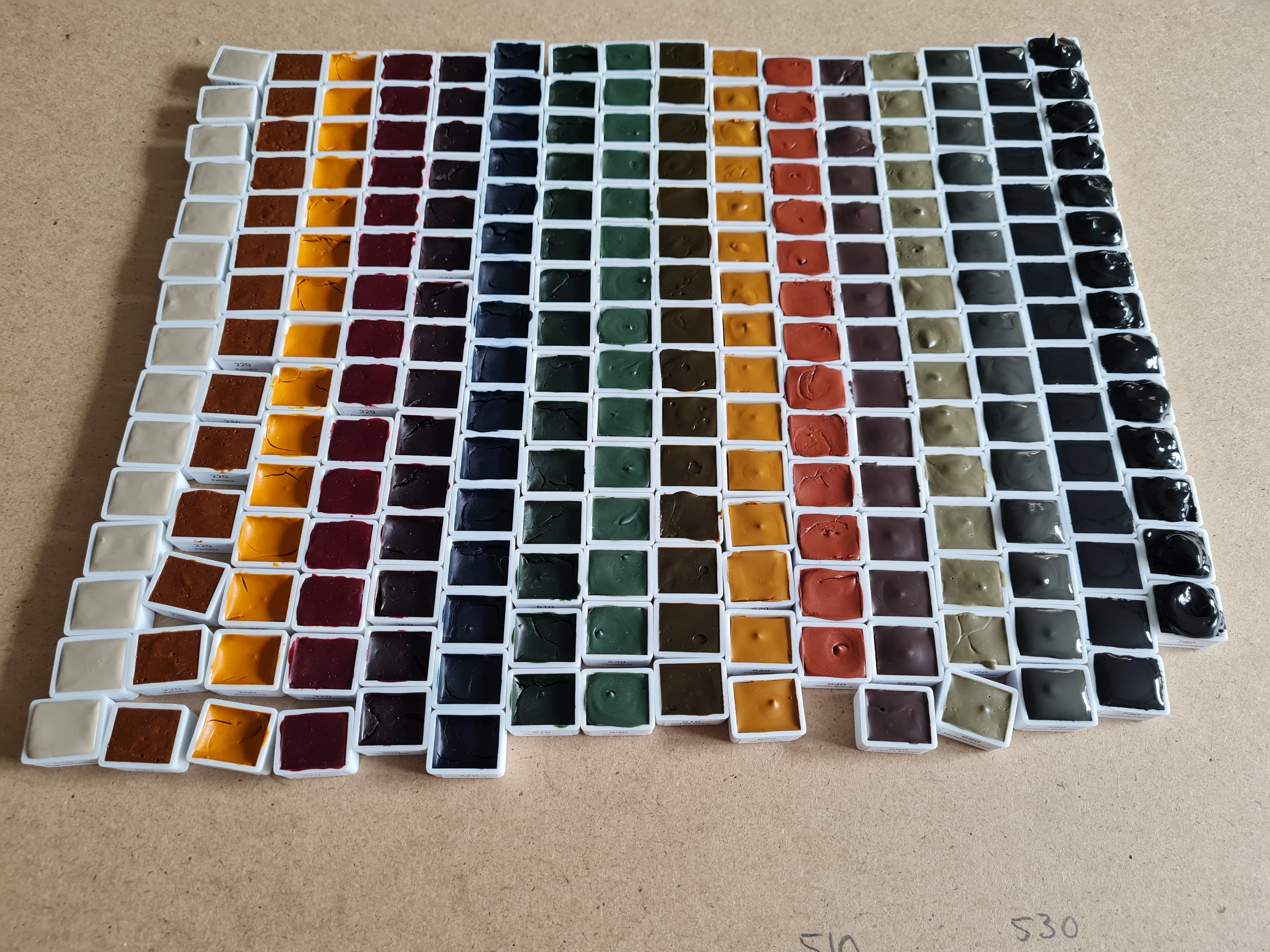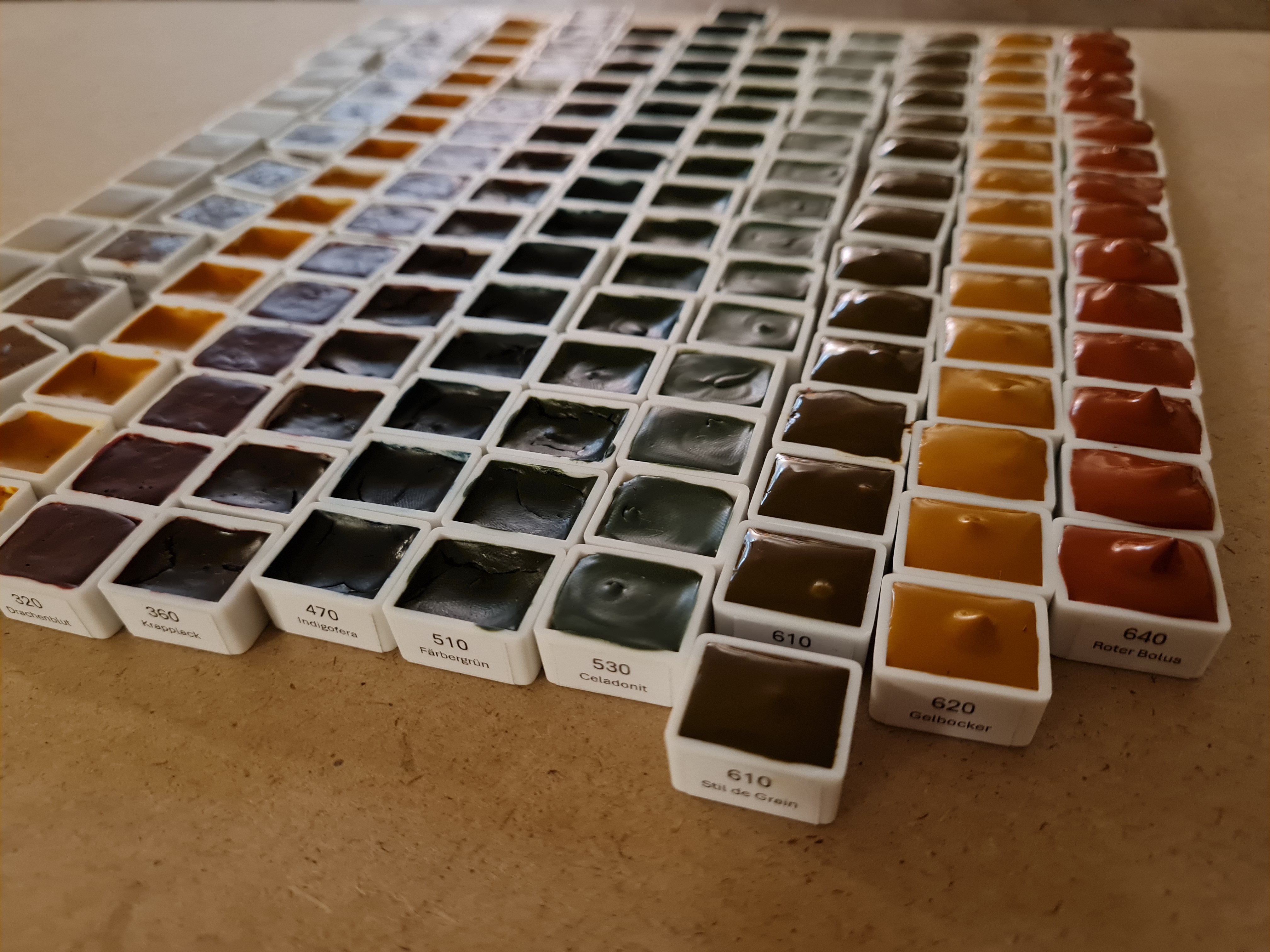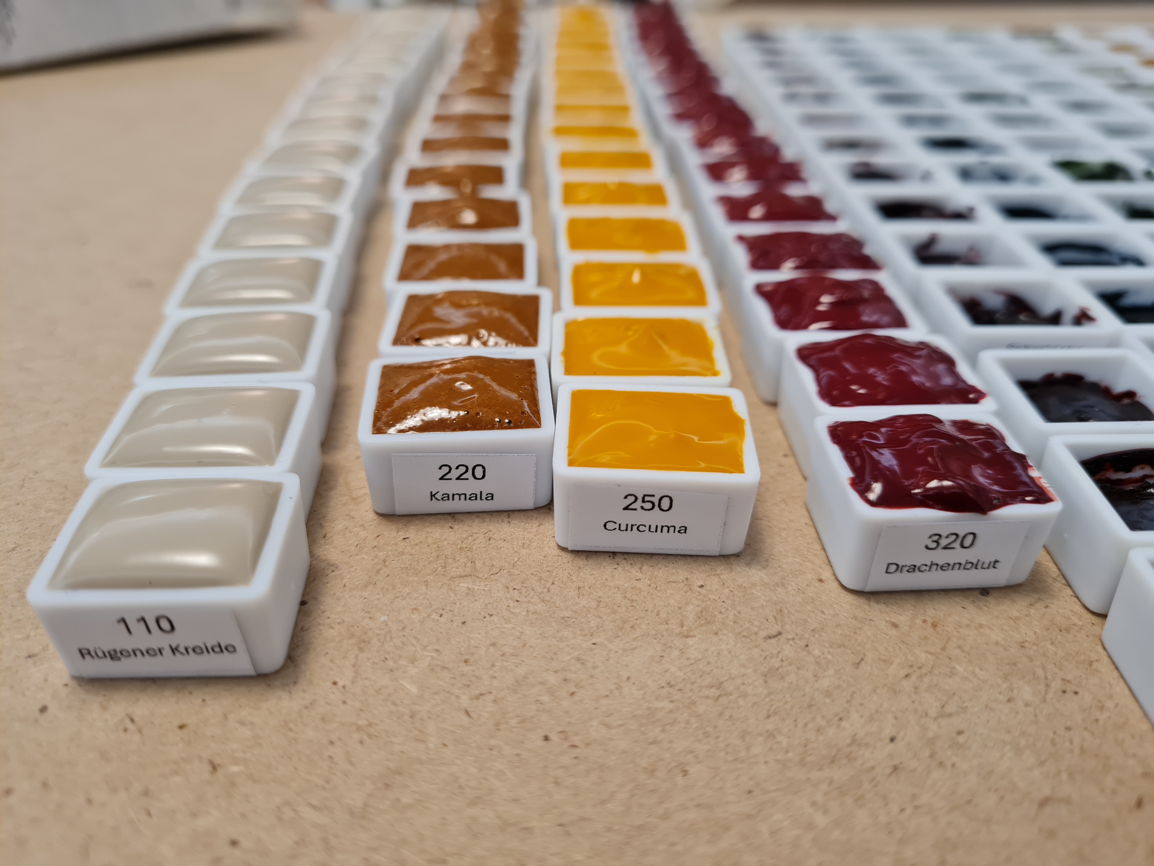 Gestern Abend hatte ich zwar nicht genug Zeit, um alle Näpfchen fertig aufzustocken, aber die ersten 4 Farben wurden jetzt fertig verteilt und warten auf ihre finale Trocknung.