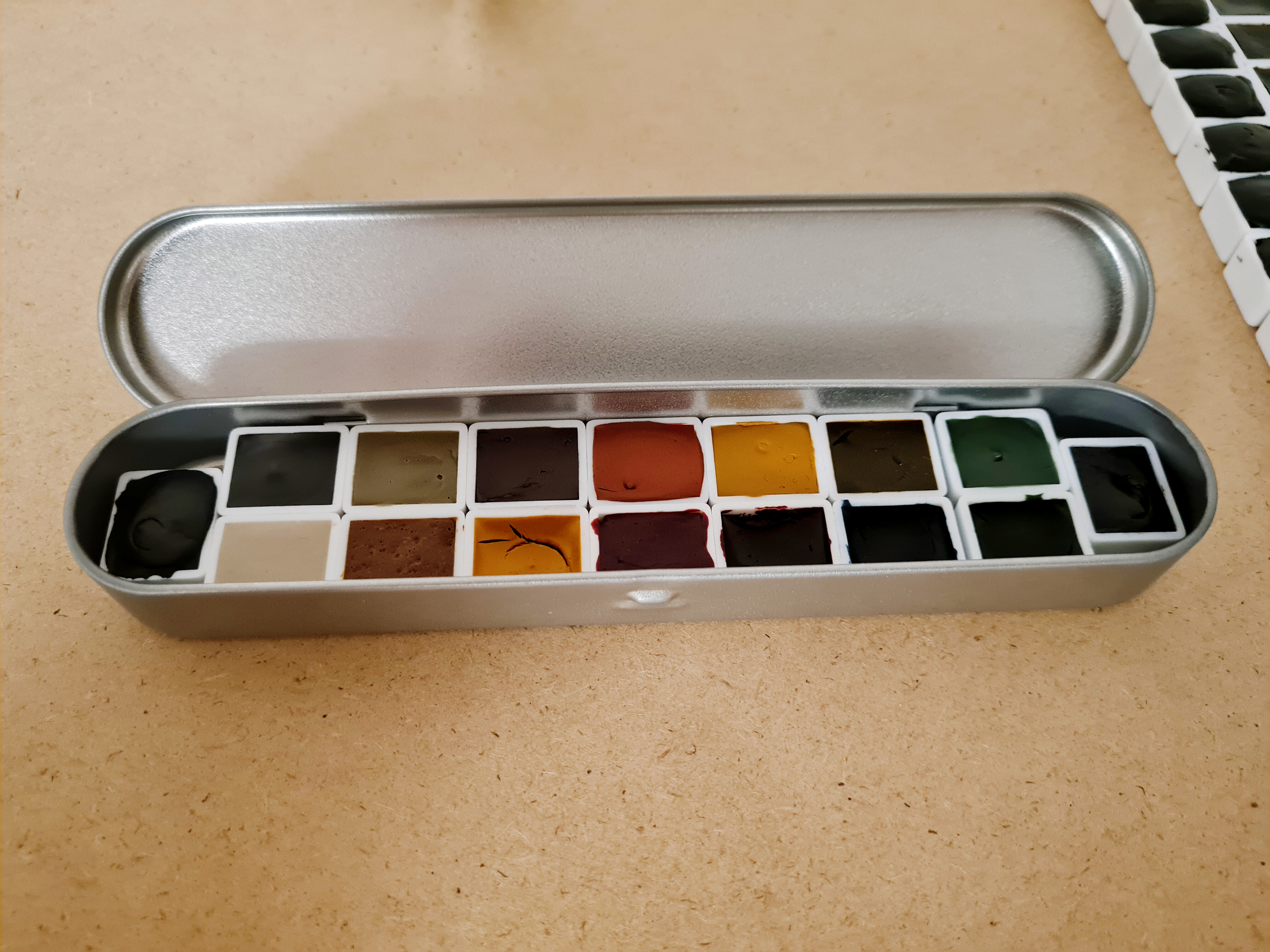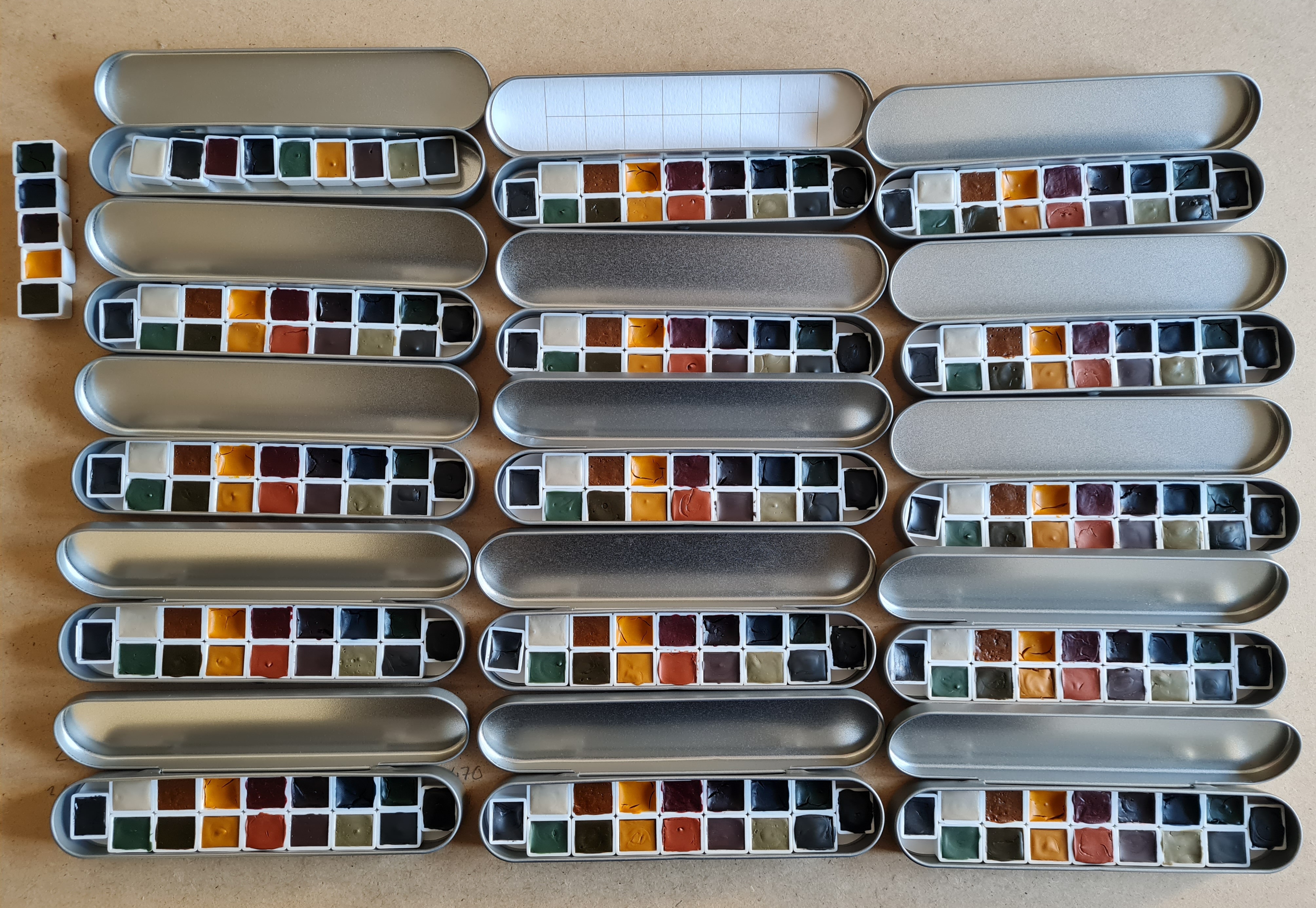 Bald geschafft! Ich habe die letzten Abende je 1-4 Farben fertig verteilt, jetzt fehlen noch 3 Farben. Das oben schlüssig verteilen ist zeitintensiver als gedacht, bis wirklich jedes Eckchen von jedem Näpfchen mit Farbe gefüllt ist. Ich hoffe, ich schaffe die letzten drei Farben morgen Abend!