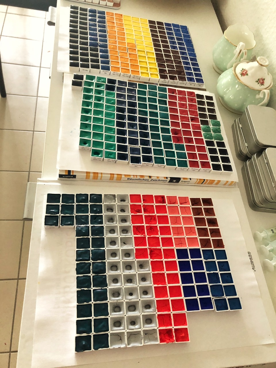 Und die ersten Farben sind auch abgefüllt und einige sind in Schicht 1 schon fast so trocken, dass Schicht 2 kommen soll. Aber damit warte ich auf die anderen Sets in der Hoffnung, mir Spritzenwaschzeit sparen zu können. Erst mal mit den anderen weitermachen.