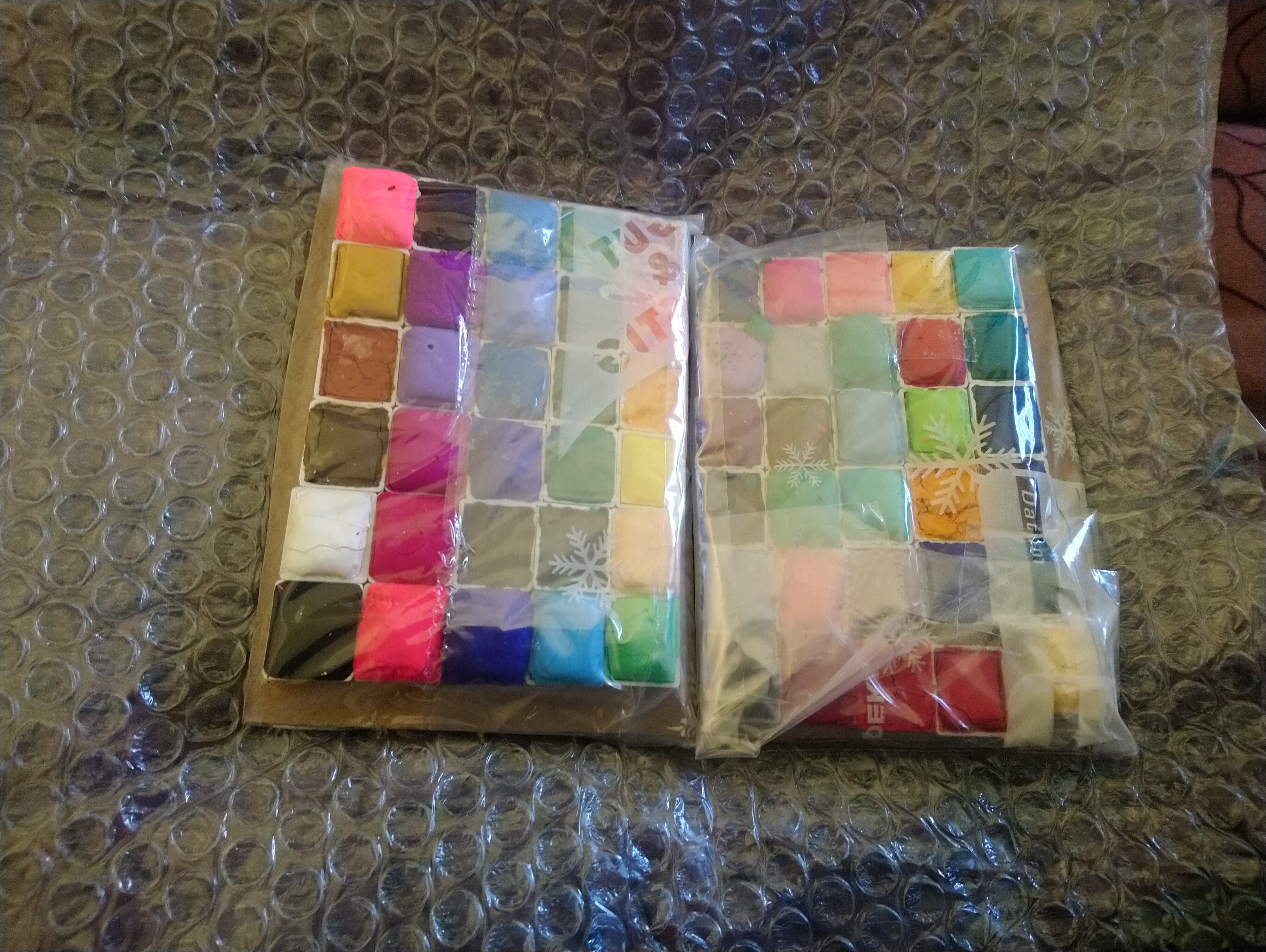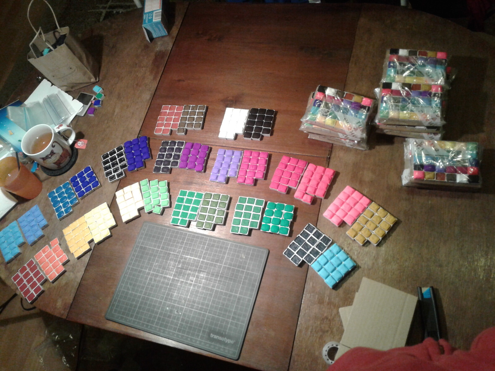 Wie man sieht, sind sie auch größtenteils heile bei mir angekommen. Eine Farbe scheint einfach so bröselig zu sein (ich meine mich zu erinnern, das Major eine Farbe ziemlich verflucht hat?), und bei einer anderen ist das Muffintop (?) sauber abgebrochen und hat sich lustig im Tütchen verteilt, aber das ist nichts, was ein bisschen Wasser und Puzzeln nicht wieder hinkriegen würden.