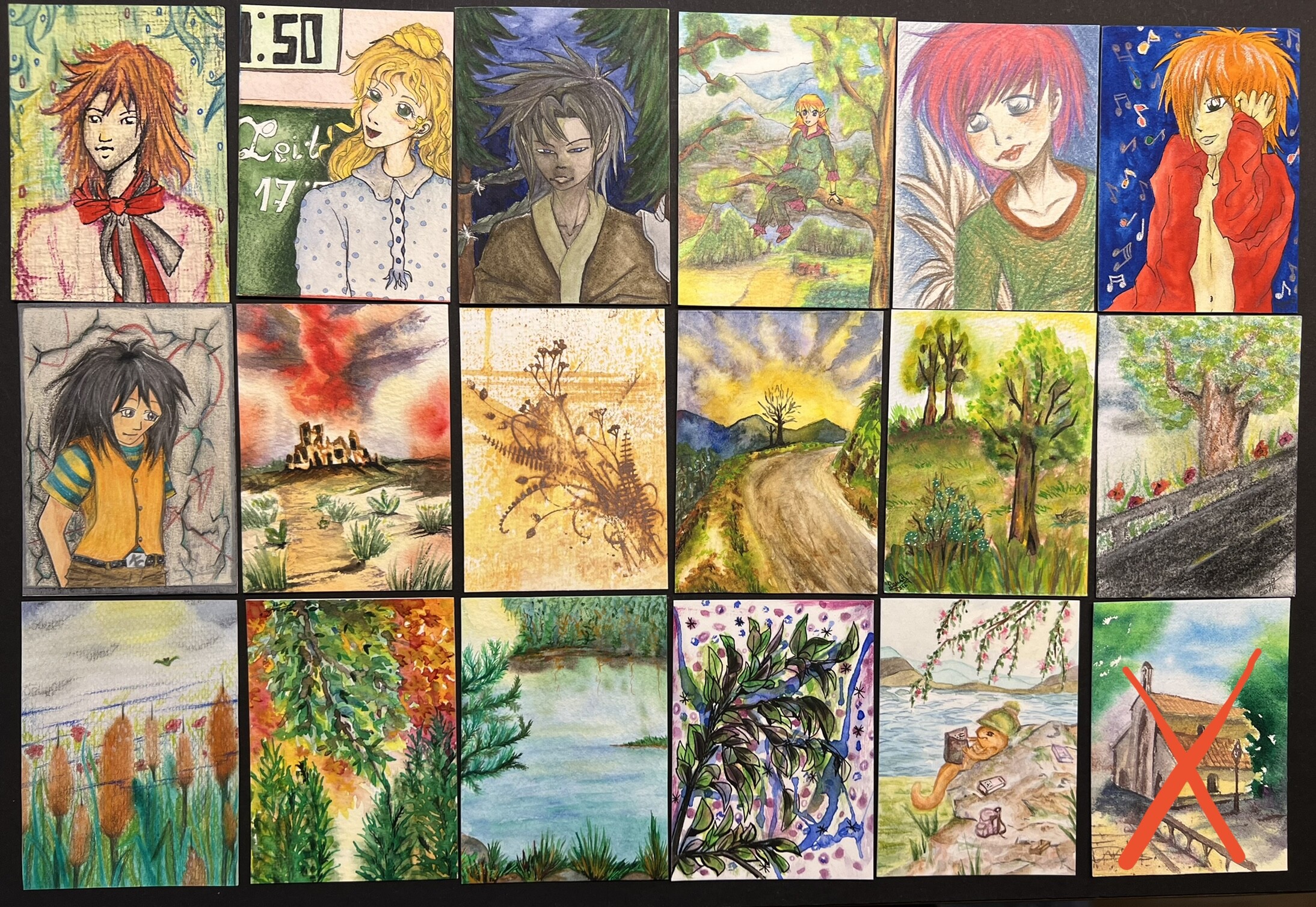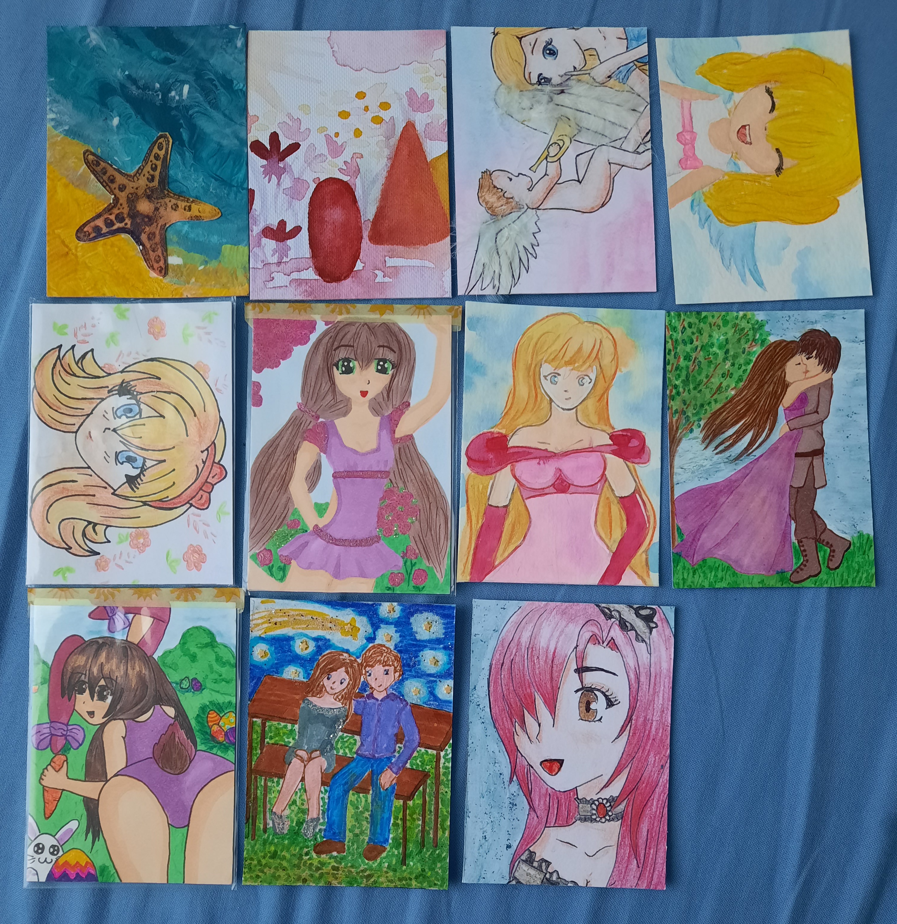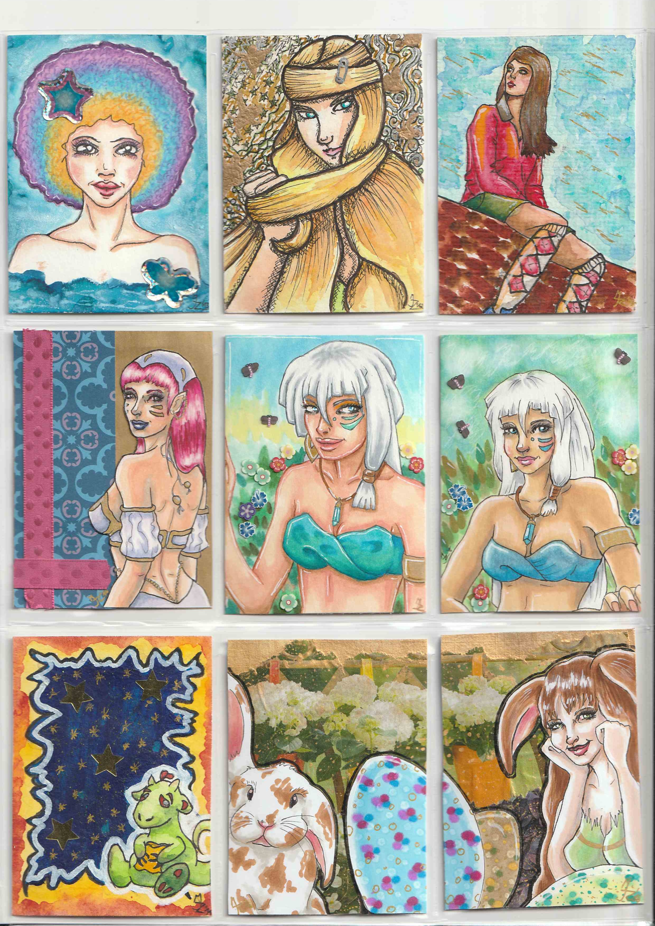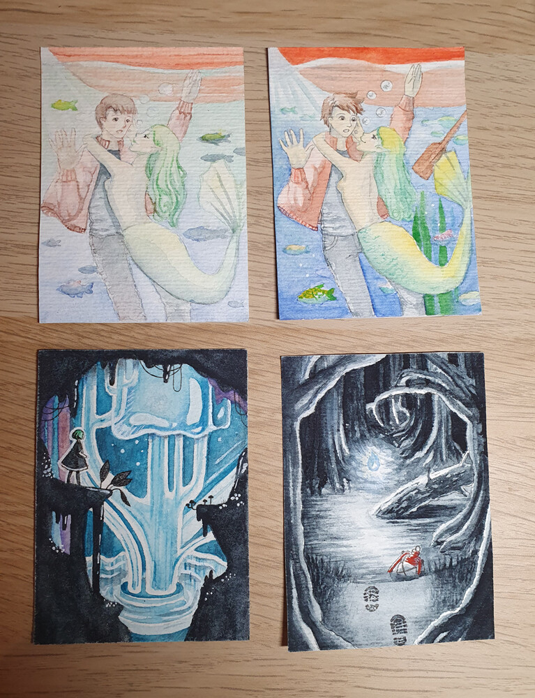 Ich habe auch ein paar Karten, mit deren Umsetzung ich nicht so zufrieden war, weshalb sie es nie in meine Galerie geschafft haben. Von allen Karten gibt es aber eine neuere Version, die wiederum in meiner Galerie zu finden ist (es sind dort also sehr Àhnliche zu sehen). Die mit der Meerjungfrau habe ich sogar 3x gemalt, bis ich zufrieden war, weshalb hier jetzt 2 zu haben sind^^