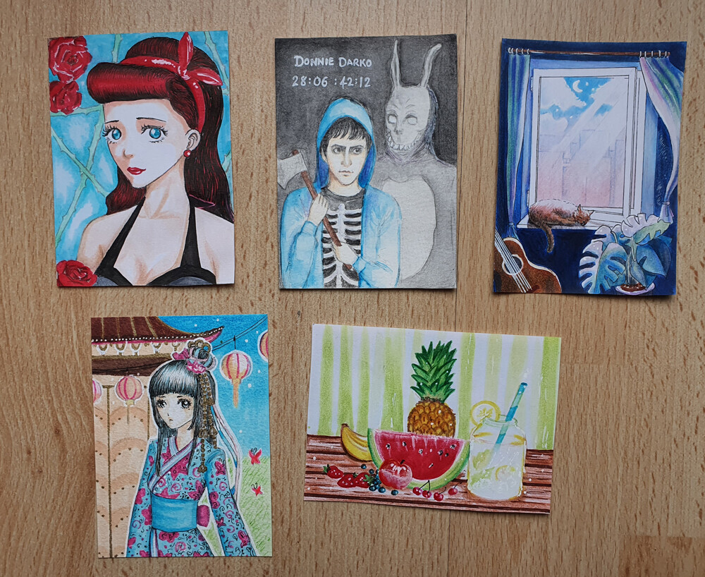 Die Karte oben in der Mitte ist ein Fanart zu Donnie Darko (wie man vllt am Titel sieht^^), ist noch von 2014. Hatte eigentlich damals einen Tauschpartner auf Animexx, der sich nie wieder gemeldet hat.