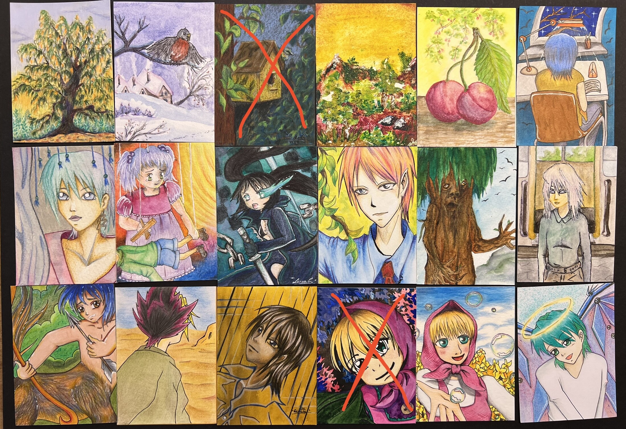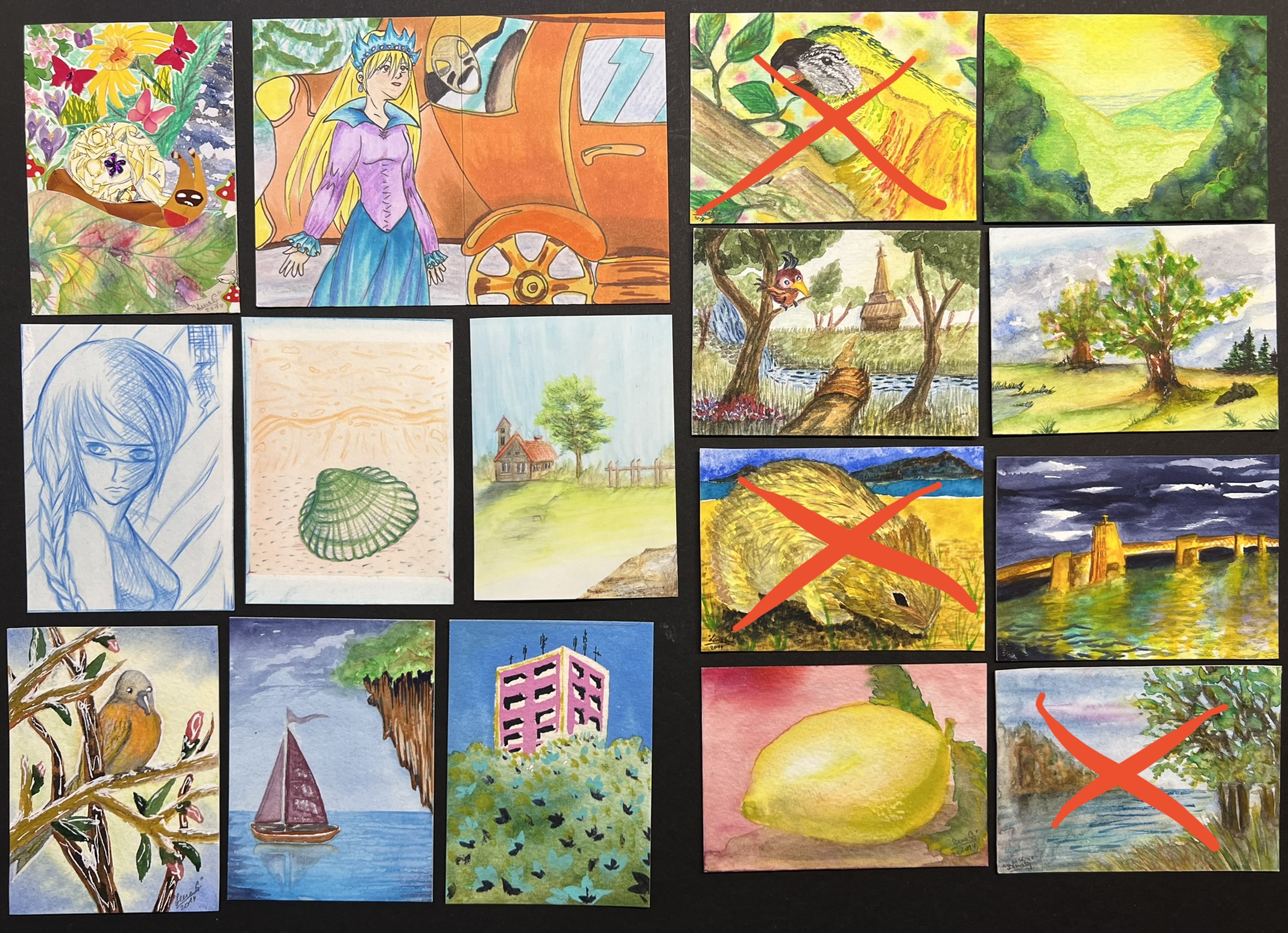 Die Karten oben links (MĂ€dchen) und unten rechts (FrĂŒchte) habe ich nie hochgeladen, weil ich bei der Umsetzung nicht so zufrieden war. Ich weiĂ leider nicht mehr genau, wann ich diese gemalt habe. Ich vermute aber, dass die erste von 2014 ist und untere von 2017