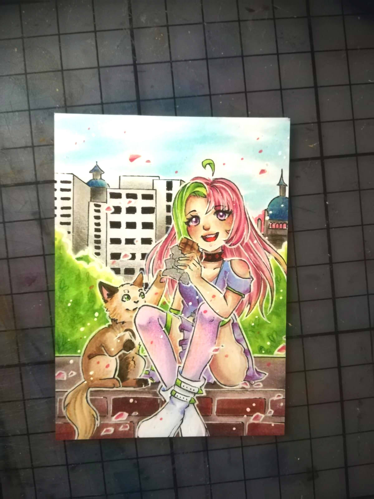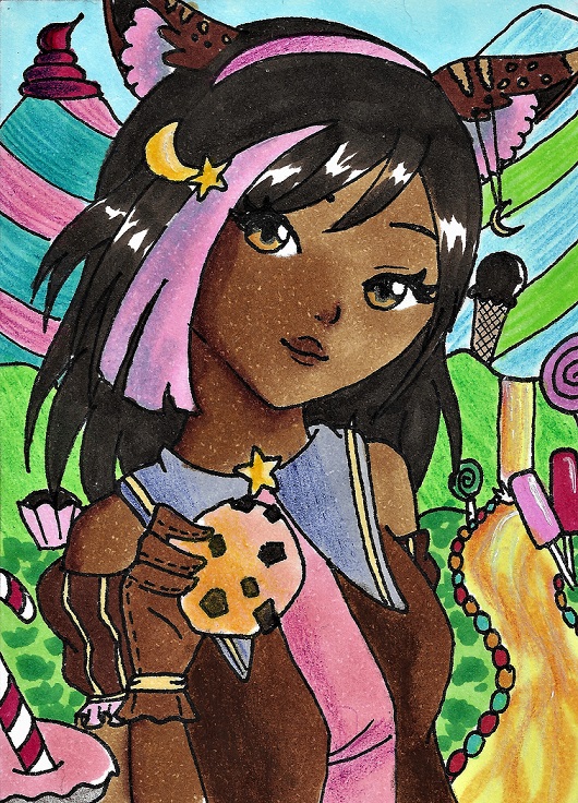 Hauptmotiv ist dieser OC, habe aber auch noch den Wunsch Katze miteingearbeitet. Das Silberpapier der Schokolade ist mit glänzender silberner Tinte gemacht.