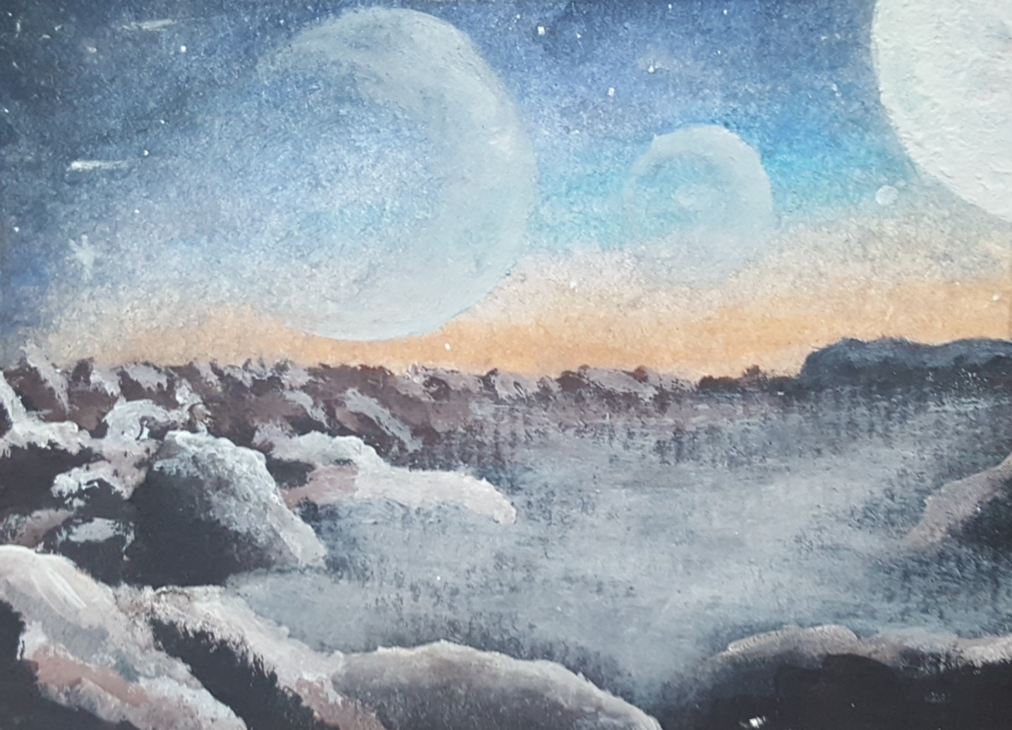 Das war eine gute Gelegenheit, Landschaften zu üben. Die Aussicht von einem nicht-irdischen Planeten, solche Motive mag ich sehr. Ich hatte hier zwar einen groben Plan, aber die Umsetzung geschah dann doch relativ aus Gefühl. Ich bin ziemlich zufrieden mit dem Ergebnis und hoffe, dass…