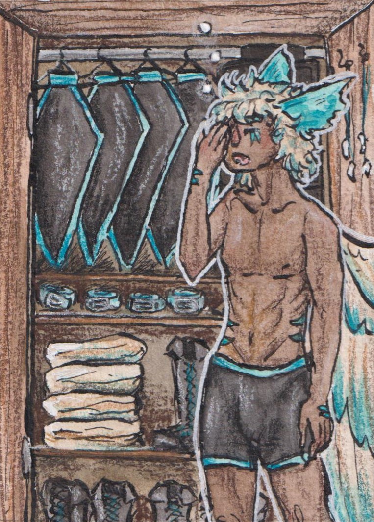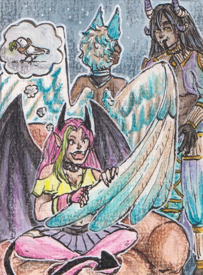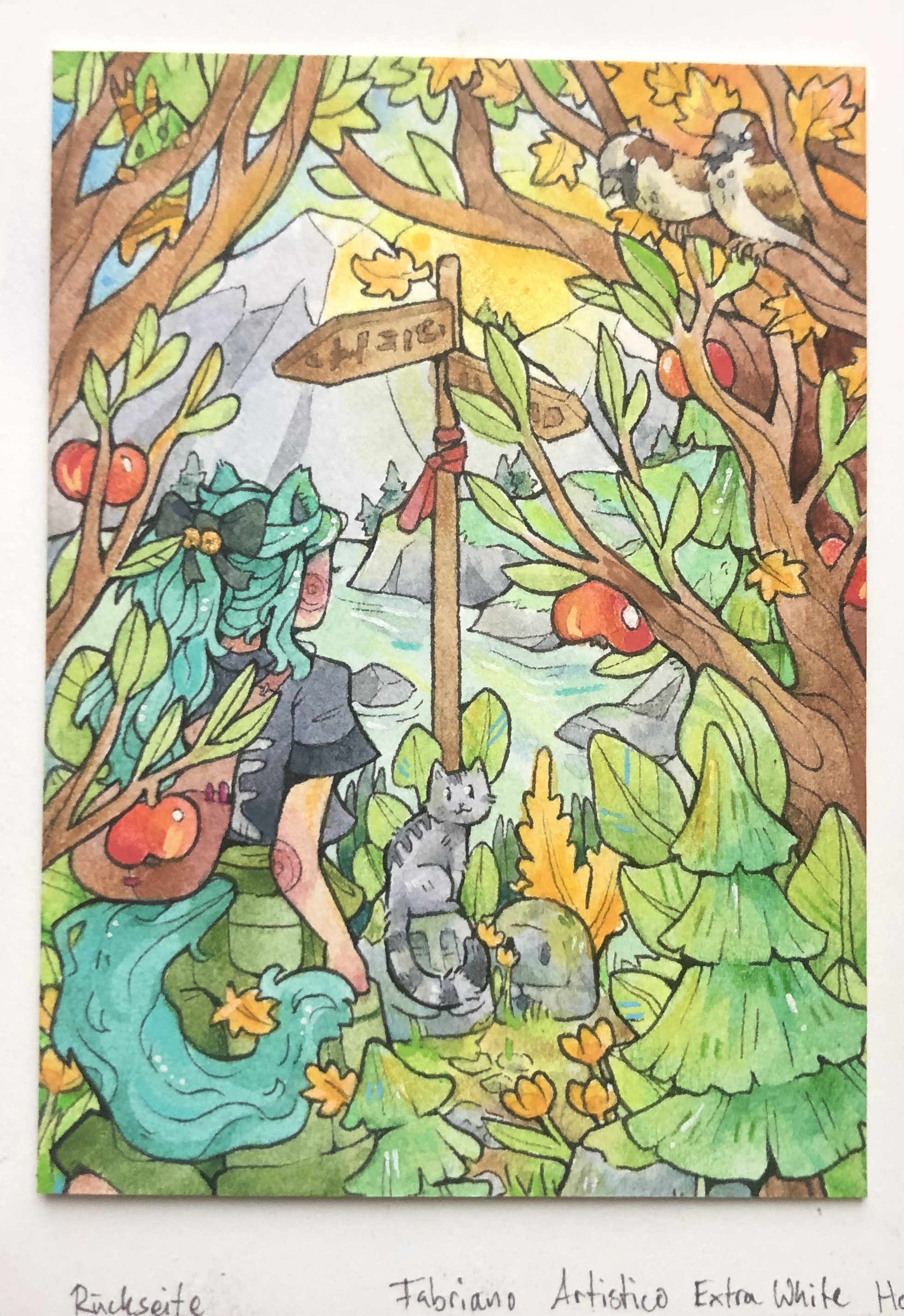ich habe mich an einem vermenschlichten Blaukehlchen versucht :) Der Wunsch “einheimische Singvögel - gern auch vermenschlicht” hat mich sofort angesprochen. Ich musste dann an einen Opernsänger denken und der ist es auch geworden. Ich hoffe man erkennt, dass es ein Blaukehlchen sein soll. Ich weiß, deren Flügel sind eigentlich nicht blau, aber mir war zu wenig blau auf der Karte. :'D