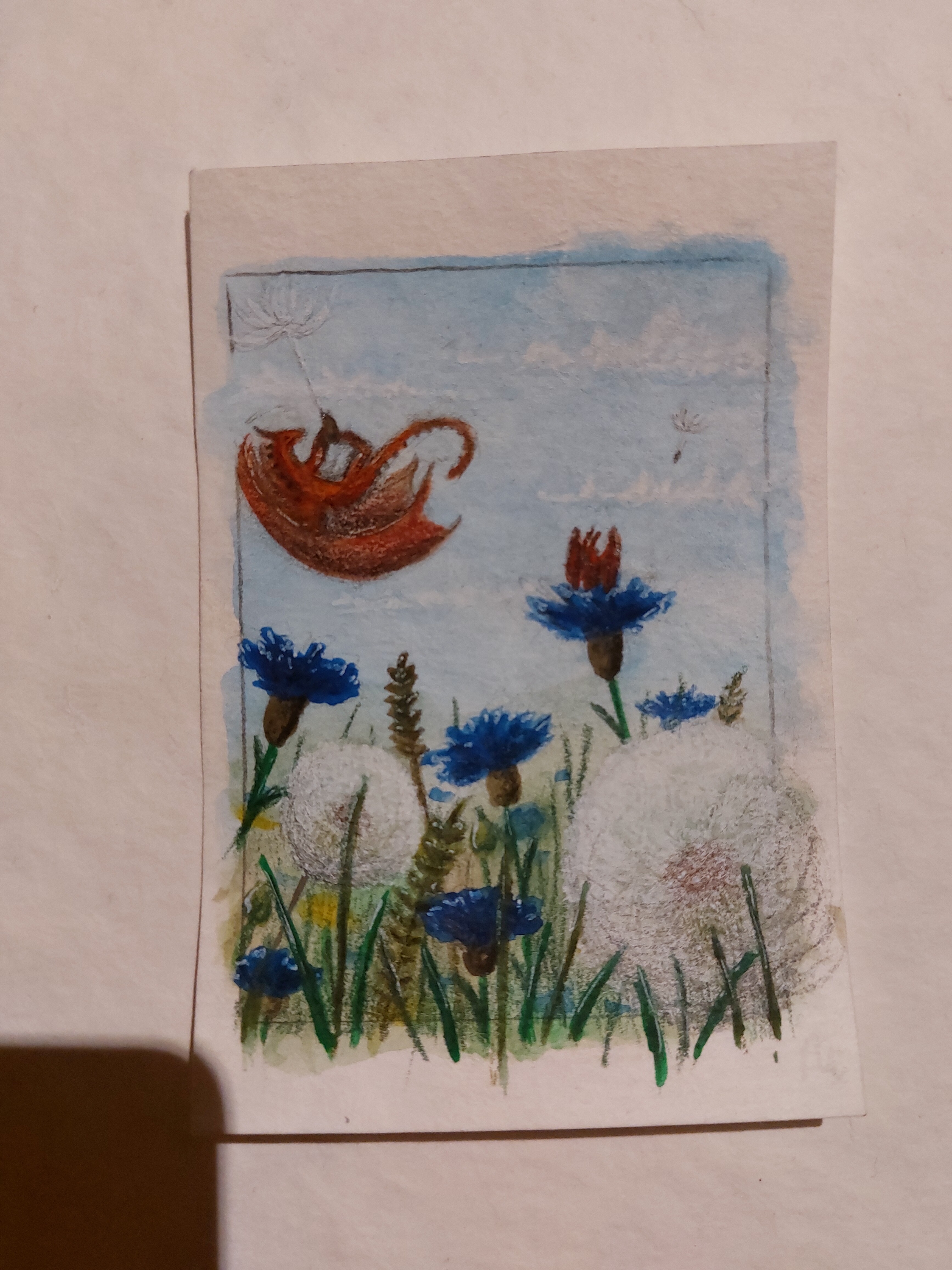 Awww, wie niedlich, ich werd nicht mehr! So ein schönes Motiv, die Idee dass er an dem Samen hängt und herumwirbelt ist voll süß. Und der Löwenzahn sieht so weich aus… Na klar gefällt sie mir, man sieht überhaupt nicht, dass du sowas normalerweise nicht malst •^•