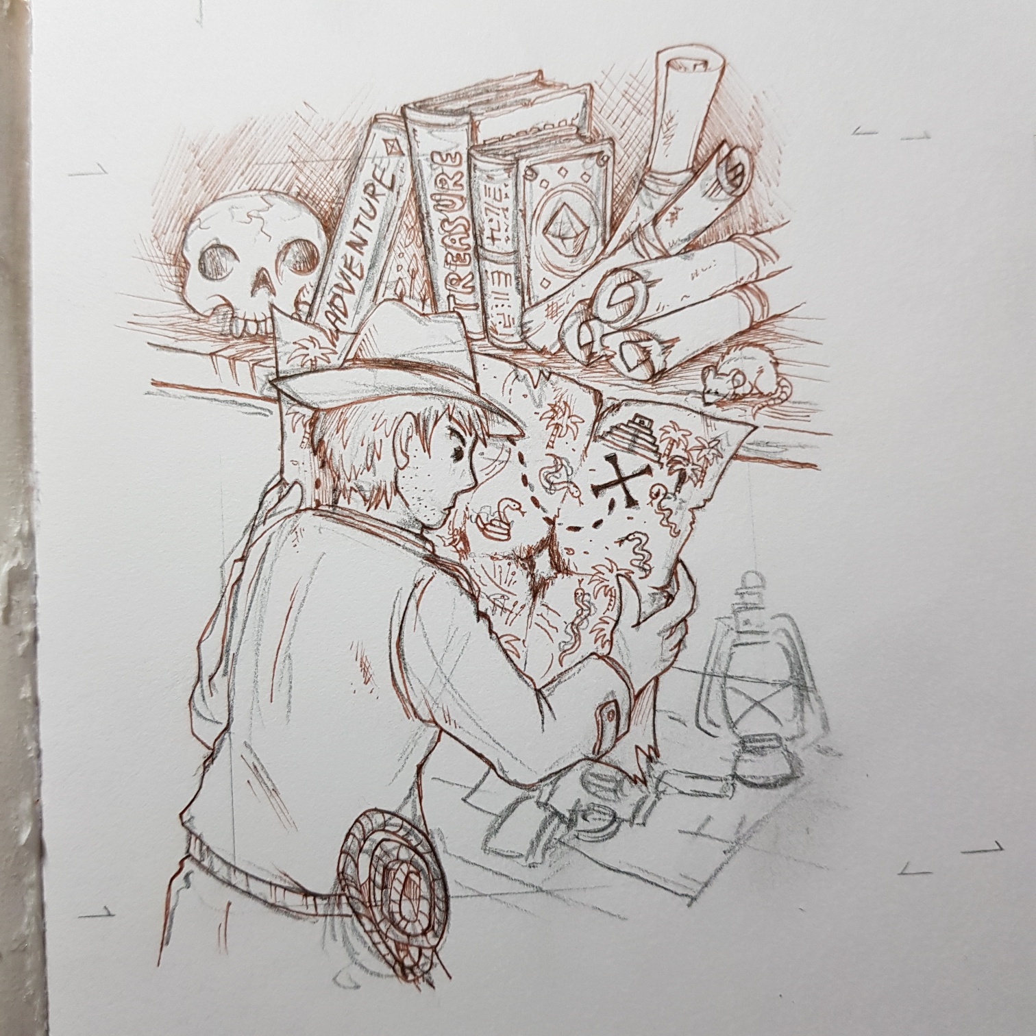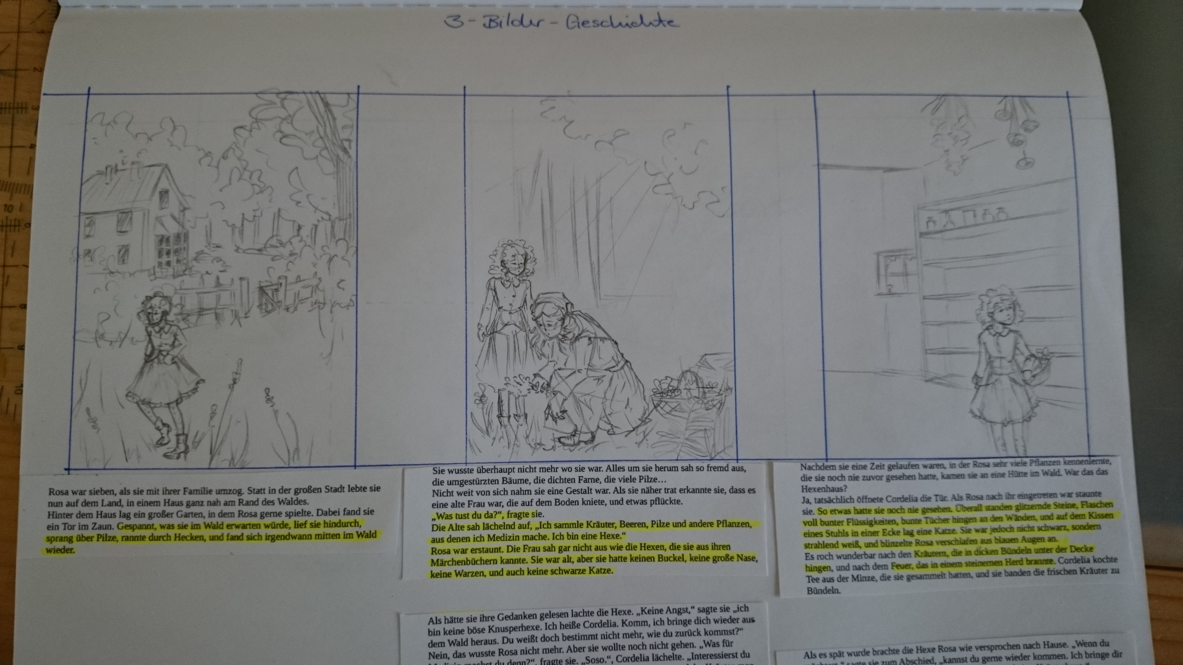 Wobei ich mir noch nicht ganz sicher bin, ob die dritte Karte so bleibt, oder ob ich nicht lieber Rosa und Cordelia am Tisch beim Kräuter zusammenbinden zeichne… Rosas Pose in der Skizze stört mich noch etwas.