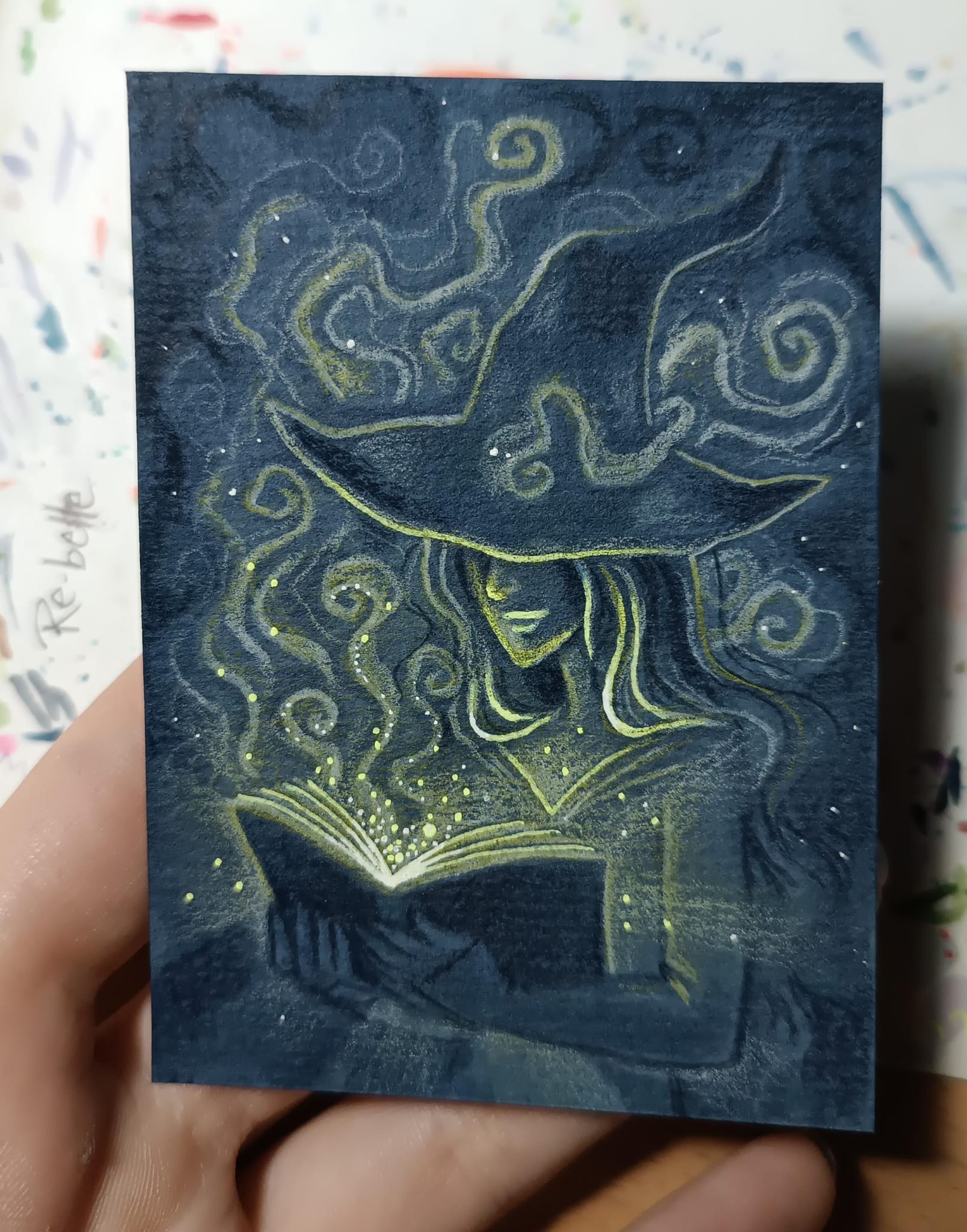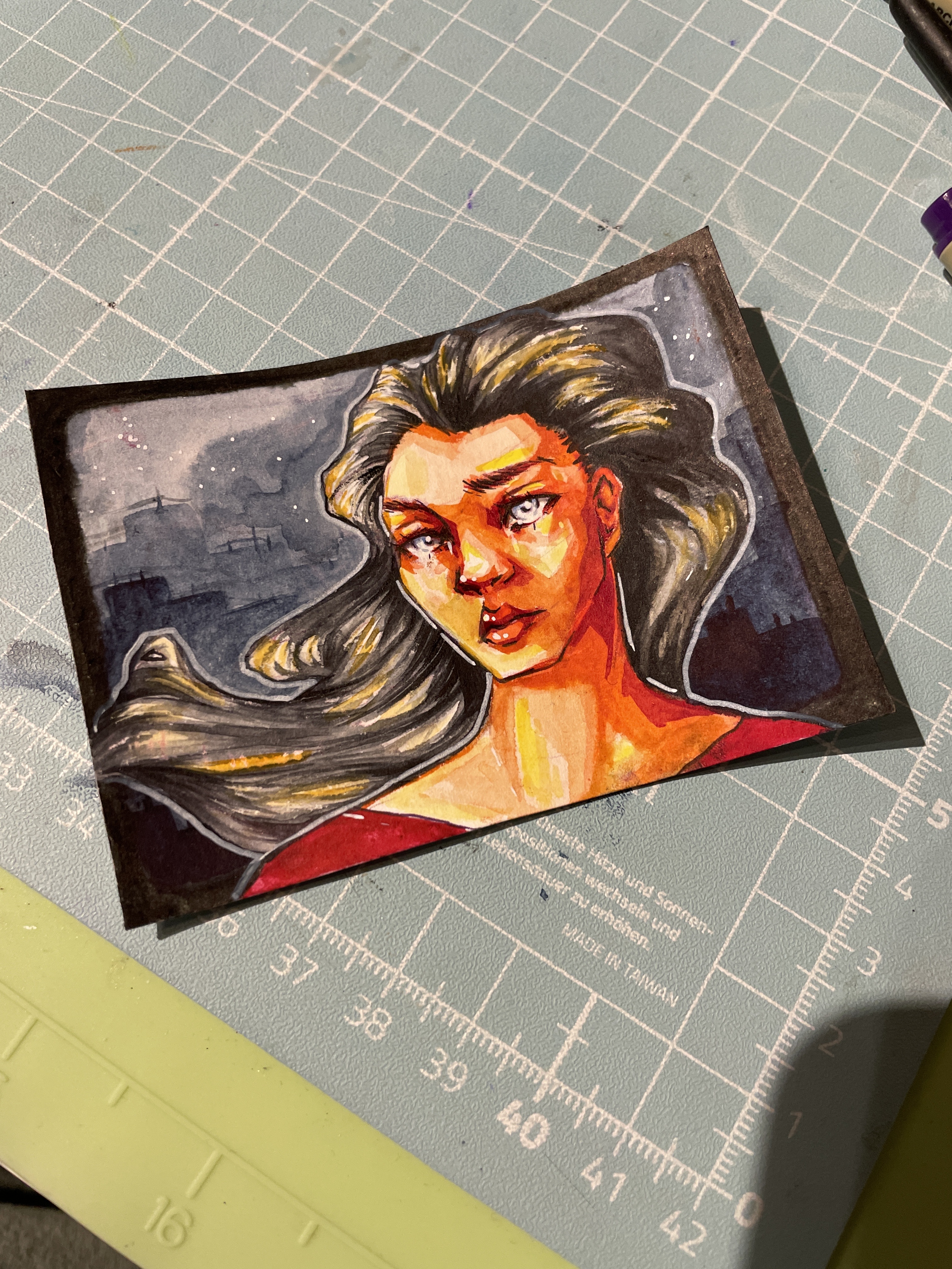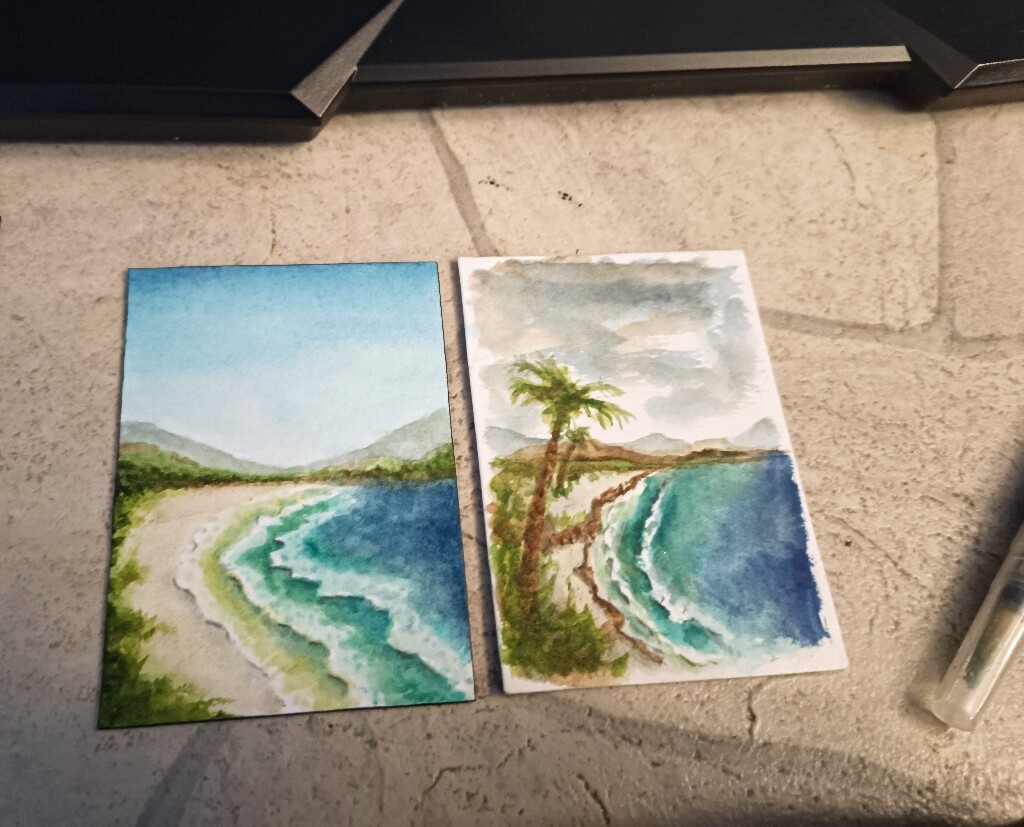 Die erste Version (rechts) ist eine der Karten, die ich verworfen hatte. Hab sie mir daher noch mal vorgenommen und neu gemalt. Die Landschaft ist jetzt etwas einfacher gestaltet und ohne die Palmen war’s mit der Zeit dann auch nicht mehr so hektisch zum fertig werden, ca. 20 Minuten waren es. Ich denke, die linke Karte kommt dann auf meine “Vielleicht Einreichen”-Liste dazu :)