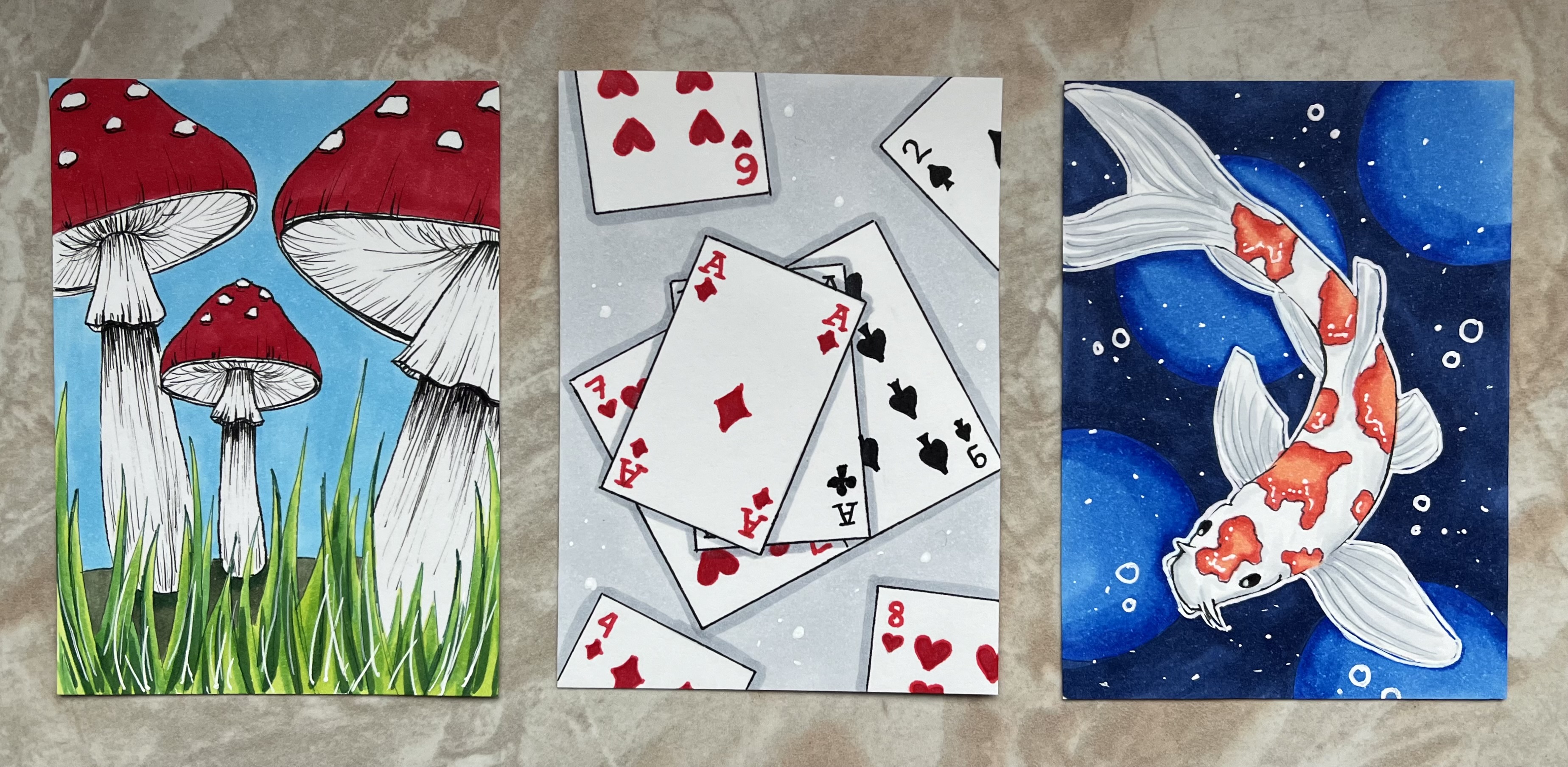 Genau, ich habe die 3 Karten mit Copic Markern gezeichnet und die Lines sind mit den Multi Linern. Was aber auch viel ausmacht ist das Papier, da habe ich auch von der Marke Copic das Papier (das lilane)