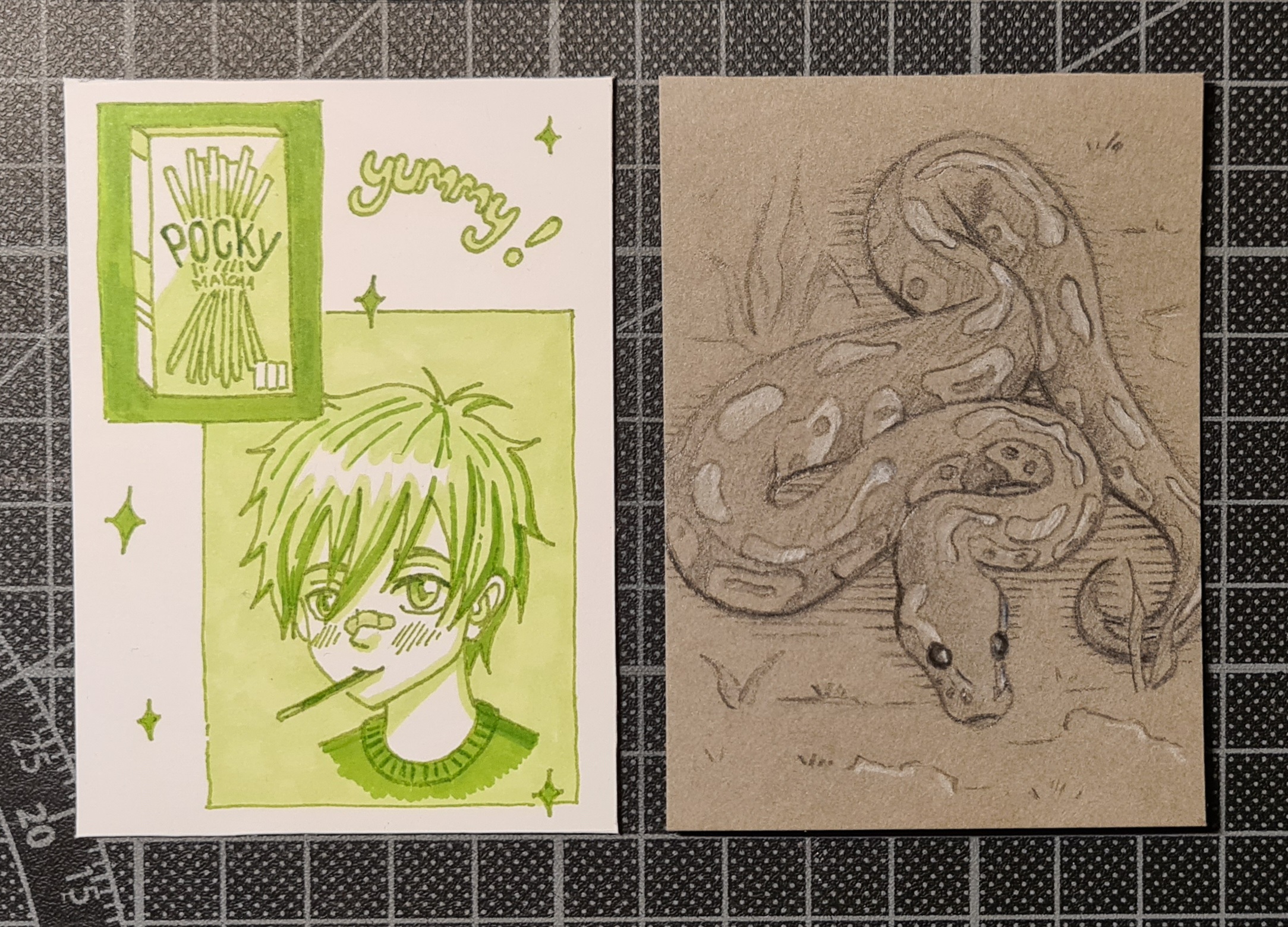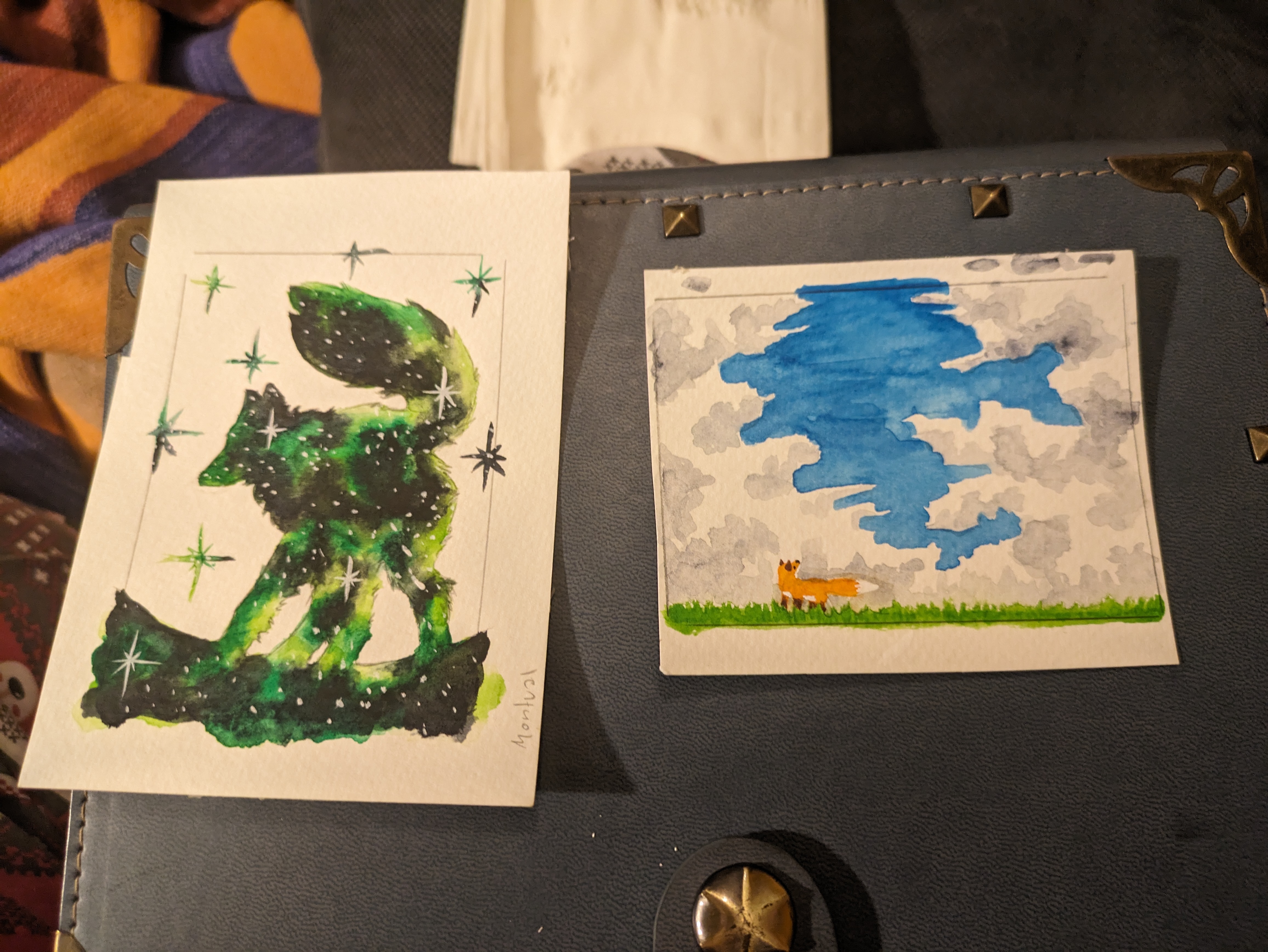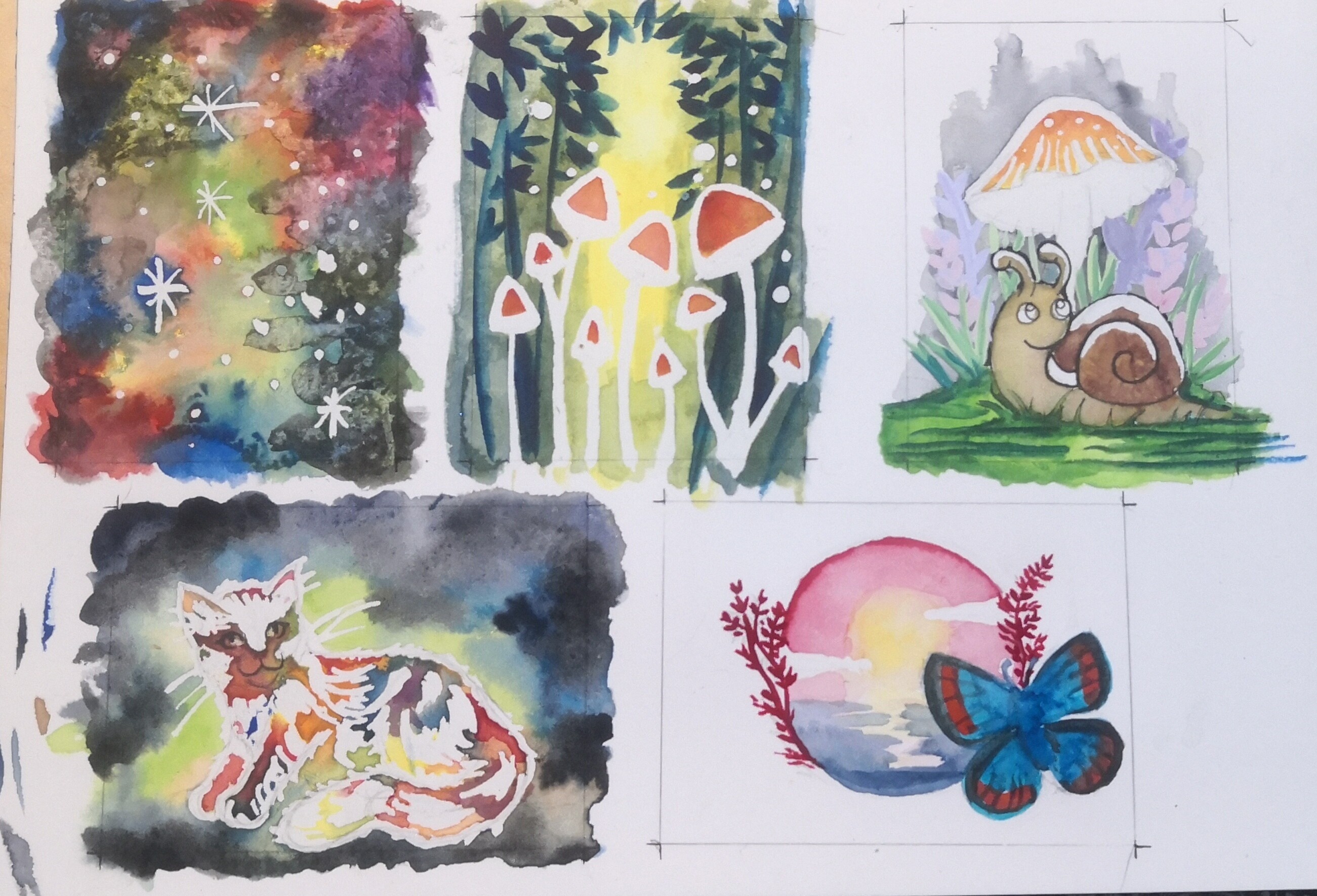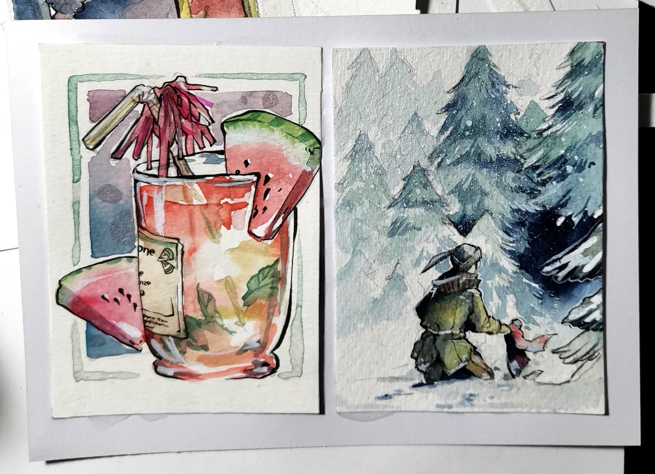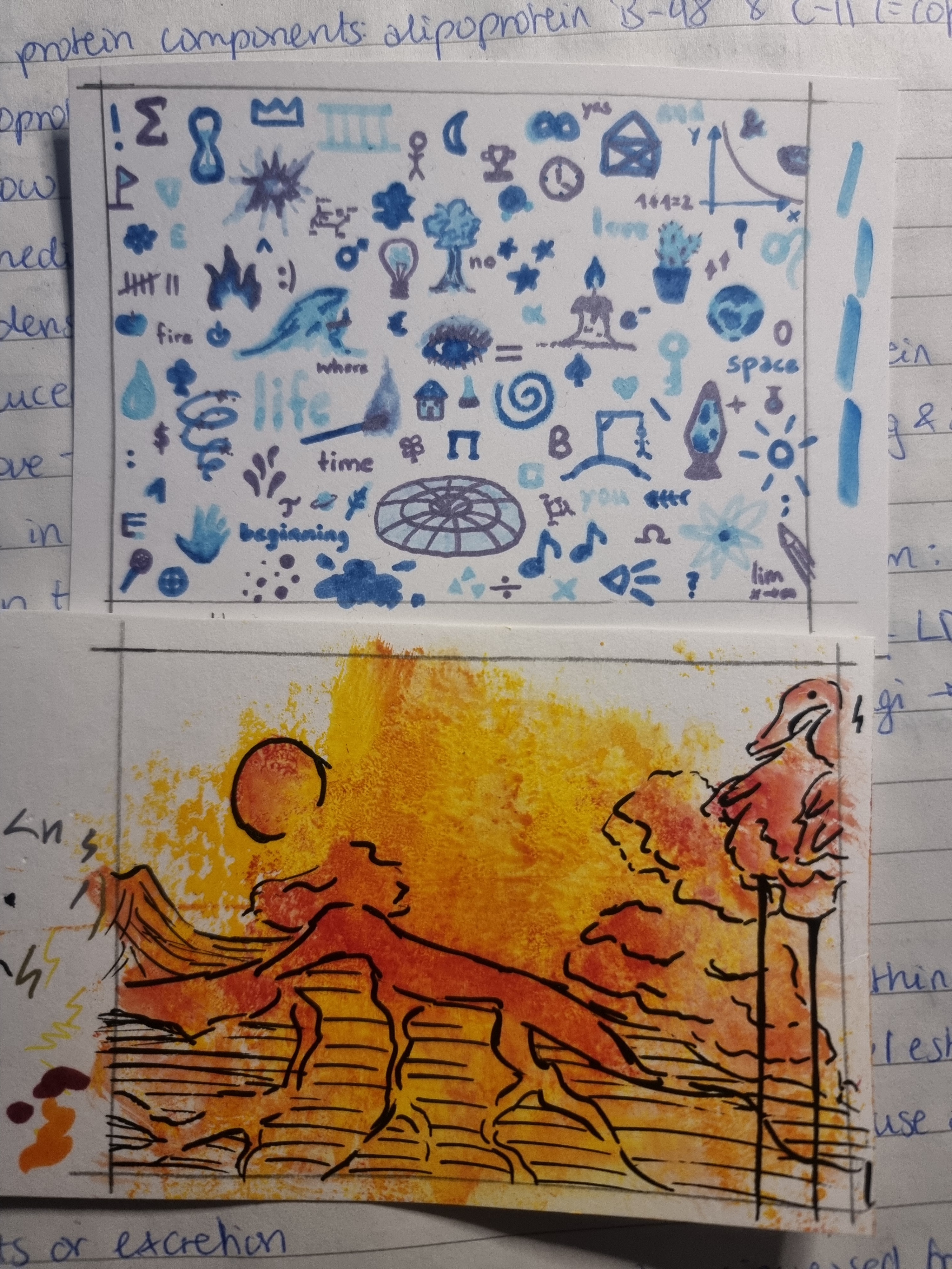 Bei der unteren Karte habe ich mir eben als Lernpausen 10min erlaubt, um mit Farben rumzupanschen und nochmals 5min, um mit Acrylmarker ein paar Linien zu ziehen. So ala Colorsplash. Ich mag das… Wesen rechts.