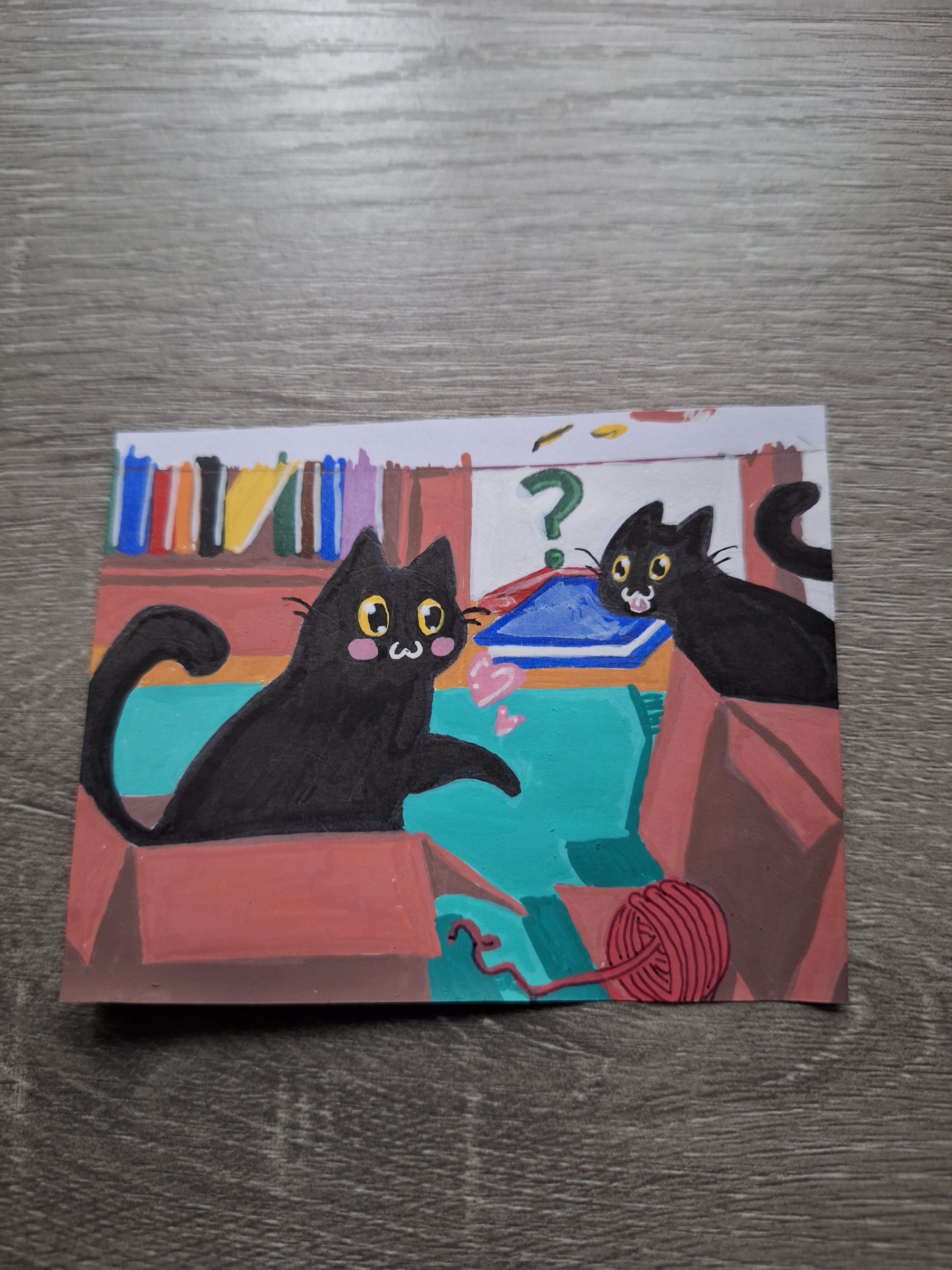 Die Katze ist angelehnt an meinem (ehemaligen) Kater Mr. Pumpernickl (der derpy Dude auf dem Foto neben der Karte :D) und war so bei 28 Minuten.