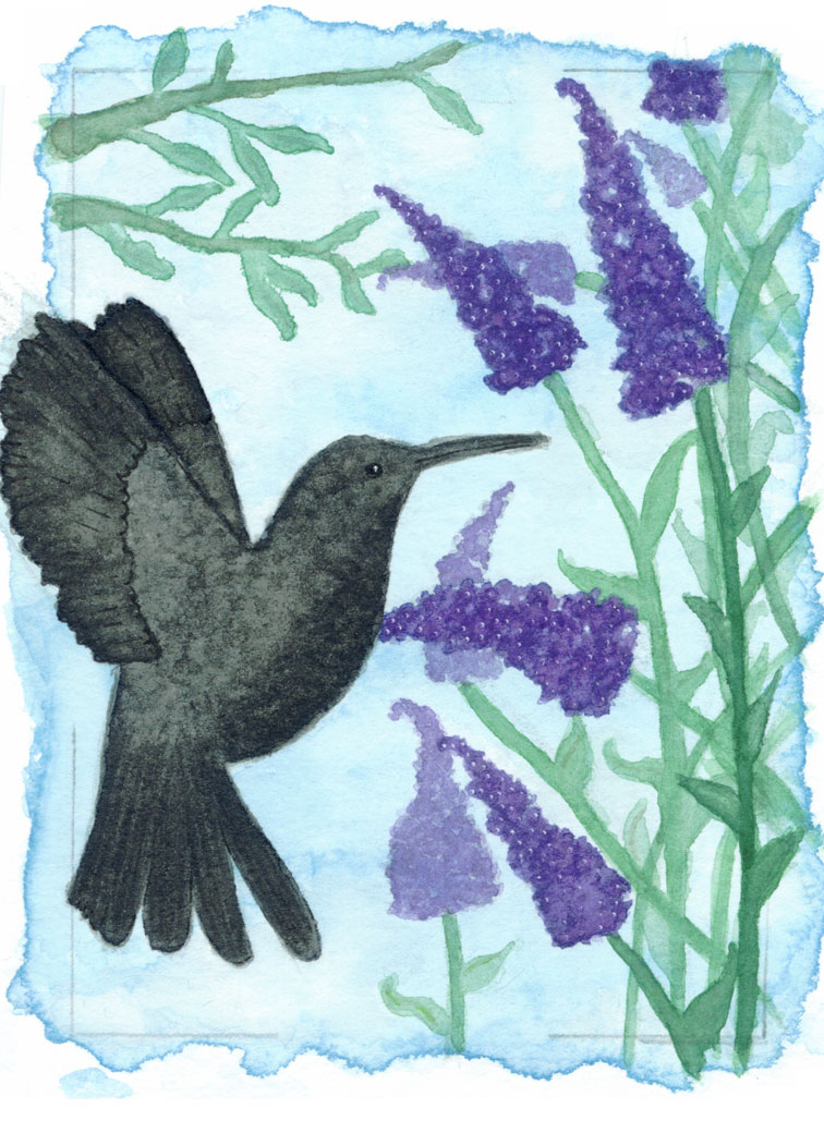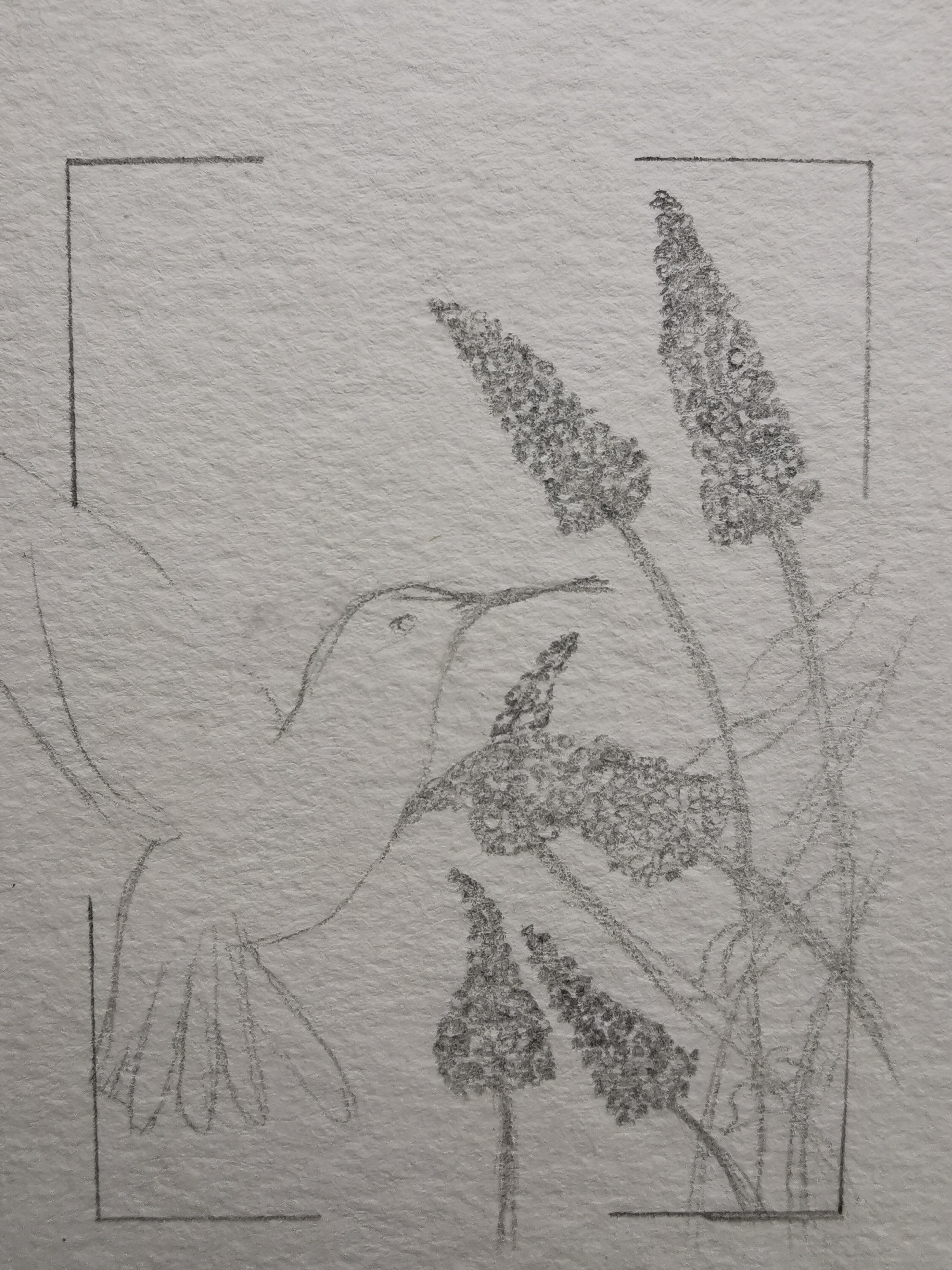 Das wäre die Skizze für meine zweite Karte. Es soll ein melanistischer Kolibri vor hellem Himmel und Schmetterlingsflieder werden.