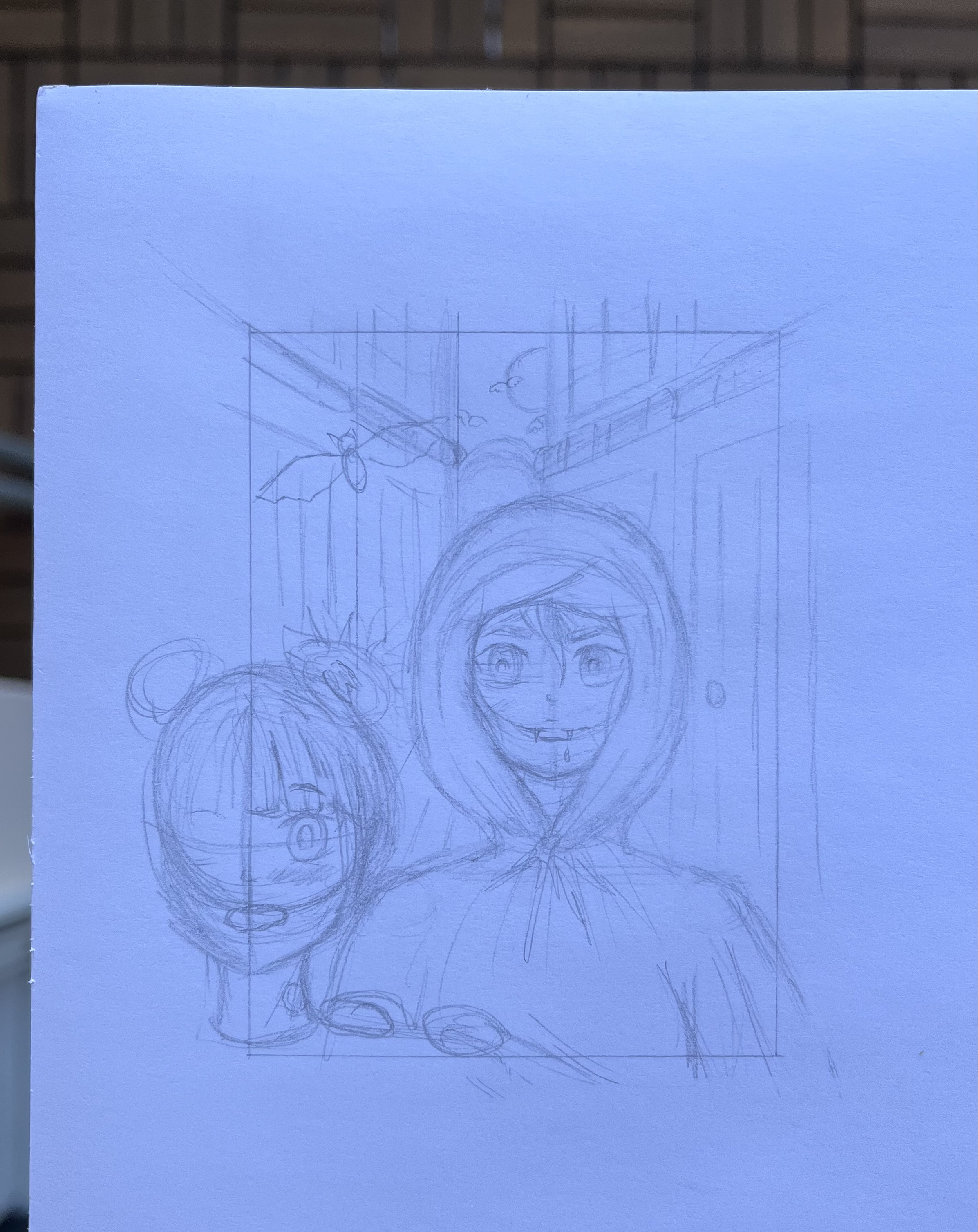 Du könntest beim Vampier auch die zweite Person etwas mehr ins Bild holen. Zum Beispiel so, dass man die Hälfte des Kopfes sieht. Damit der Fokus weiterhin auf dem Vampier liegt, kannst du zum Beispiel die Haare so ins Gesicht fallen lassen, dass man die Augen der zu beißenden Person nicht sehen kann.