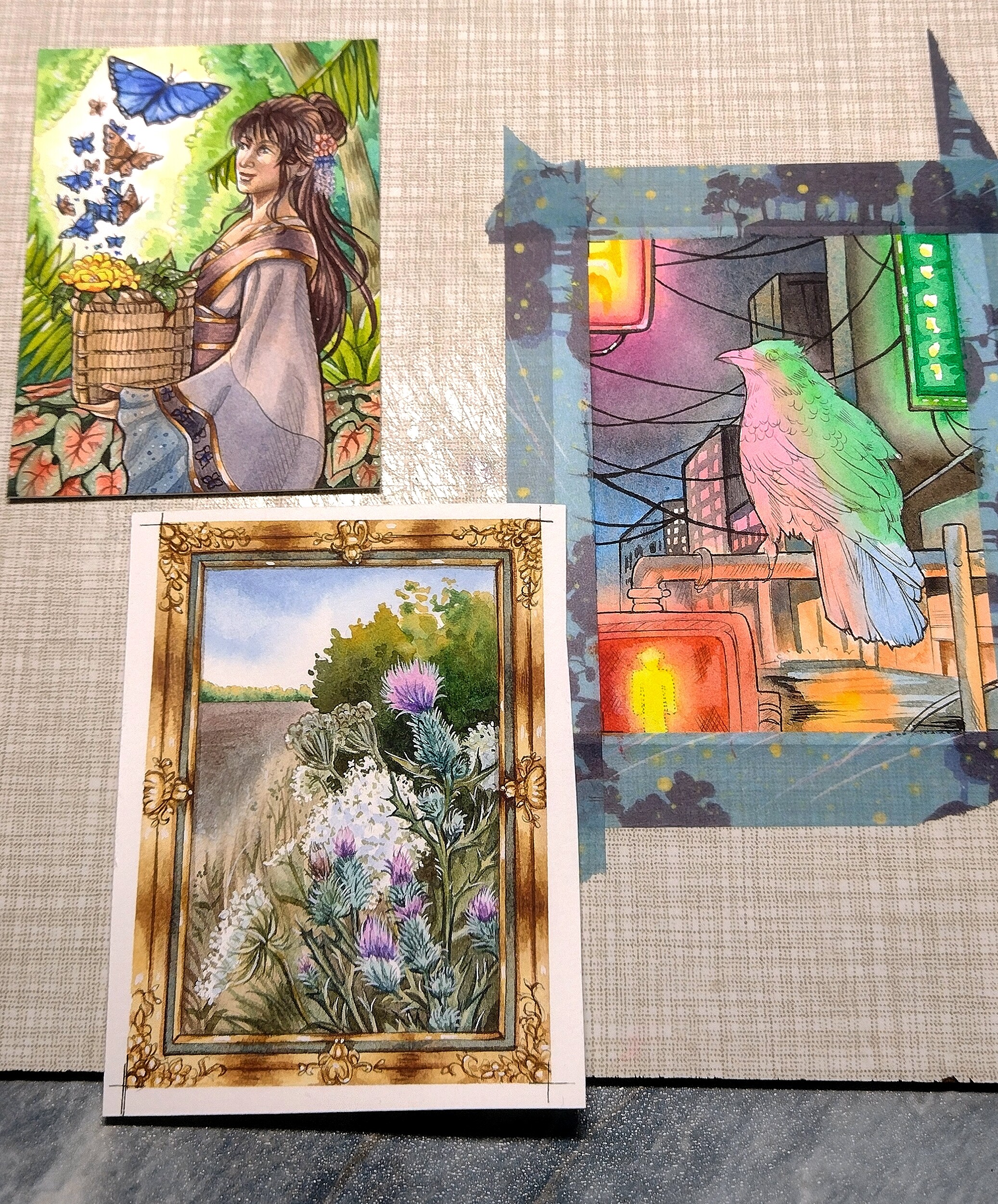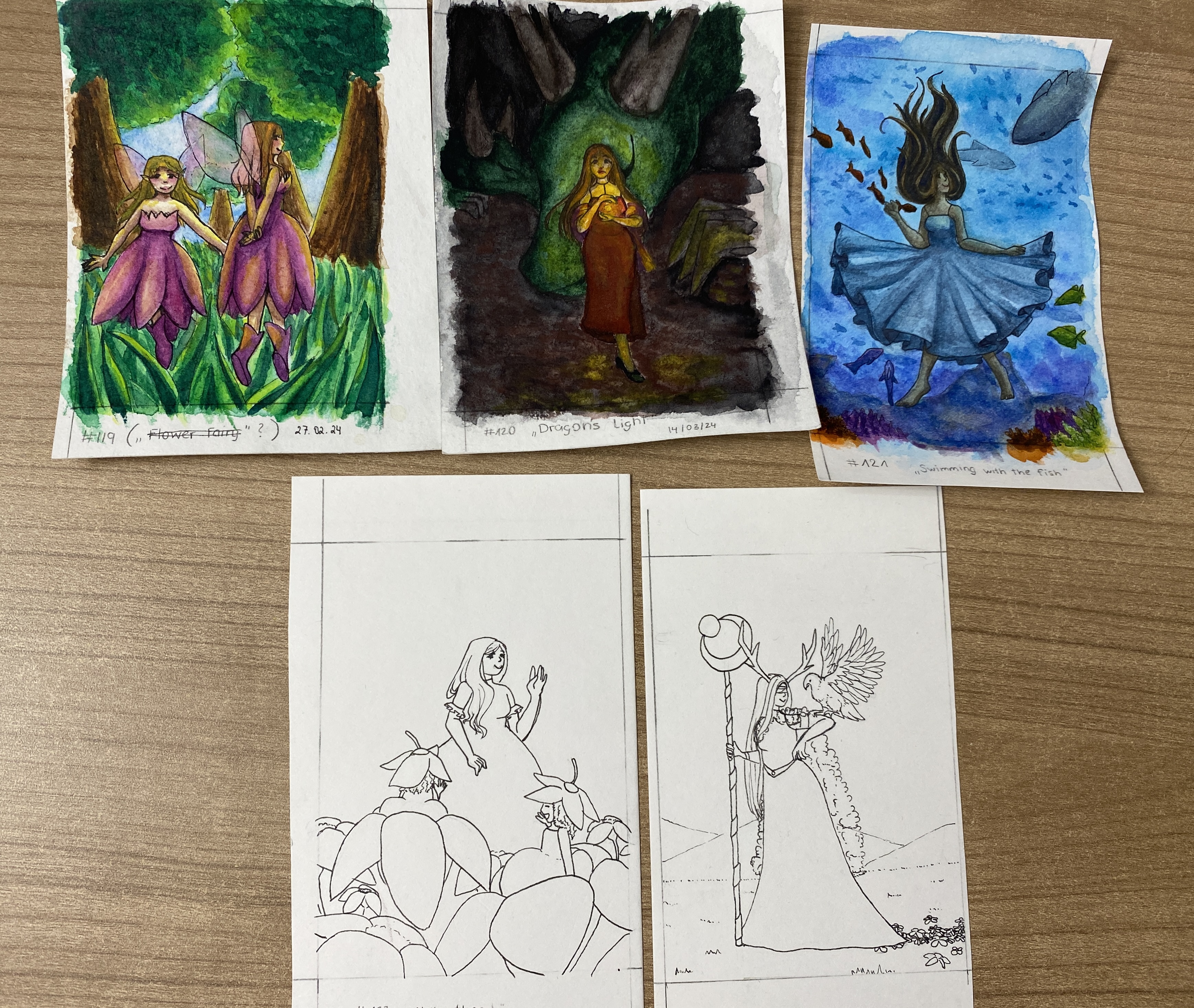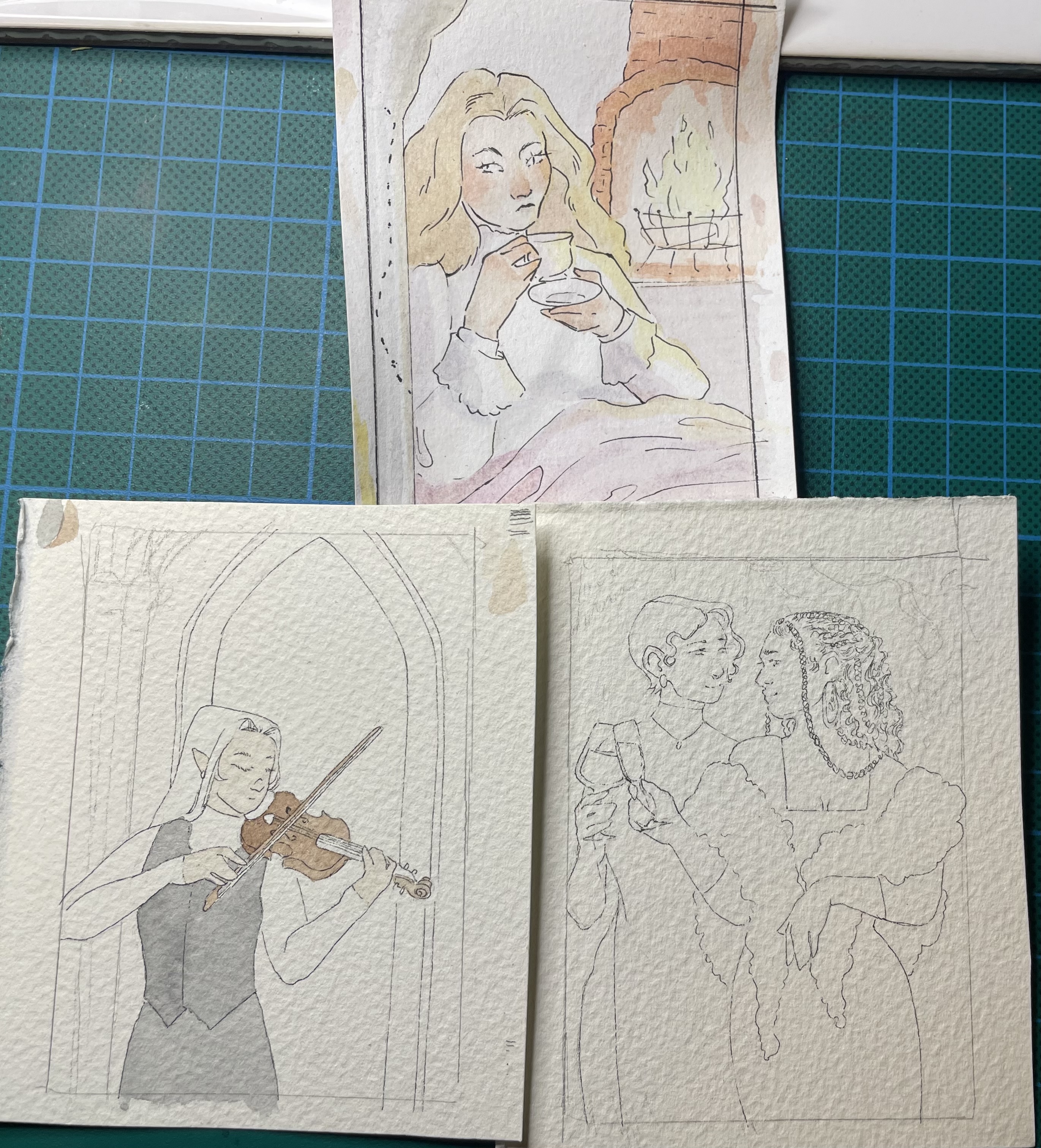 Ich wollte mich kurz mit meinem aktuellen Stand melden. :) Ich kämpfe zwar aktuell ein bisschen mit meiner schmerzenden Hand, aber inzwischen habe ich die Lines für alle drei Karten fertig und werde mich diese Woche noch an die Farben setzen.