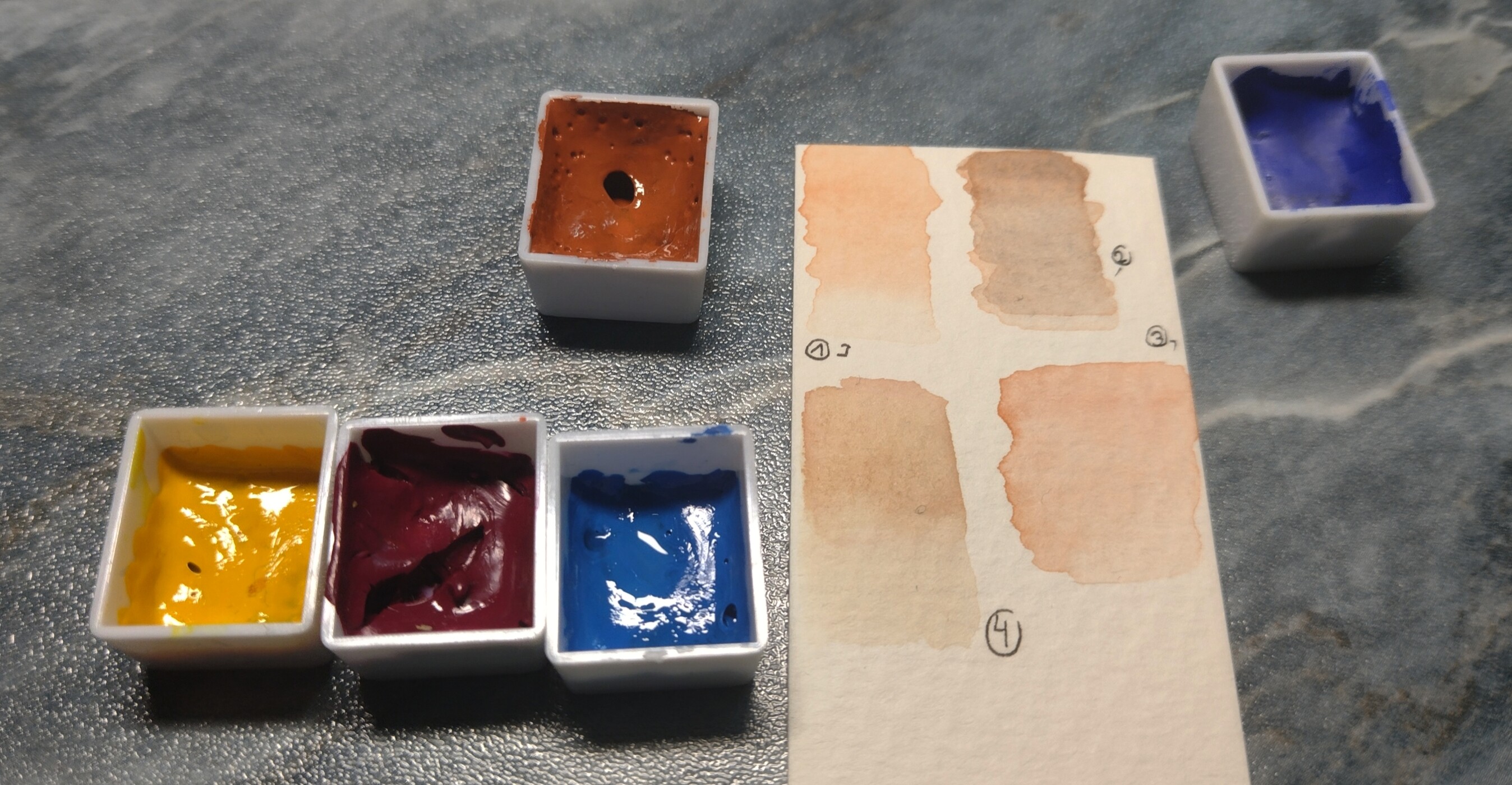 - Yellow Lake + Magenta Rose + ein Touch Cerulean Blue - denn ja, auch mit den drei Primärfarben kann man Hauttöne mischen, weiß ist nicht nötig. :3