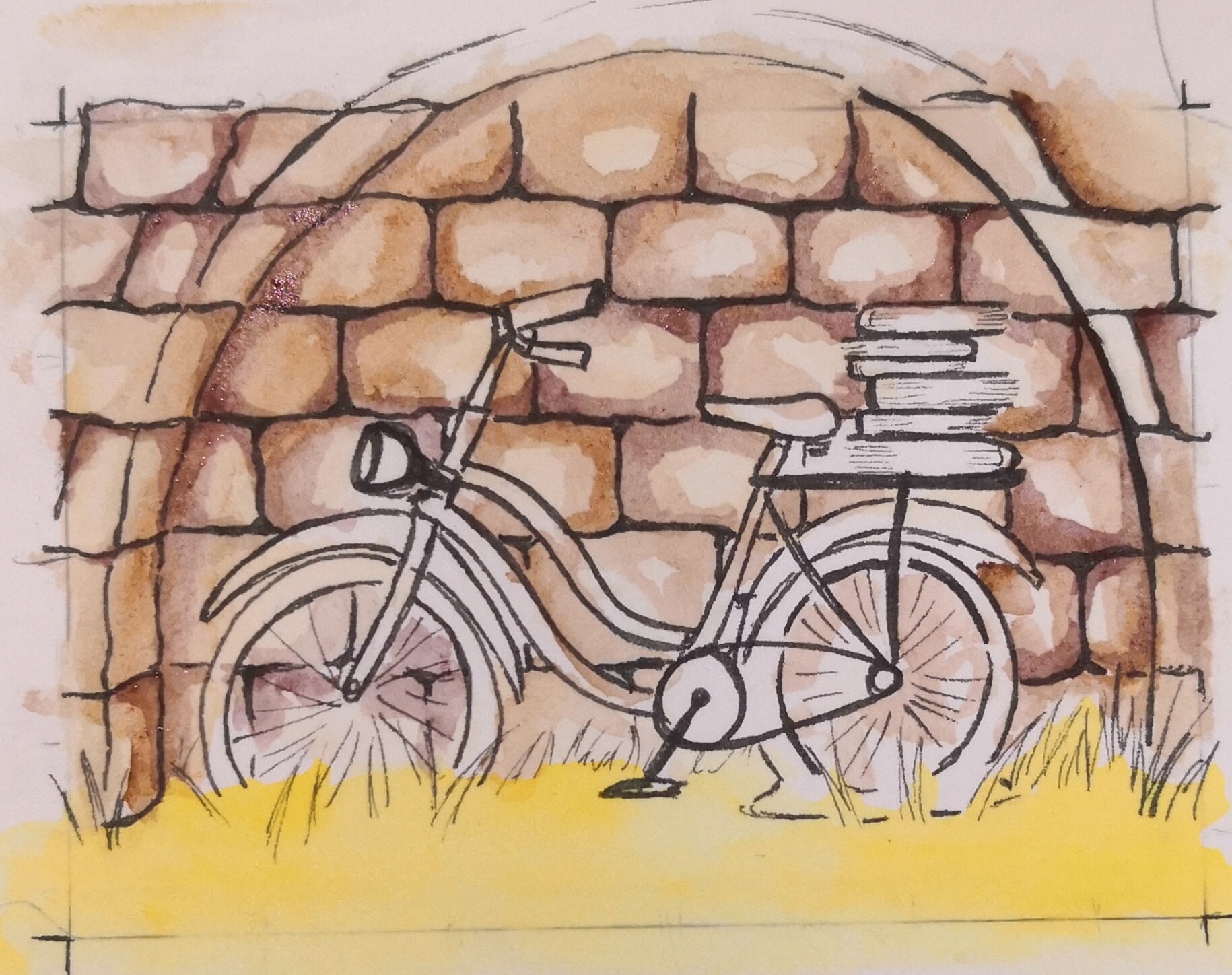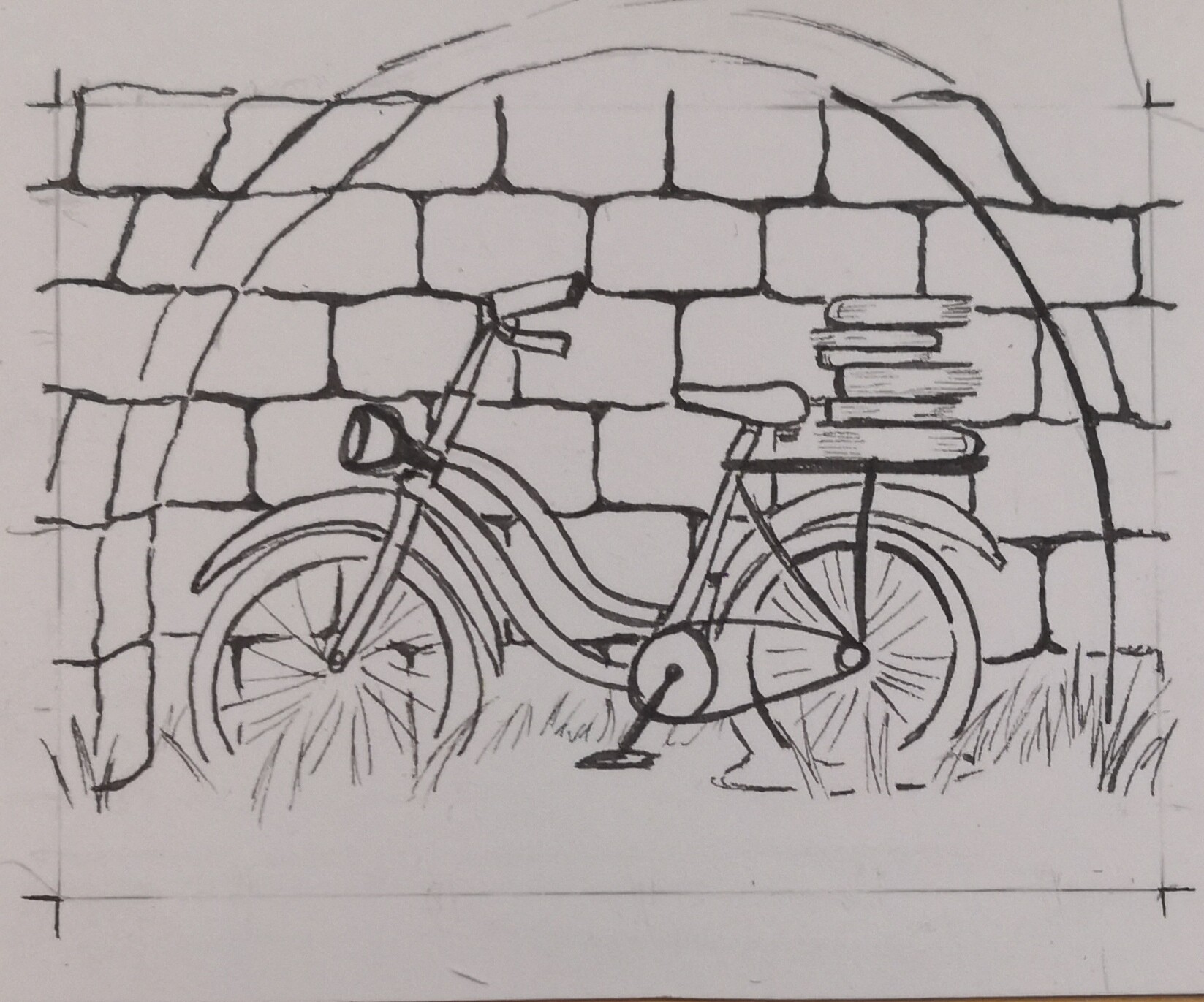 Und zwar: Es ist schon ewig her, aber ich habe mal ein kaputtes Fahrrad mit einem Stapel Büchern auf dem Gepäckträger, angelehnt an eine grob gemauerte Steinwand hinter einem metallenen Zaun eingesperrt gesehen. (Und damals auch ein Foto gemacht, dass aber wahrscheinlich nicht mehr existiert.) Die Szene sah irgendwie toll aus, daher dacht ich, ich kann mal versuchen es zu reproduzieren.