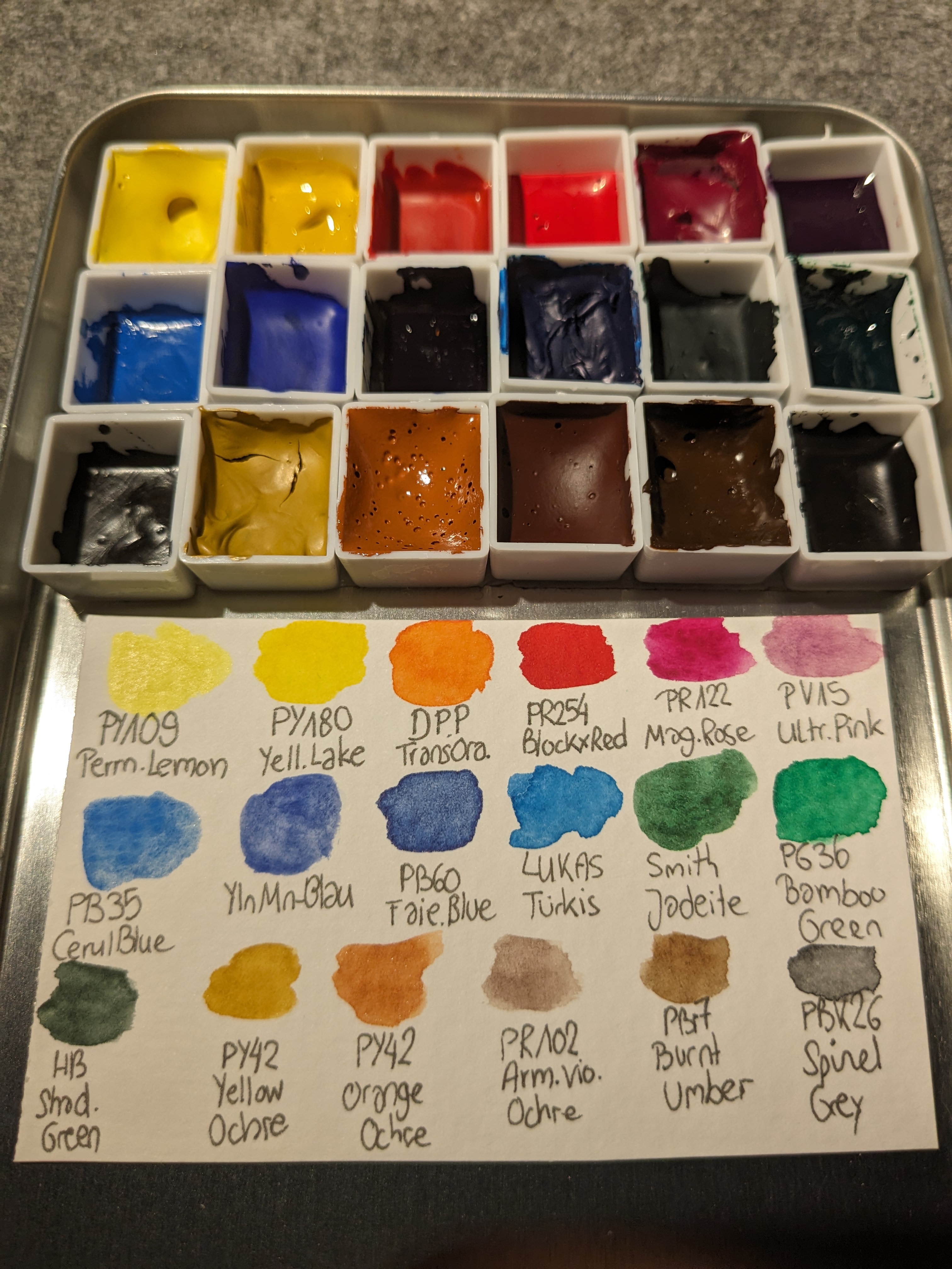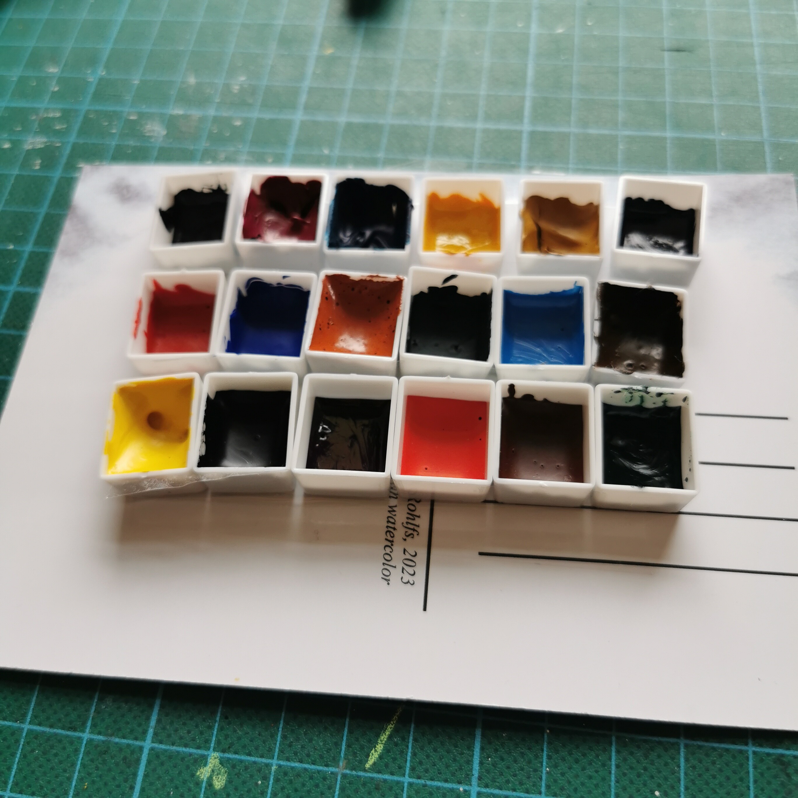 Joah, ich hab zwar auch hart überlegt ob ich mir das antun will, bin aber letztlich zu dem Schluss gekommen, dass es nicht anders ging. Das Problem bei Dots auf Papier ist halt, dass der letzte Rest nicht vernünftig genutzt werden kann und somit ein gewisser Anteil der Farbe verlorengeht - was bei einigen der Pigmente in dieser Aktion eine echte Tragödie wäre. (Sprich: ich war psychisch einfach außerstande, gutes YInMn-Blau zu verschwenden… XDD) Also dann doch lieber Näpfchen, mit dem Vorteil, dass die im Zweifelsfall gleich in Kästen einsortiert und bei Bedarf nachgefüllt werden können. Den Sammlern unter uns kommt das sicherlich auch entgegen.