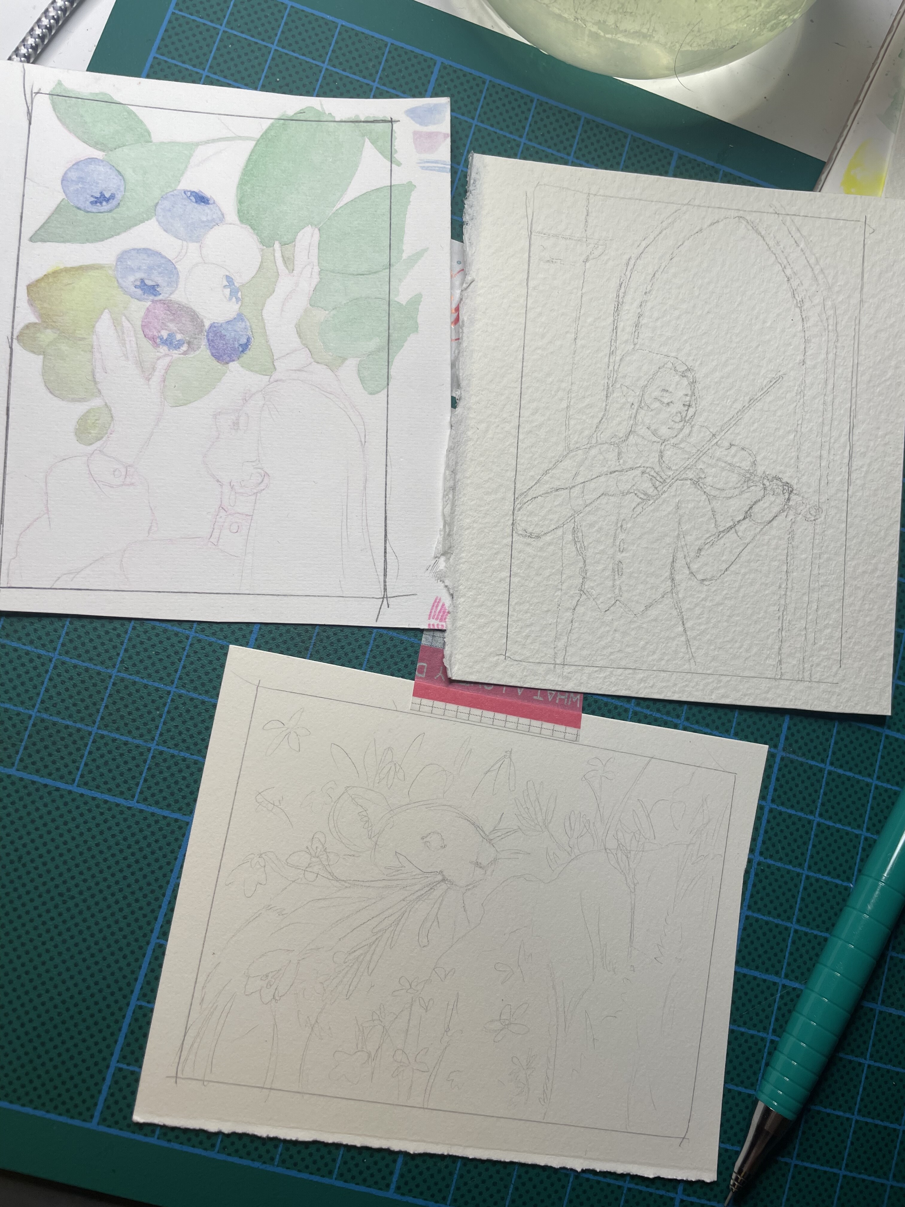 Eine Karte ist fertig, eine weitere begonnen und Ideen grob skizziert.