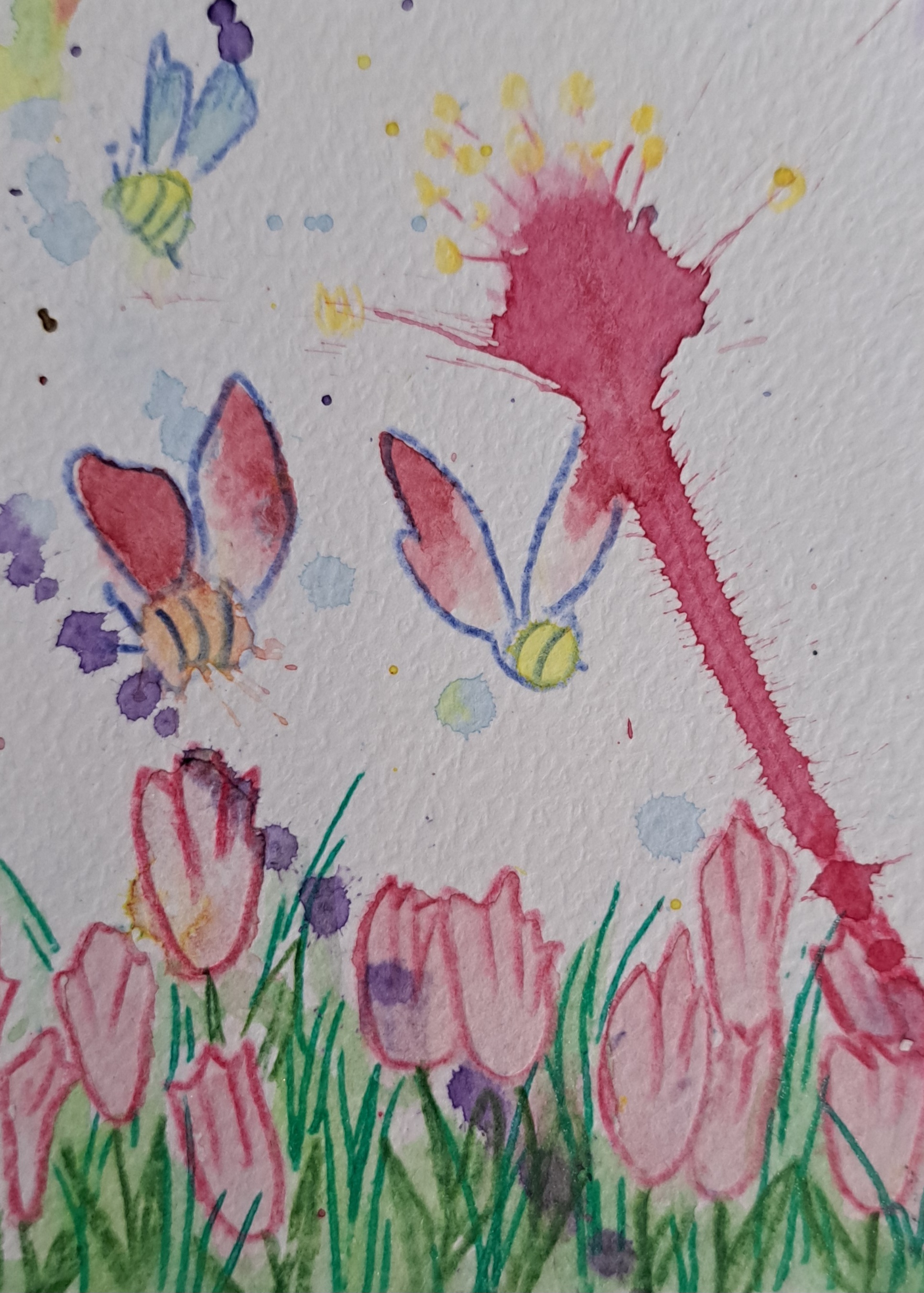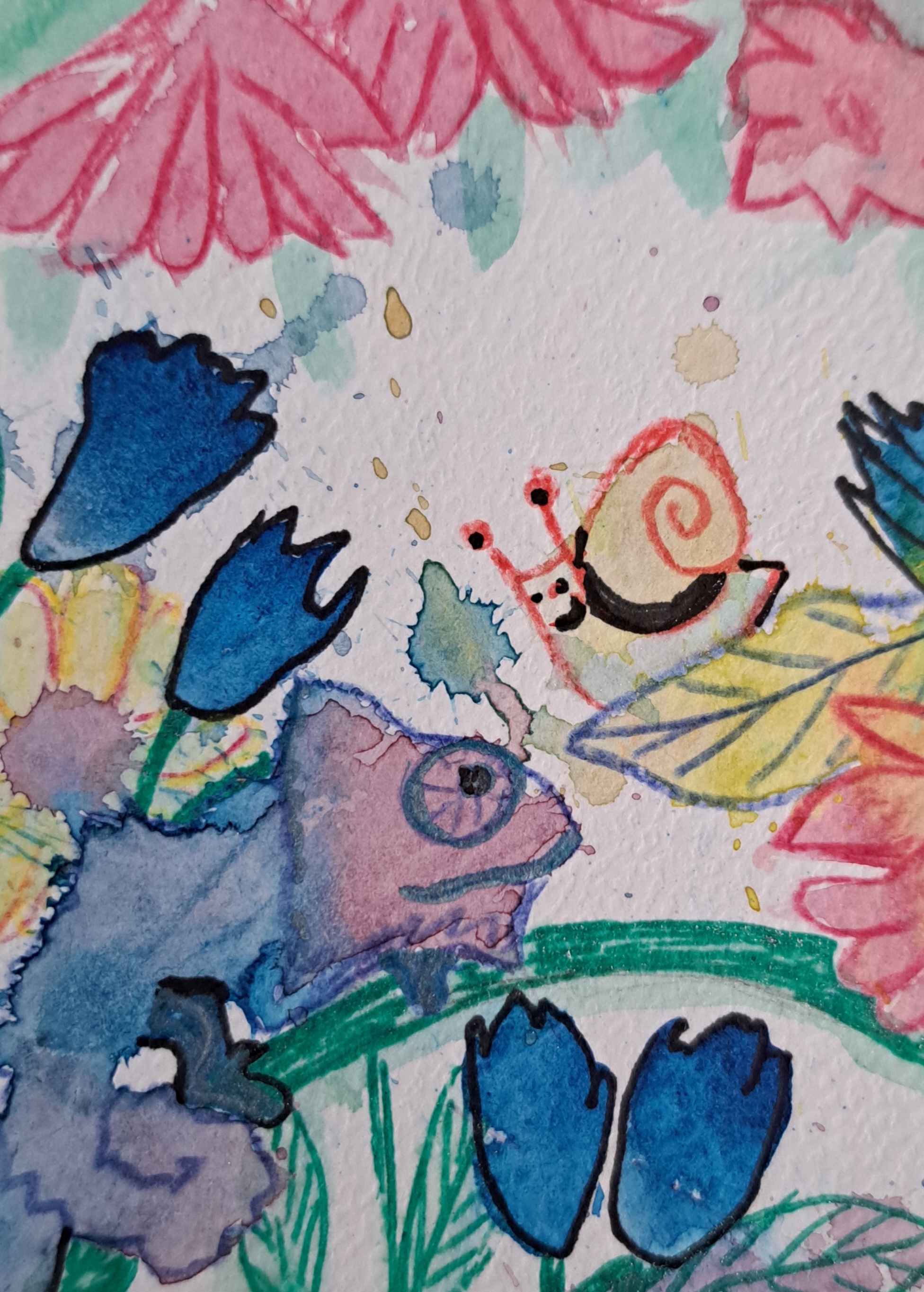 Es wäre gut, wenn man die Motivfindung an den Splashes erkennen kann, also z.B. markante Mustet/Kanten. Bei Aquarellfarben ist das Farbspiel/Verlaufen ja auch sehr charakteristisch - damit kann man auch den Splash gut mit einbauen. Im Prinzip möchte ich da nicht zu viel einschränken, aber den kompletten Splash mit Acrylfarbe zu übermalen und dabei die Form zu verändern wäre dann zu viel ;)