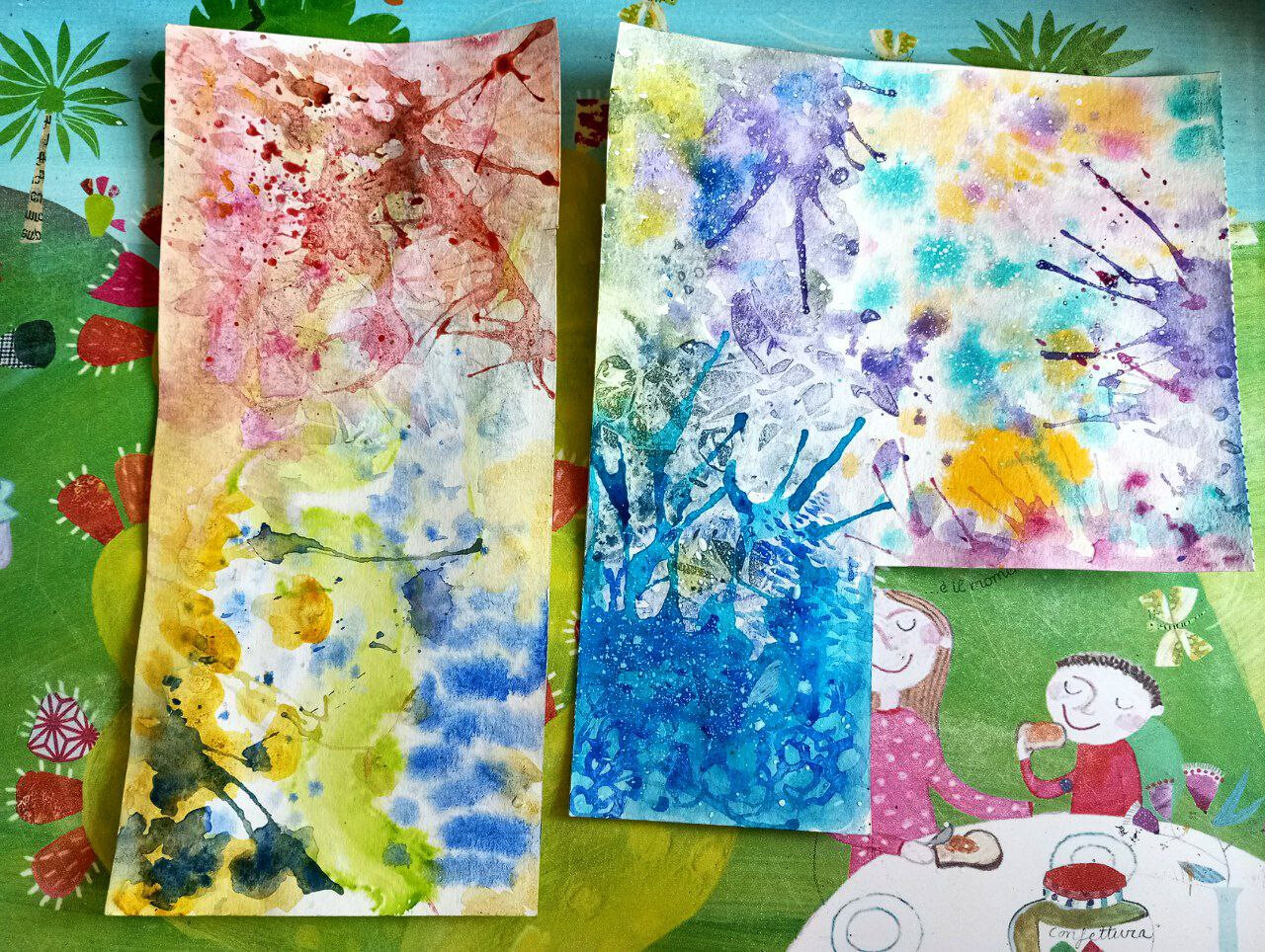 So, hab mir gestern zwei Papiere vorbereitet. :) Habe Frischhaltefolie und grobes Salz ausprobiert. Das Salz hat irgendwie nicht geklappt, da muss ich was falsch gemacht haben. xD Aber die Folie macht interessante Texturen.