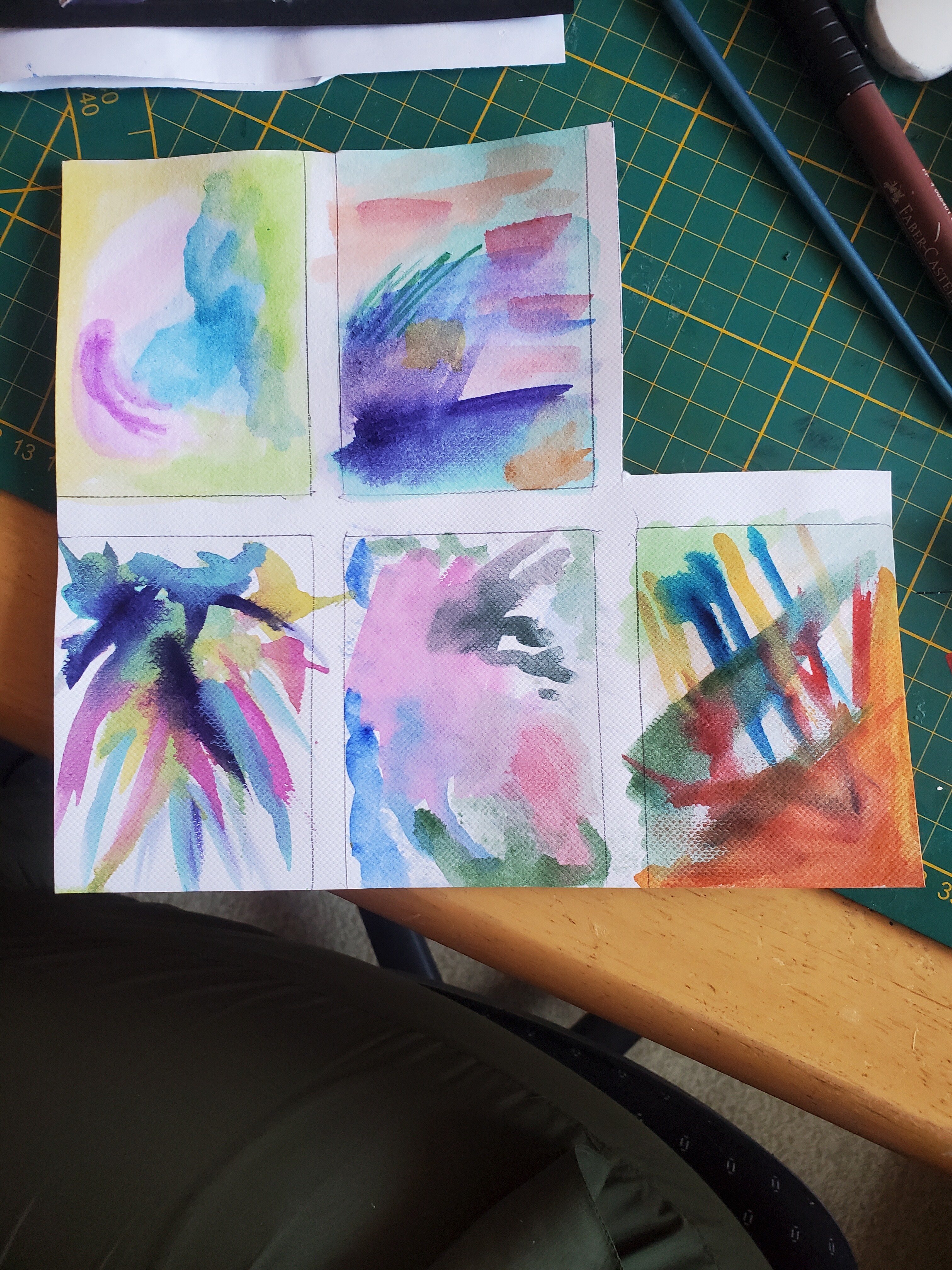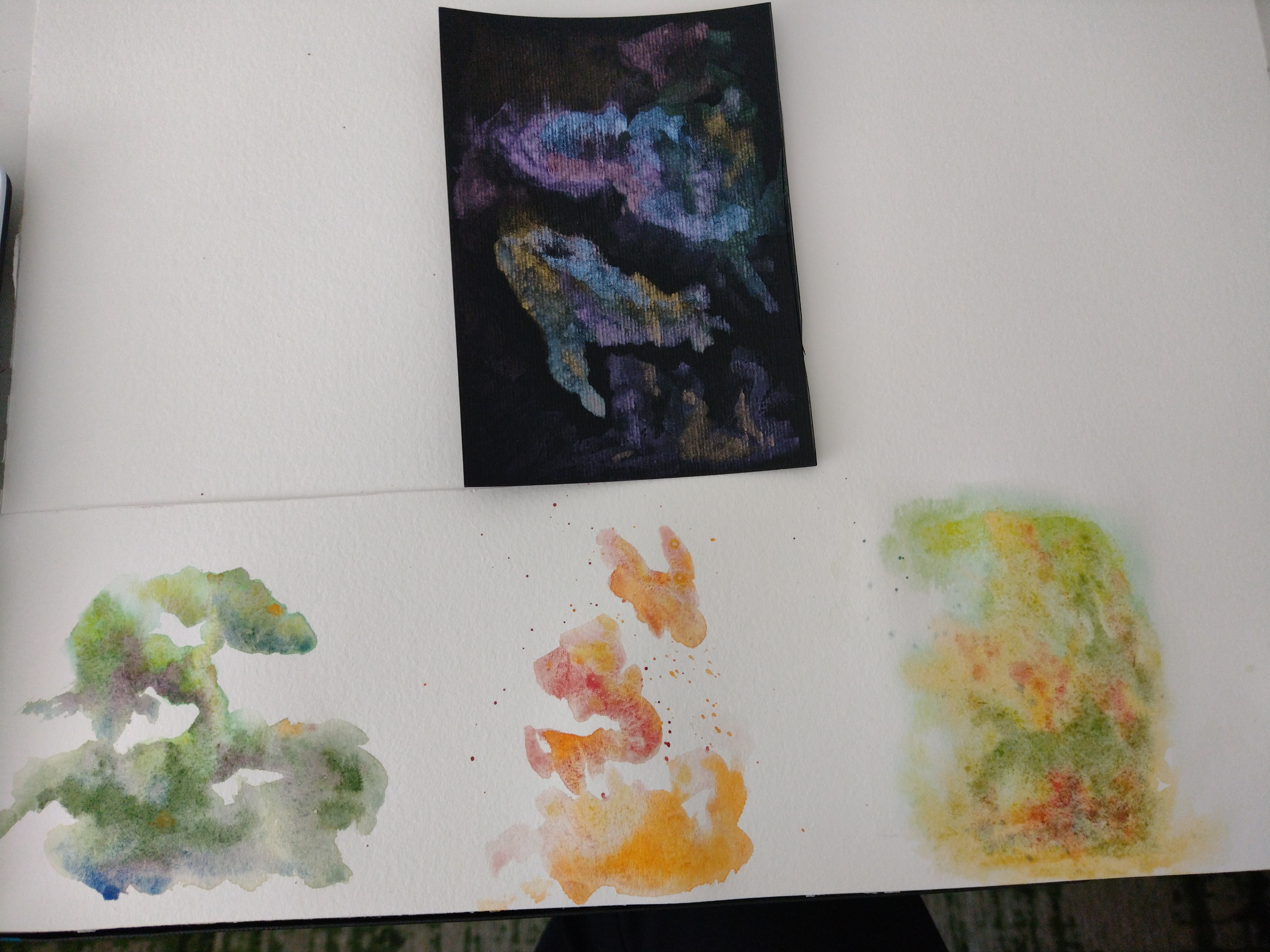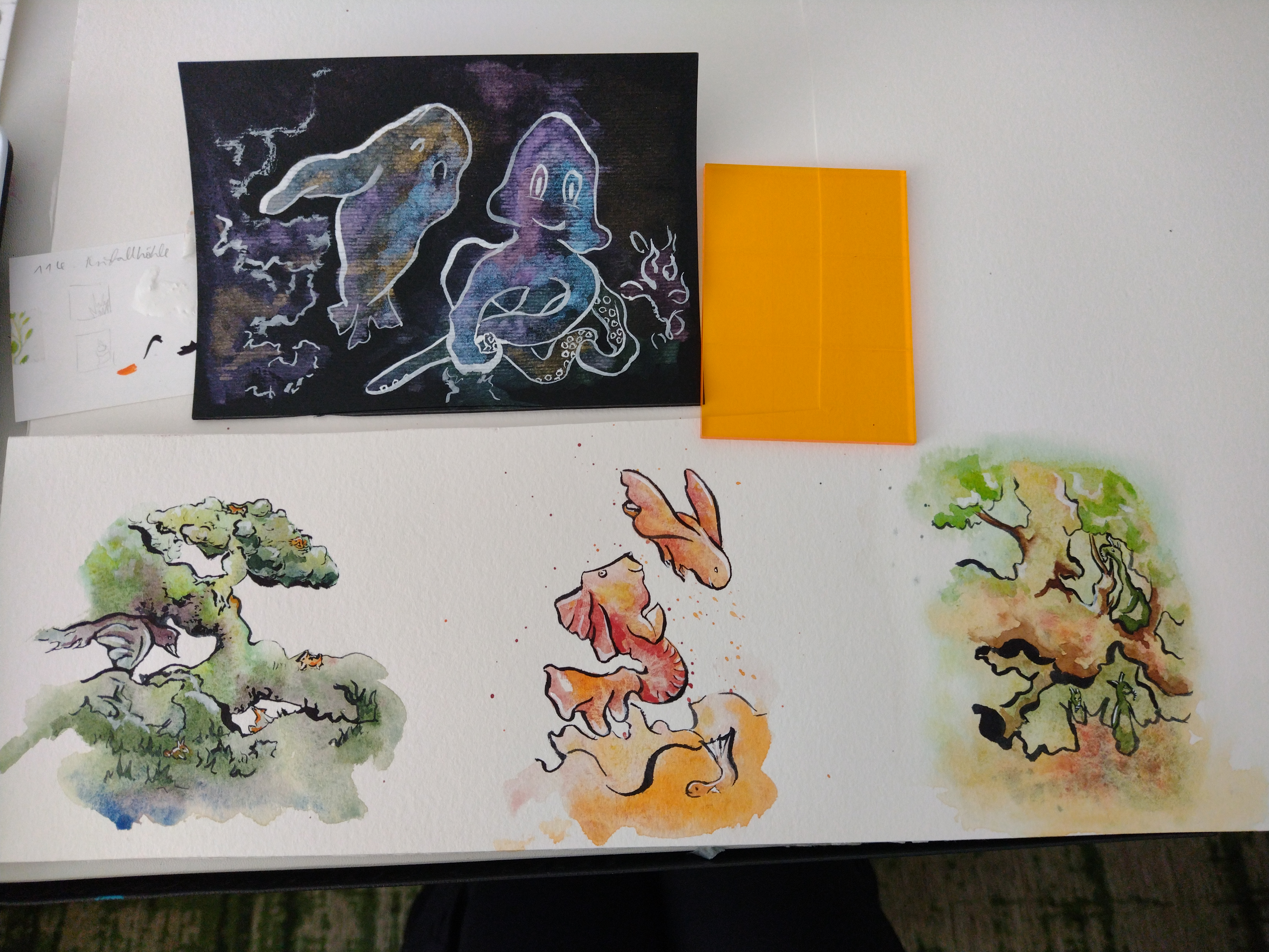 Ich habe alle vier Kleksgruppen ausgearbeitet. Das auf schwarzem Papier passt schlecht ins Kakaoformat, der Rest sollte aber geeignet sein. Was ich davon ab Ende wirklich einreiche entscheide ich nach dem Zuschneiden