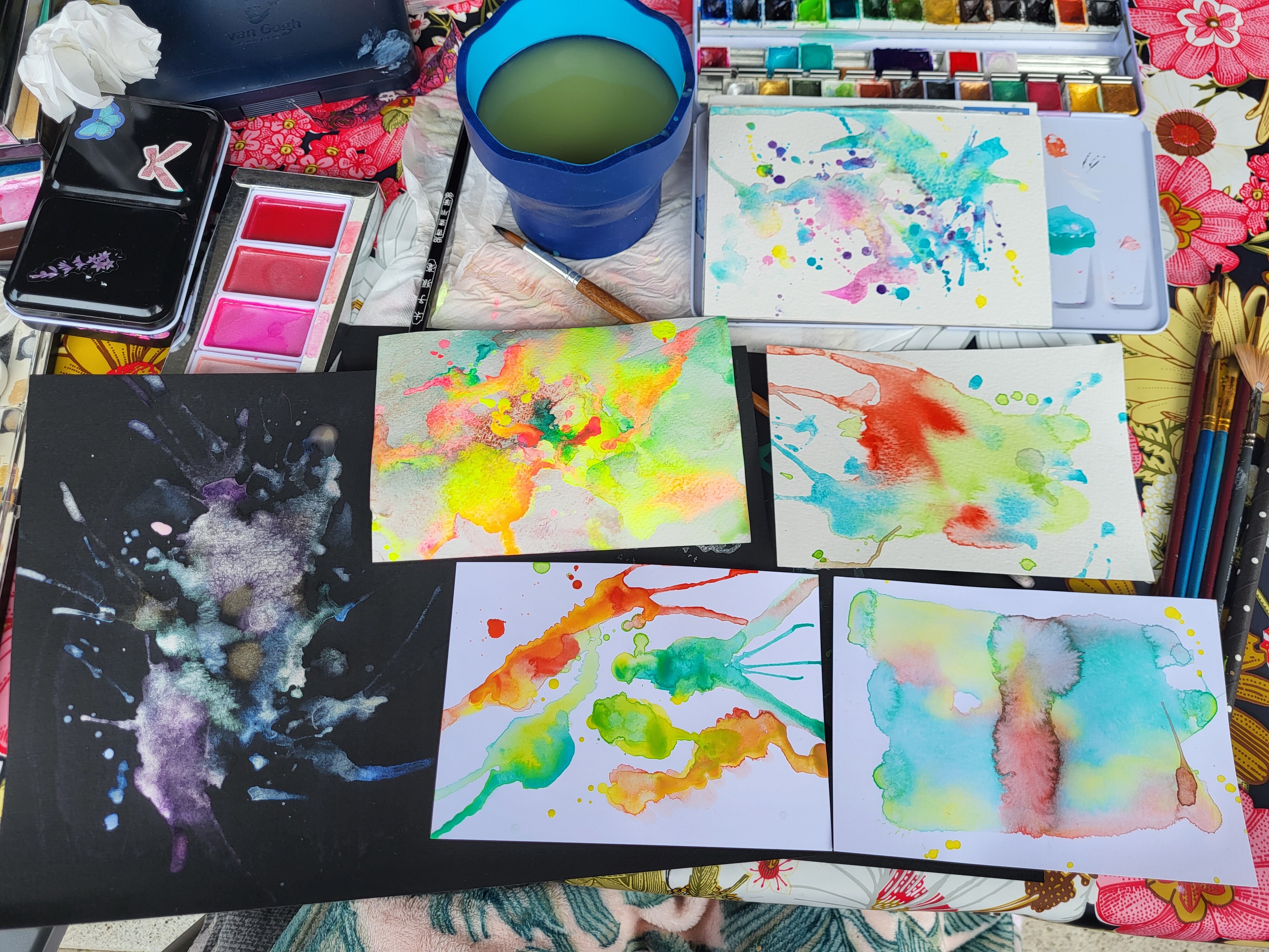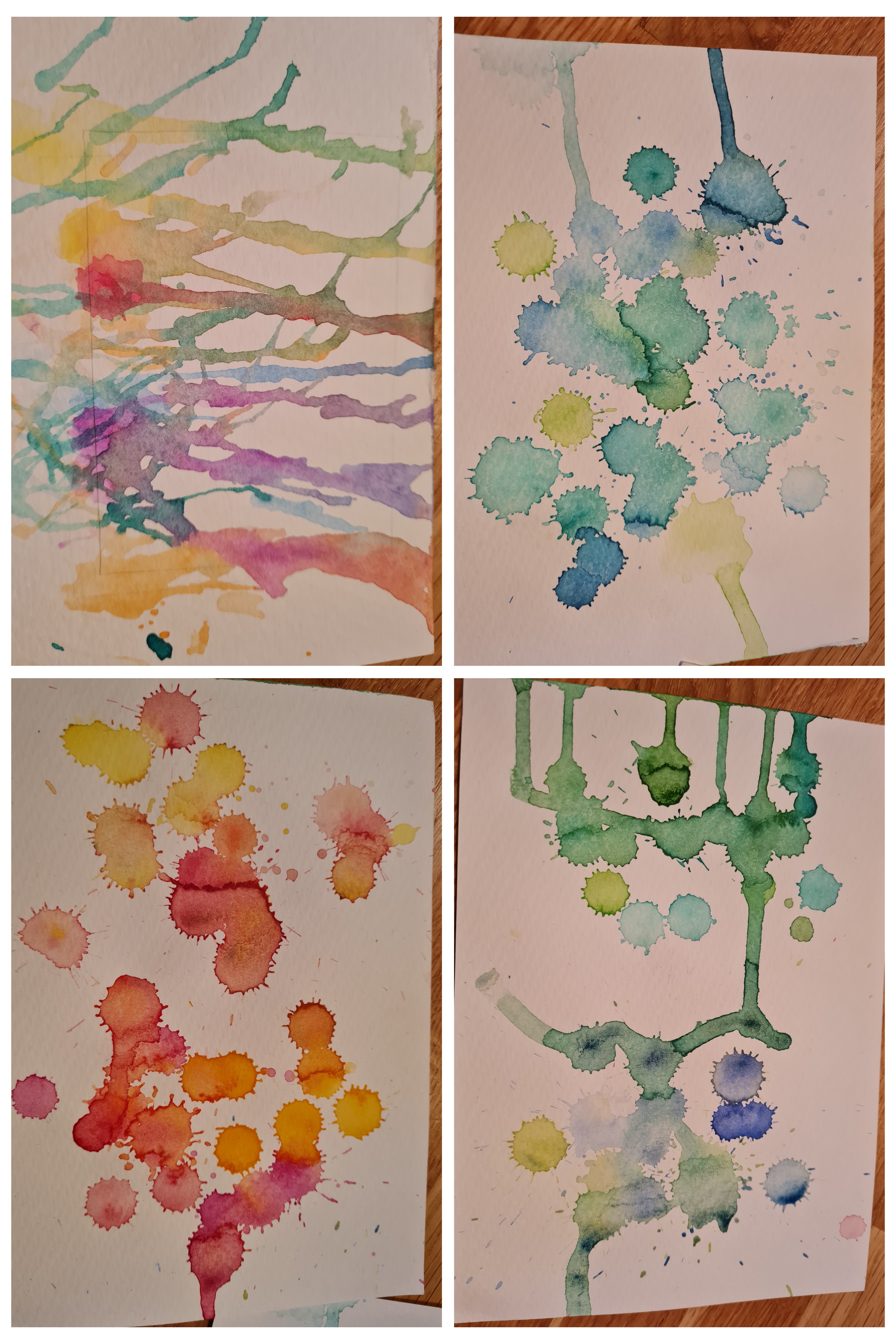 Ich nehme ab und an Fächerpinzel zum Spritzen. Und einen Strohhalm und puste damit mitten in einen großen Blobb. Falls du eine pimpette da hast kannst du mit der viel Farbe aufsaugen und dann auf das Papier fallen lassen. :) das spritzt so schön!