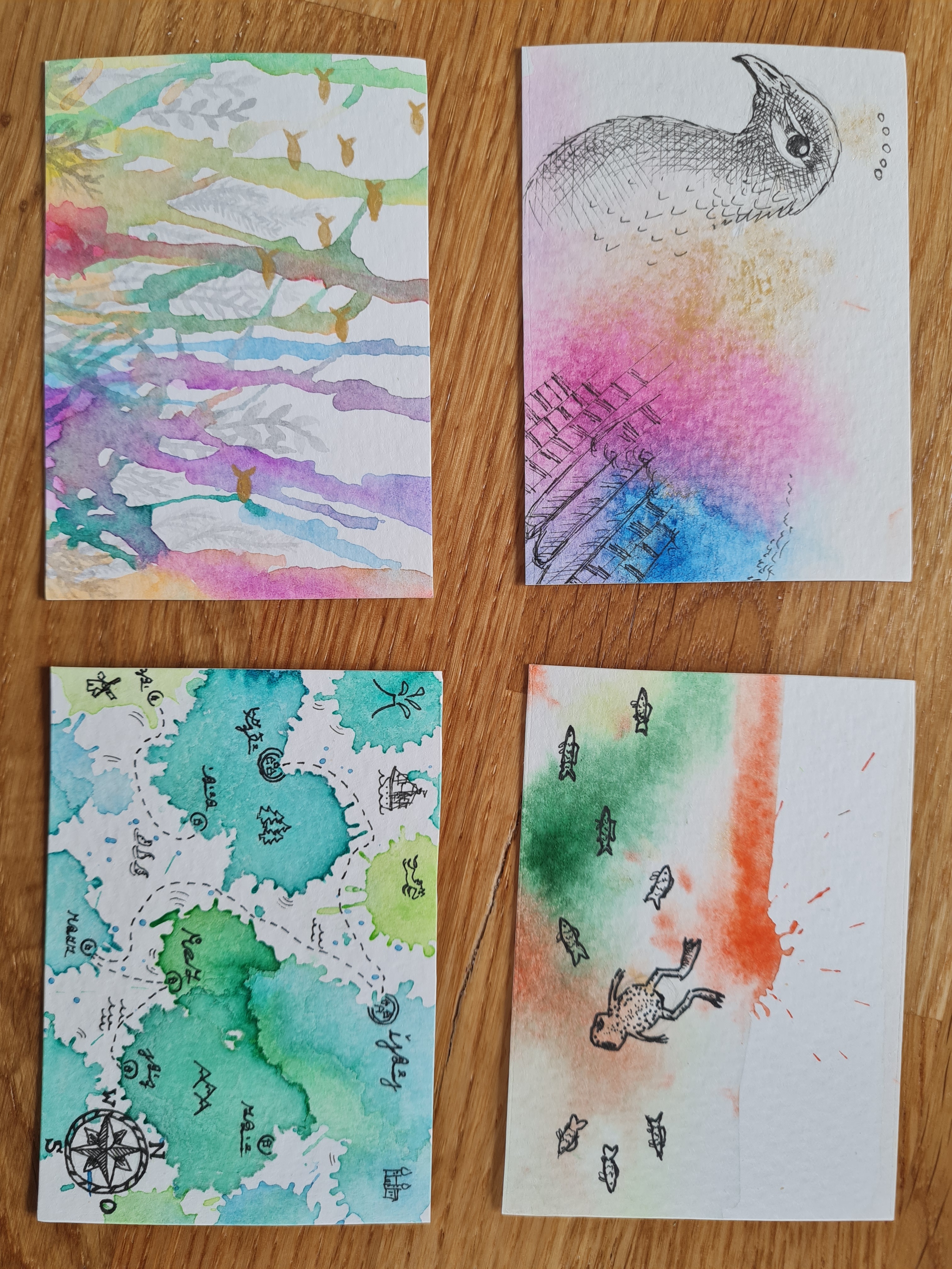 Und so sieht der aktuelle Stand aus :) ich ärgere mich nur grün und blau weil ich die unteren beiden Karten fast 2mm zu kurz abgeschnitten habe D: wenn sie trotzdem zugelassen werden freue ich mich, vor allem die Seekarte mag ich wirklich gerne, ansonsten werde ich wohl nochmal ein bisschen herum klecksen ;)