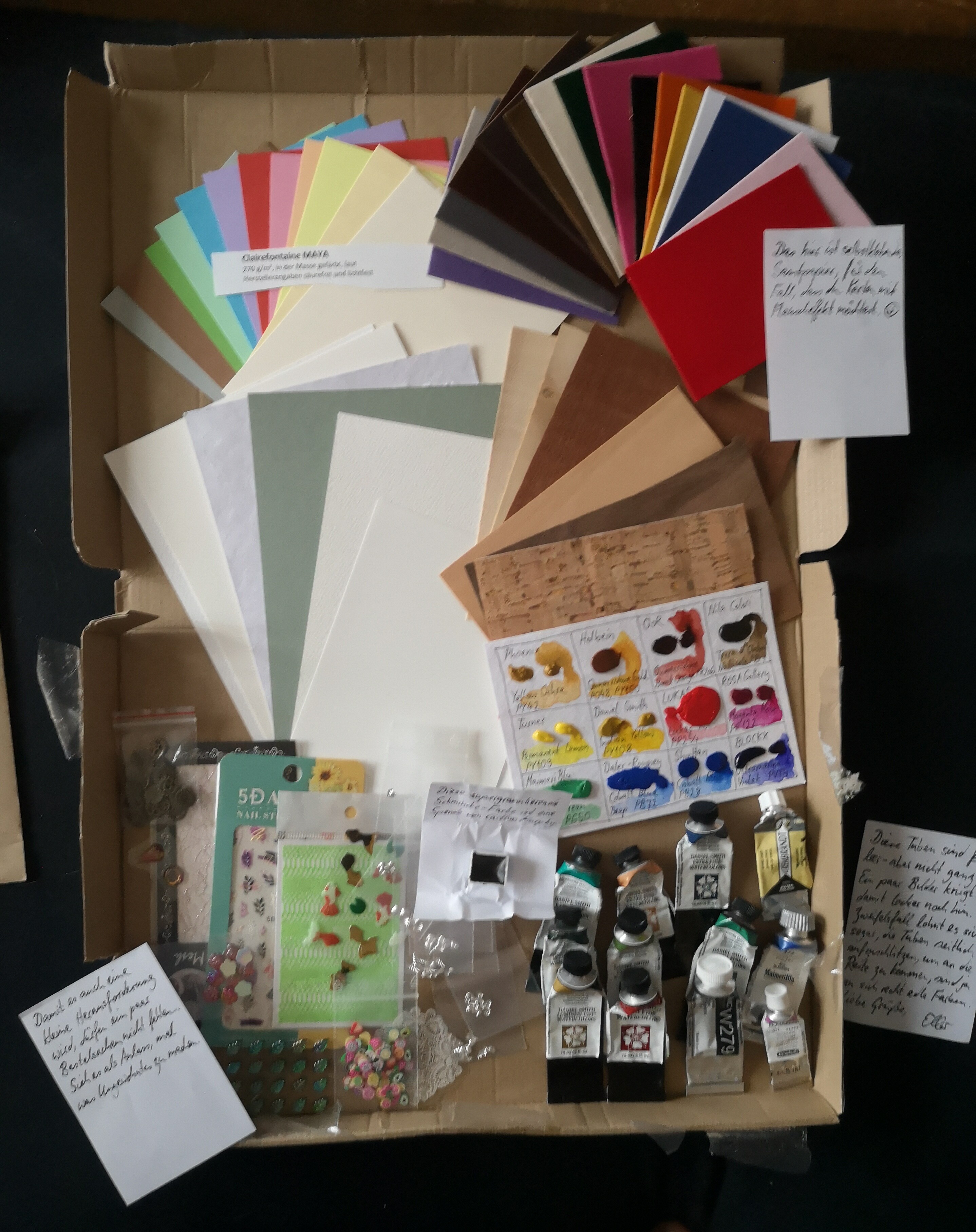 Für @elanor89 und andere Interessent:innen ohne Adventskalender kann ich anbieten, einen kleinen Brief mit Papierproben, Farb-dots oder so loszuschicken - wenn der am Freitag in die Post geht, müsste er spätestens Heiligabend da sein… Bei Interesse einfach PN an mich. ^^