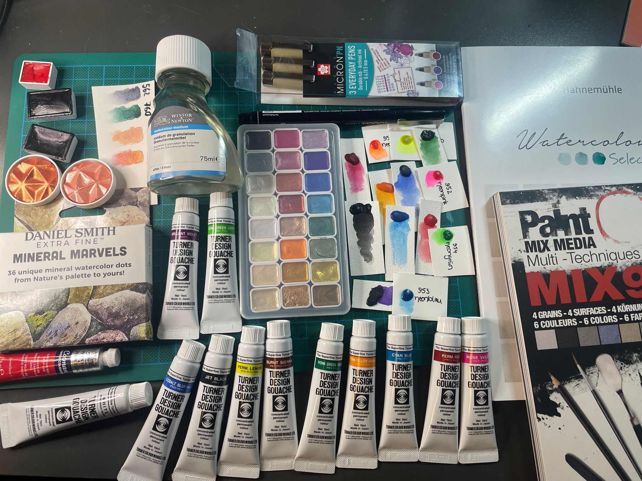 Heh, ich habe somit ausschließlich granulierende und größtenteils ziemlich deckende Farben zur Verfügung, mal was ganz anderes - ich werde also gezwungen, meine Comfort Zone zu verlassen. Da ich aber bislang noch nie ein so granulierendes Gelb und Primärblau hatte (vielen Dank nochmal, @CaitlynMurphy!), wird das definitiv total spannend. (Vom Zirconium Red bin ich übrigens auch schon mal sehr überzeugt, da habe ich bislang nur einen Dot, werde mir aber wohl bei Gelegenheit ein Näpfchen bestellen, das wirkt sehr nützlich für Hauttöne.) Die anderen Farben sehen alle so aus wie erwartet, und ich freu mich drauf. :3