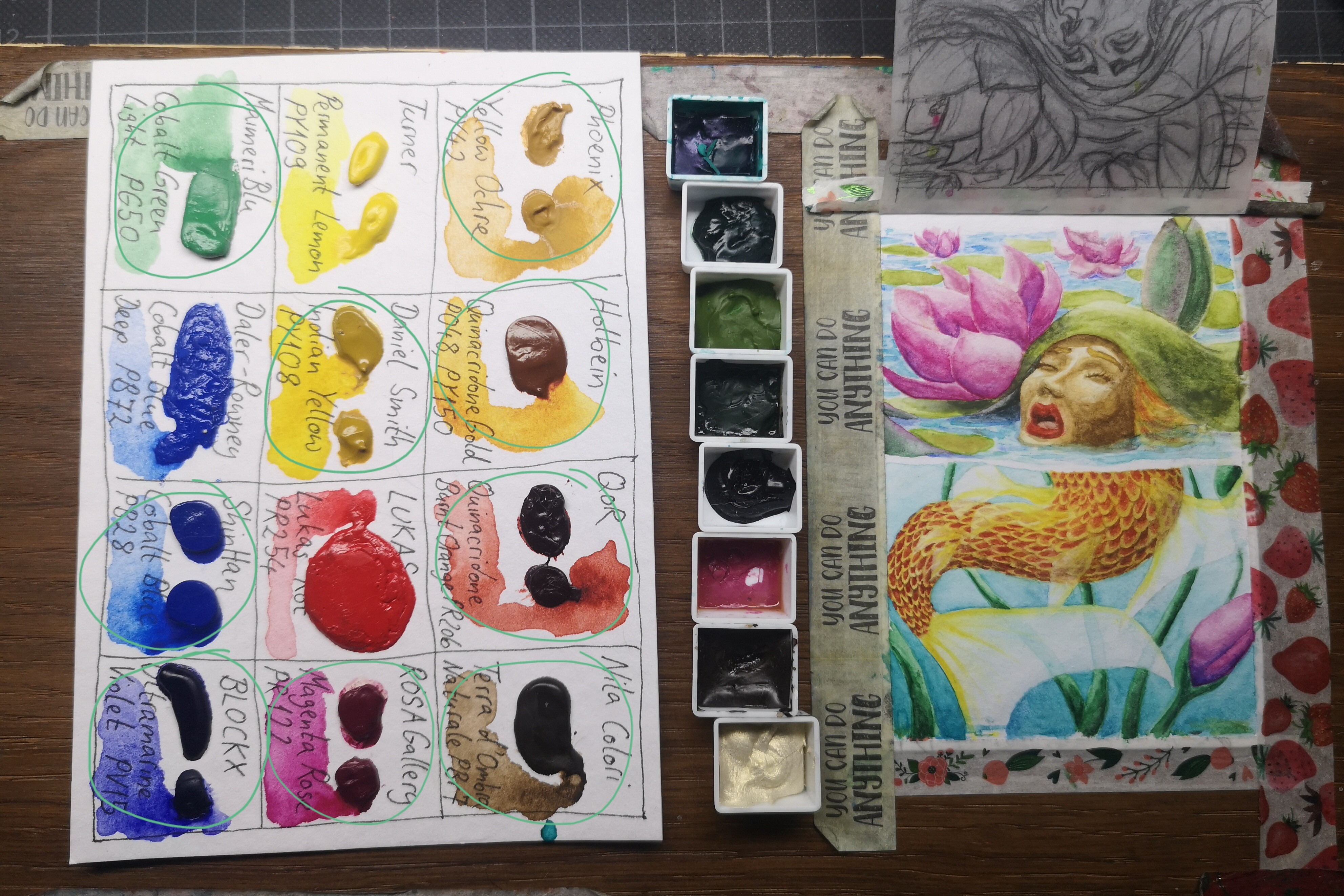 Ich hab Tage auch mal die Farben weitmöglichst aus Tuben in Näpfchen gedrückt und dann etwas gebrainstormt. Ich hab jetzt drei grobe Skizzen und hoffe, dass ich zumindest zwei davon umgesetzt bekomme (Foto folgt), weil ich dann übernächste Woche komplett bei meinen Eltern bin.