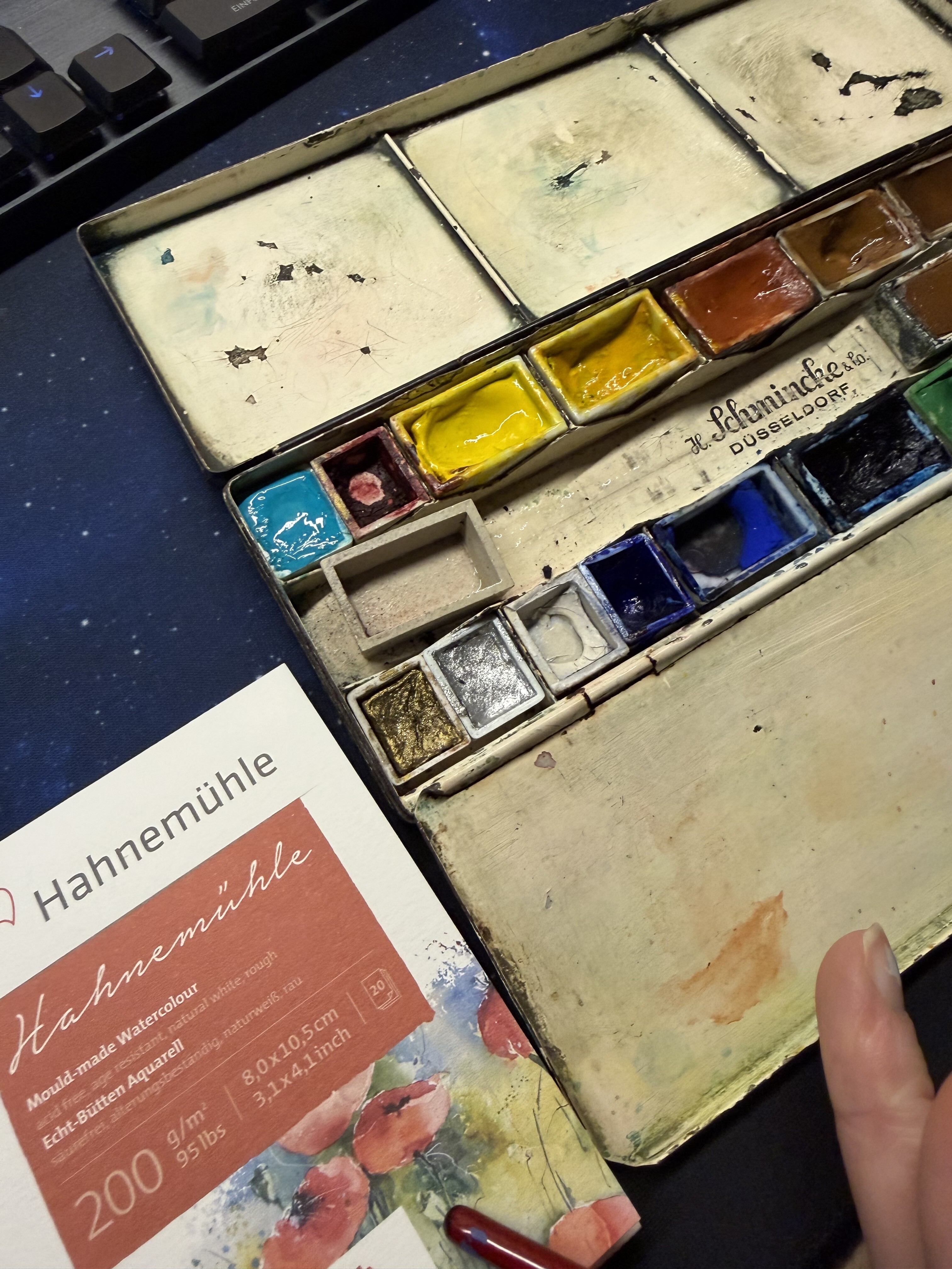 Ich dachte bevor ich ein permanent zuckendes Auge bekomme, switche ich zu meinem normalen Papier, weil zwei Versuche für die Karte reichen mit. Also gemalt mit meinem neuen Schminke Aquarellekaste auf Bamboo Aquarellpapier von Clairefontaine: