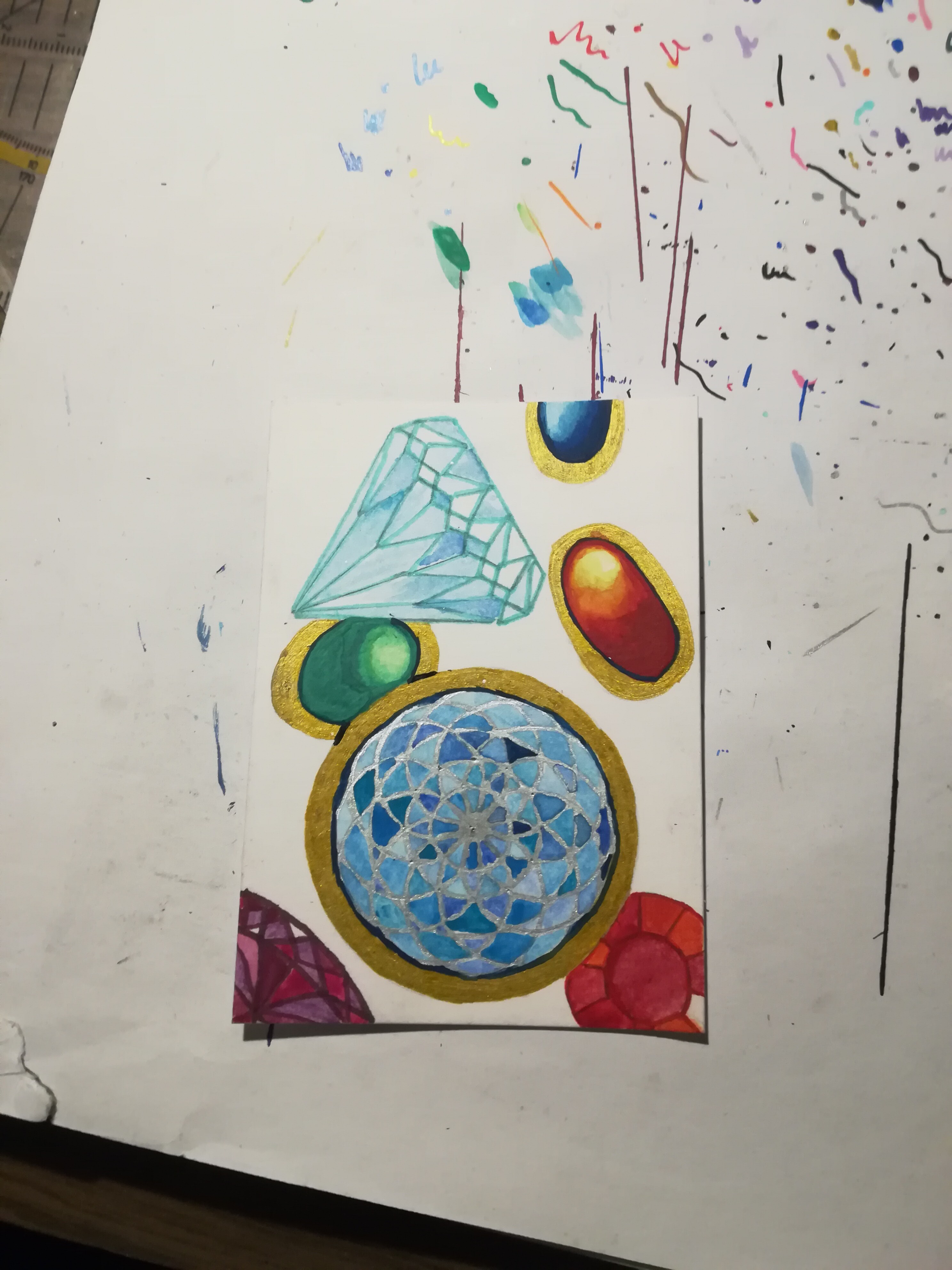 wenn so etwas ok ist, würde dies meine zweite oder dritte Karten werden. Bis auf die Goldfassung und die Lines, alles mit Schulfarbmalkasten fabriziert. Aber ich bin mir bezüglich des Hintergrunds nicht sicher und die Goldeinfassungen sehen auch noch recht langweilig aus.