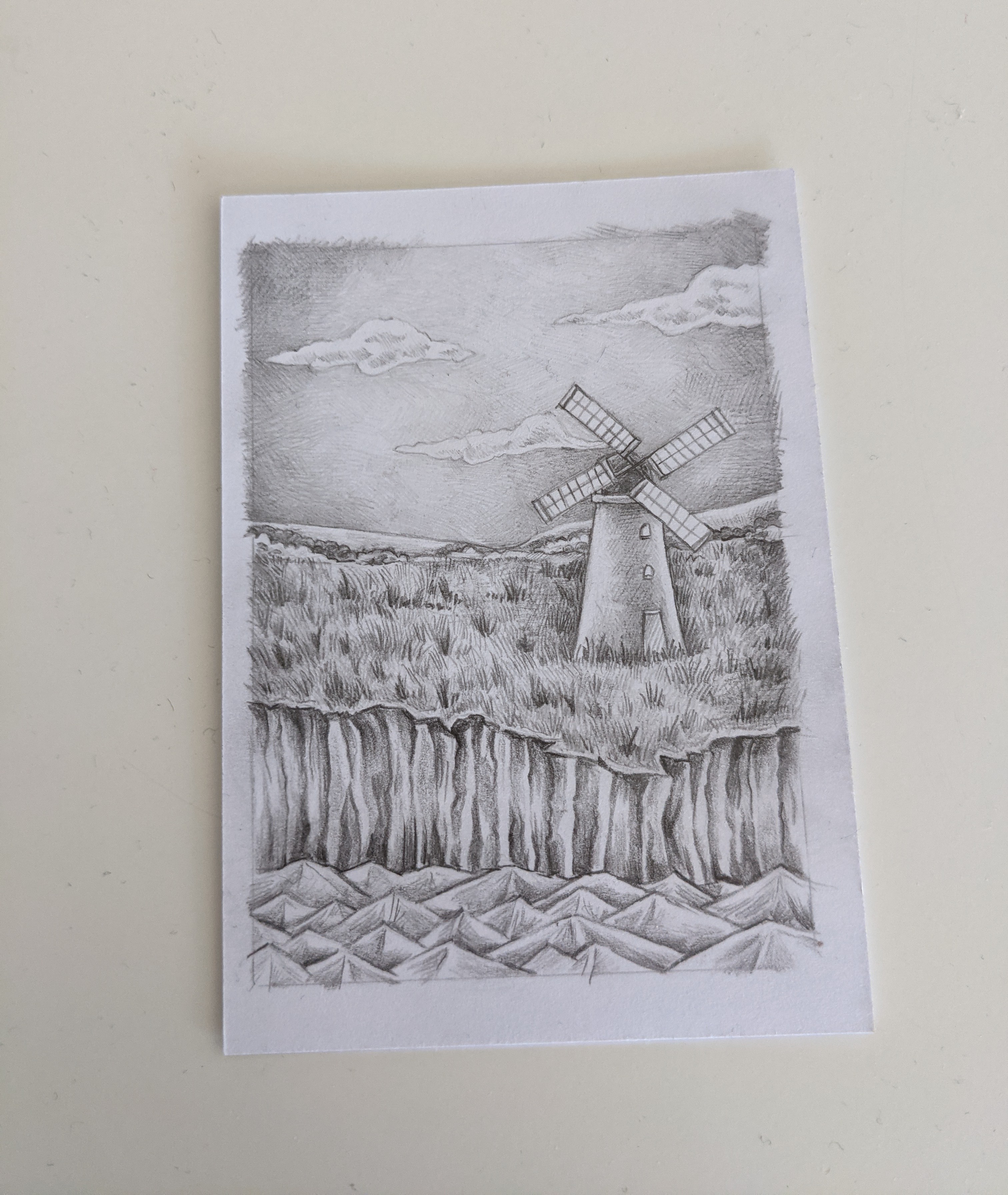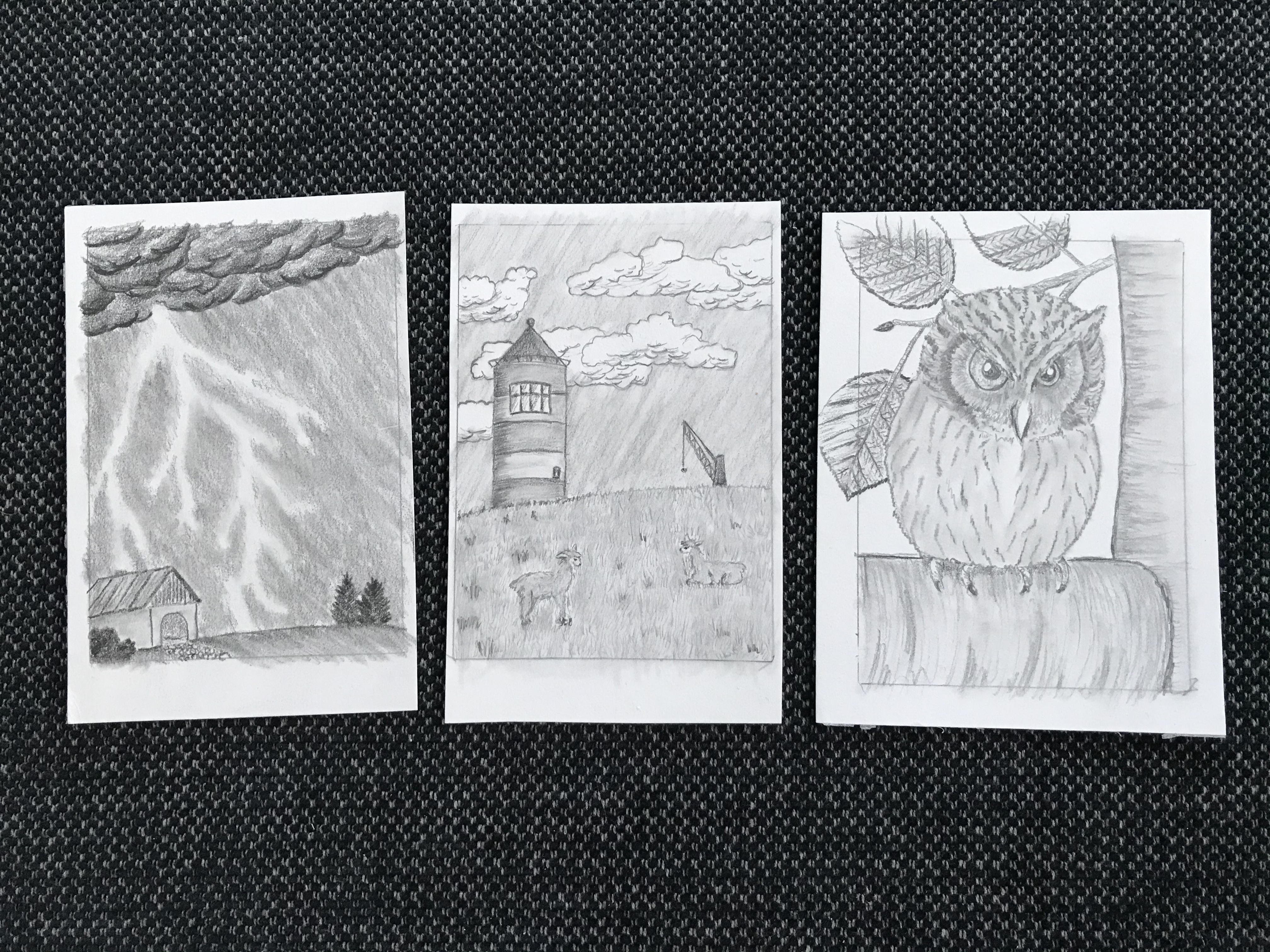 Leuchtturm: Hier gehen die Schafe leider etwas unter. Vielleicht könnte man das Gras etwas dunkler und die Schafe heller darstellen, dann könnte man sie auch besser vom Gras unterscheiden. Und soll der Himmel Regen darstellen? Für einen klaren, “blauen” Himmel wäre er mir etwas zu strichig. Hier könntest du den Bleistift noch etwas verwischen, um den Himmel weicher zu bekommen.