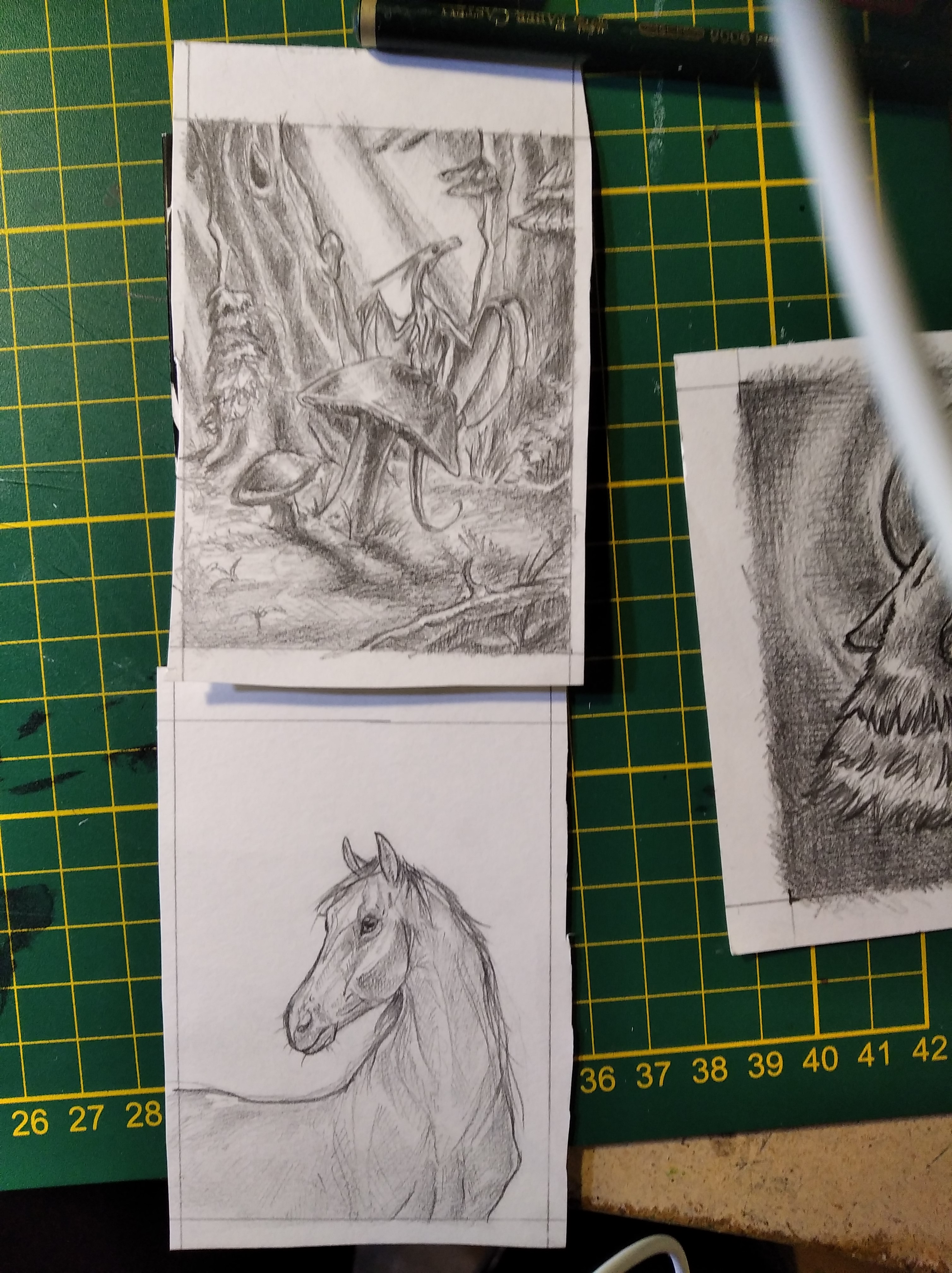 Vier Tage vor Anmeldeschluss wuerd ich auch gern noch reingeschneit kommen. ^^’ Haette hier eine potenziell erste fertige Karte und den Anfang einer zweiten. Hab festgestellt, dass ich viele Grafitstifte besitze, aber meine Bleistiftauswahl in unterschiedlichen Staerken ist mager. Die beiden Karten hier sind komplett mit 2B Faber Castell Steno-Bleistift entstanden.