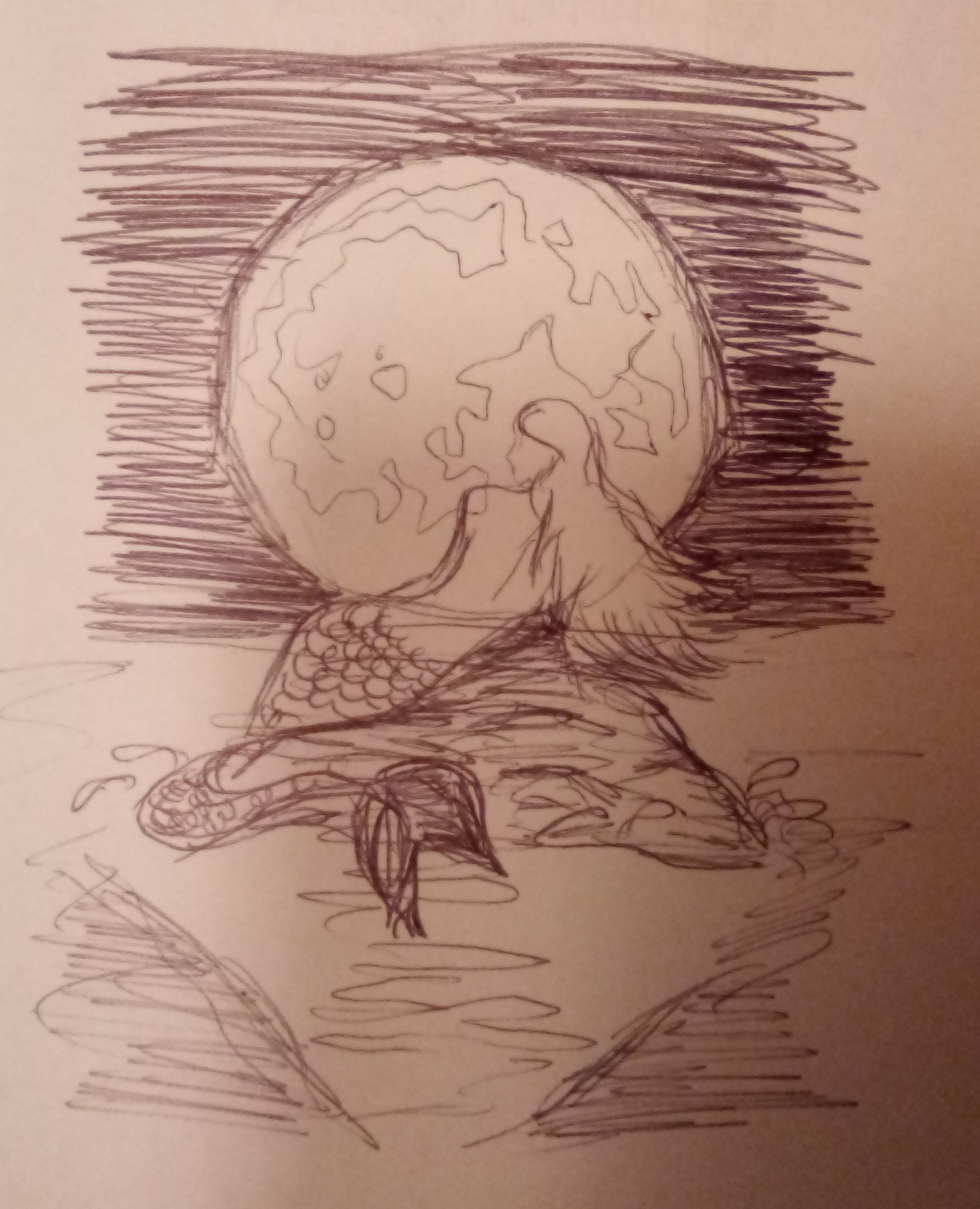 Ich hatte eben noch eine Idee und hab sie mit Kulli skizziert. Eine Meerjungfrau vor dem großen hellen Mond mit schwarzem Himmel und dunkel blauem Meer mit dem Mondlicht, was auf dem Wasser schimmert. Wäre das was?