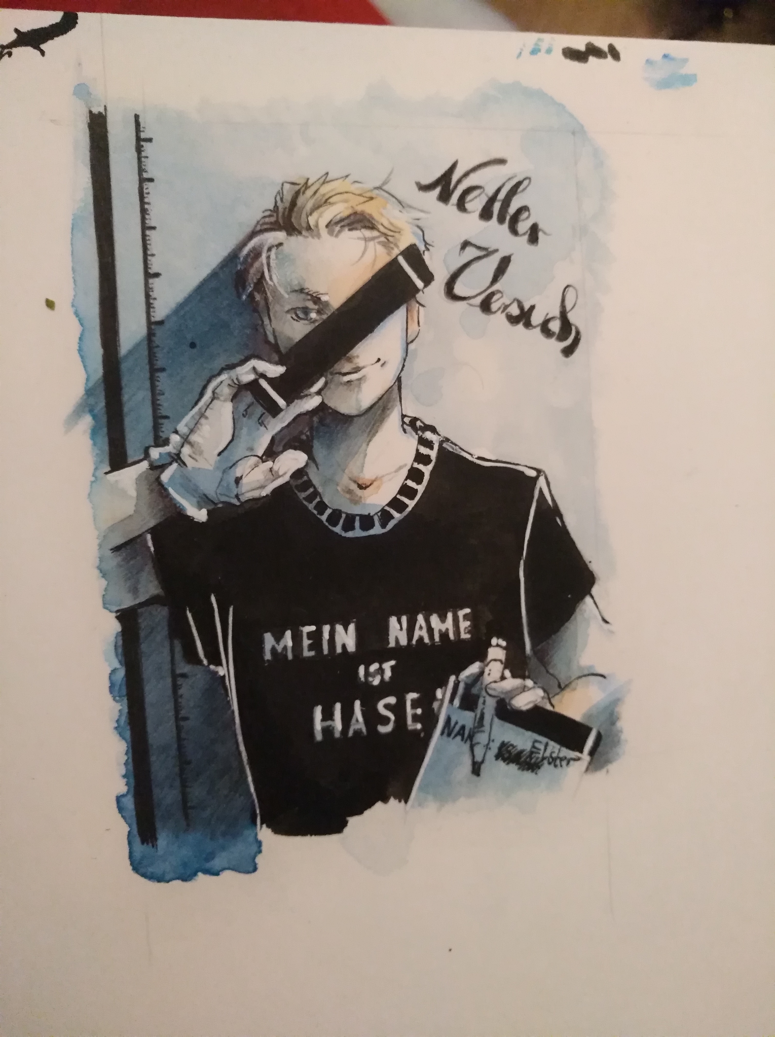 Nummer 2 hat ein komplett schwarzes T-Shirt und Teil des Schildes vom Mugshot vor den Augen (er und der sani sind OC von mir, würde das stören?)