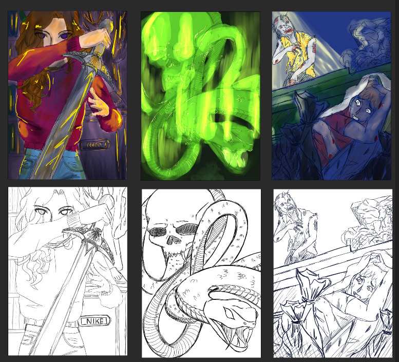 Sehr coole Skizzen, die im Grunde auch so passen! Bei der zweiten Karte wäre es vielleicht eine Überlegung wert das Dunkle Mal etwas kleiner zu machen und unten noch ein bisschen was von der Umgebung anzudeuten (zerstörte Zelte, ein paar Silhouetten von Personen etc.) c: