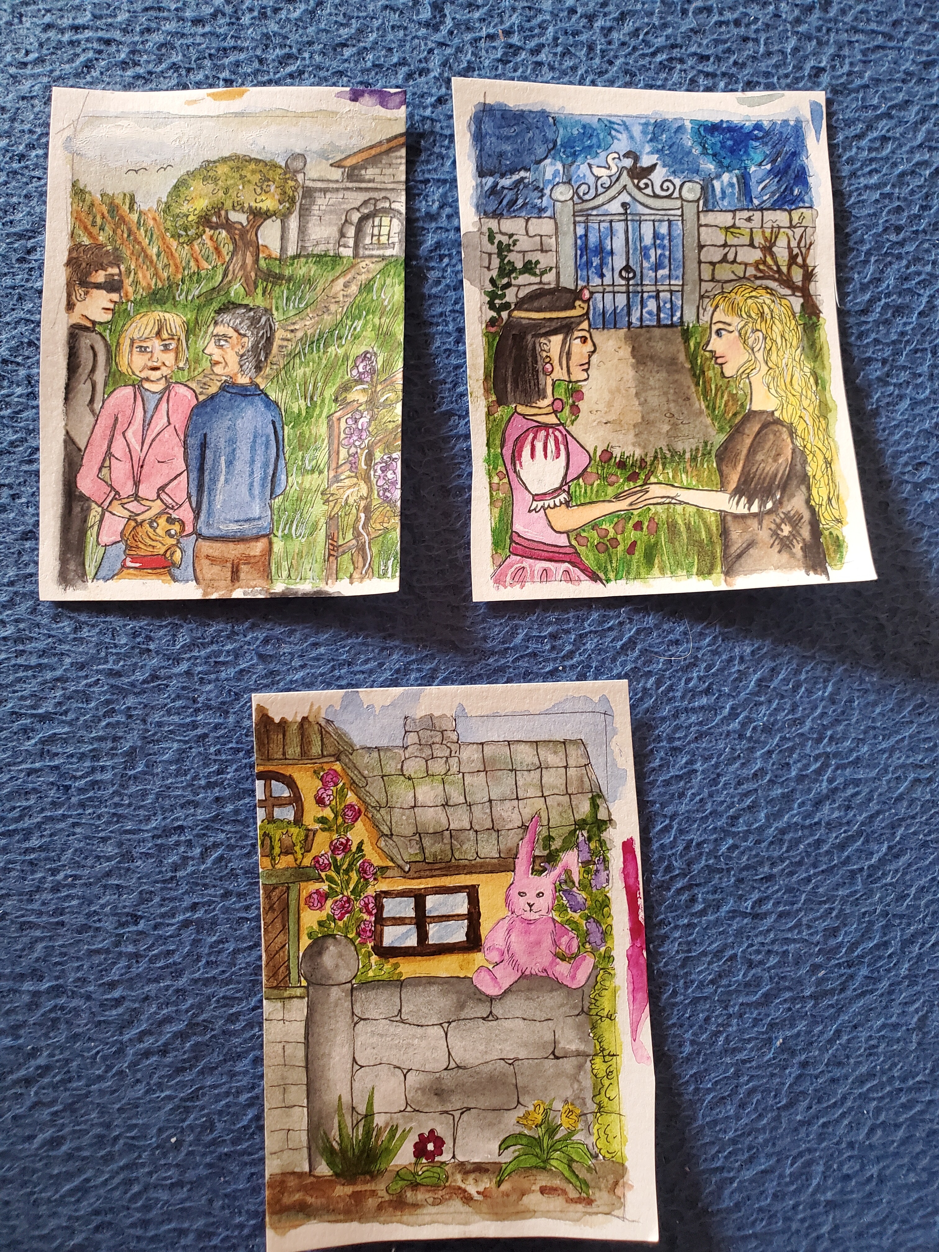 Zwei Karten hätte ich fertig. Bei “Miss Merkel” habe ich mich oben in der leeren Ecke für einen Weinberg entschieden. Karte unten hat erste Farbe, da fehlt noch ein bisschen was, würde ich aber schaffen.